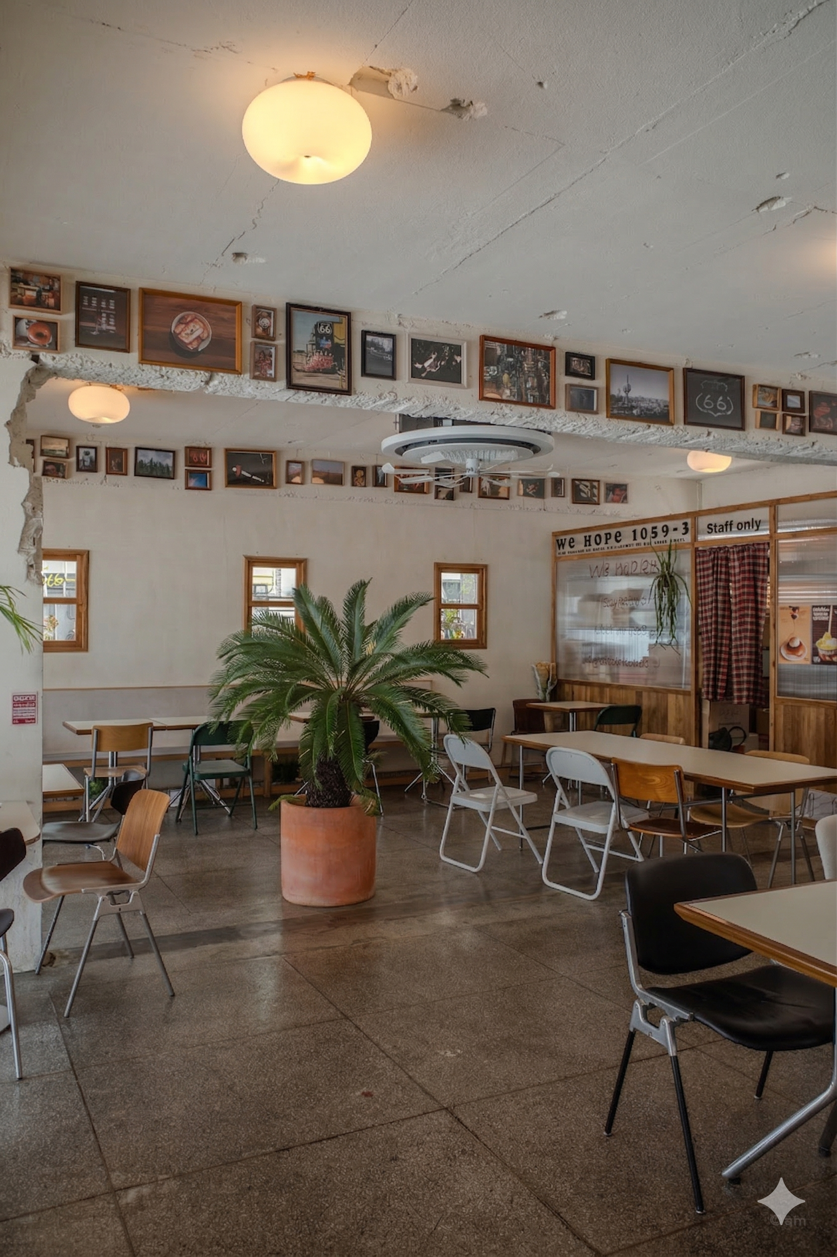 Along every beam, in continuous running rows, framed photographs document a world of American diner culture, road trips, coffee, and bagels. The frames vary in size and finish — some raw wood, some darker wood, some ornate — which gives the installation the feeling of an ongoing project rather than a finished one. A large potted cycad palm presides near the center of the hall, its spiky crown at eye level, its terracotta pot on the bare floor. On the back wall, stenciled in simple block type: We Hope 1059-3 / Bagel & Coffee House.