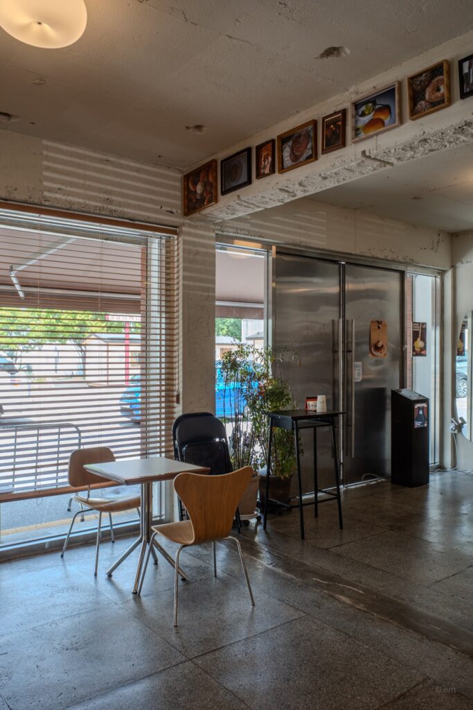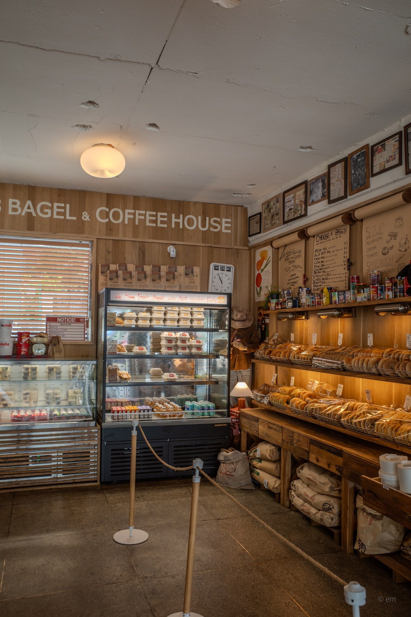 The third zone is closest to the entrance and operates on the logic of a New York deli that got lost in the American heartland. Wooden display shelves hold bagels in rows, sorted by variety: plain, sesame, everything, olive, whole wheat, cranberry walnut, garlic butter, smoked salmon, corn bacon, nutella, jambon beurre. They are baked daily on the premises — the refrigerated case carries the sandwich boxes, stacked in neat rows, each labeled with its filling. The handwritten message across the case reads: We Make Fresh Bagels with Best Ingredients Daily.