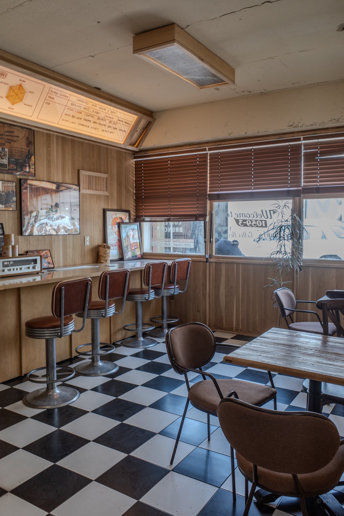 Through a doorframe built from rough, unfinished timber — the kind of wood that looks like it came off a barn or a demolished warehouse — the space shifts entirely. The floor here is black-and-white checkerboard tile, the walls are lined in warm wood paneling, and the light drops a register. The counter runs the length of one wall: a long formica surface behind which a Faema E61 espresso machine sits like a silver anchor, its chrome catching the warmth of the room.
