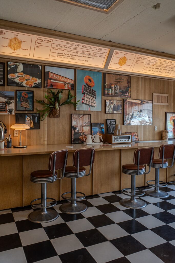 Coffee beans are available for purchase in 200g bags — specialty and decaf both stocked — alongside the café’s branded cups. The espresso machine is not decorative. The foam on the milk is not an afterthought. In a building that signals America at every exterior surface, the coffee program signals something else entirely: a Korean specialty coffee sensibility that arrived here from a different direction and decided the diner counter was a perfectly good place to land.