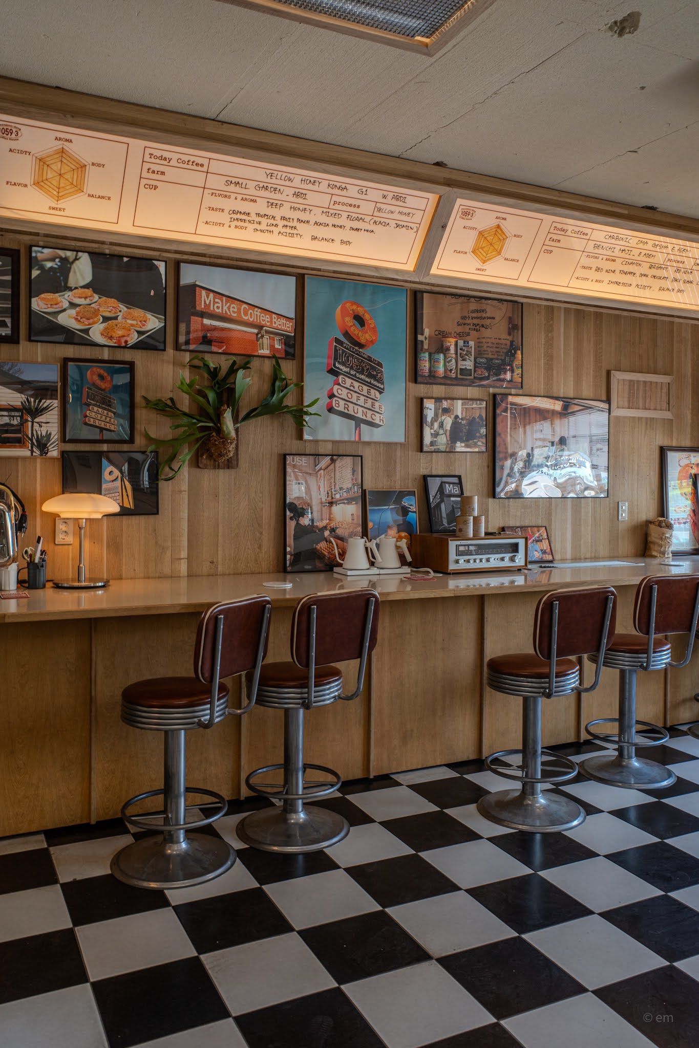 Chrome-and-leather diner stools line the counter. The kind with stacked chrome rings around the base, upholstered in brown-red vinyl, designed to swivel and hold someone sitting through two cups of coffee and a long conversation. Above the counter, the coffee program is explained on illuminated boards in handwritten text: “Today Coffee” with origin, farm name, process, flavor notes, and a hand-drawn flavor-profile spider chart. The detail is serious — the kind of notation you’d find at a specialty roastery in Seoul’s Seongsu-dong or Mapo — transplanted here into the visual language of a 1970s American diner without any apparent sense of contradiction.