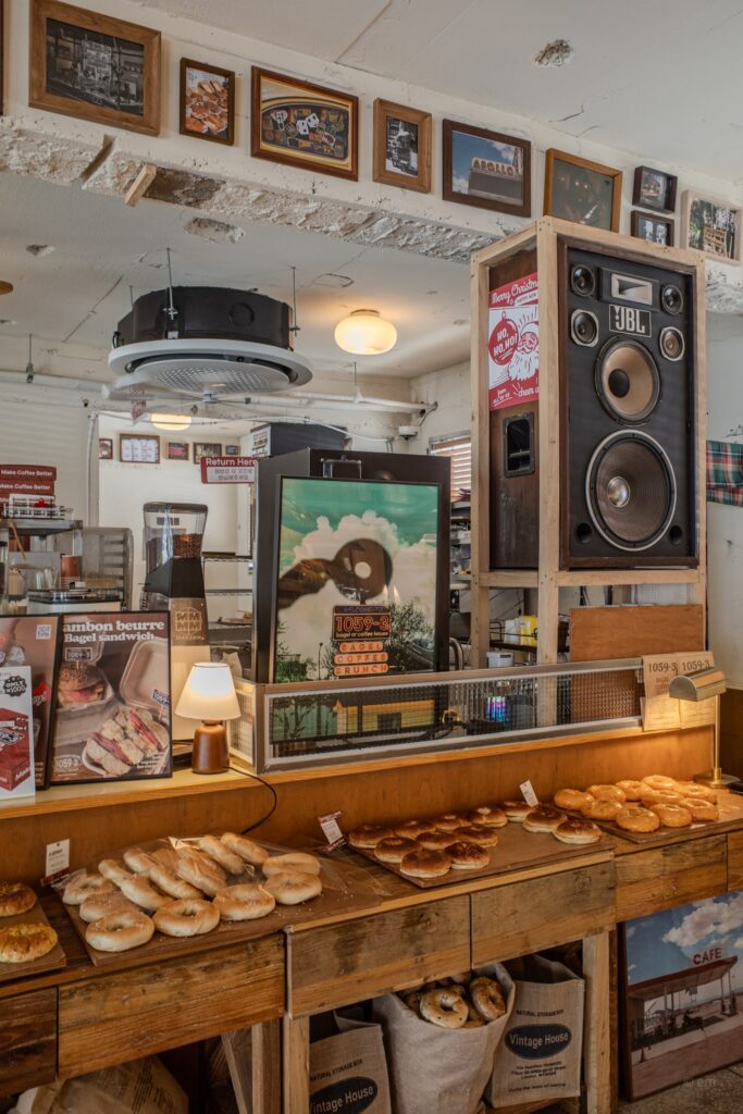 On the counter: a vintage stereo receiver, a small table lamp, white carafes, ceramic cups. Behind it, the gallery wall fills in around the machine — photographs of the café’s own exterior signage, food shots, a black-and-white portrait, a poster of the bagel sign catching golden-hour light. It is a room that has been building toward itself for years, adding and adjusting, until the weight of it feels settled.