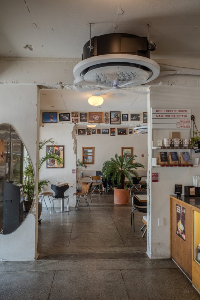 The name gives nothing away until it gives everything away. 1059-3 is the land address of the building on Seokwonro 166beon-gil — Gwonseon-dong 1059-3 — which means the café named itself after where it stands. Not after a feeling, not after a concept, not after a person. After a cadastral number on a government map of a mid-sized city in Gyeonggi-do.