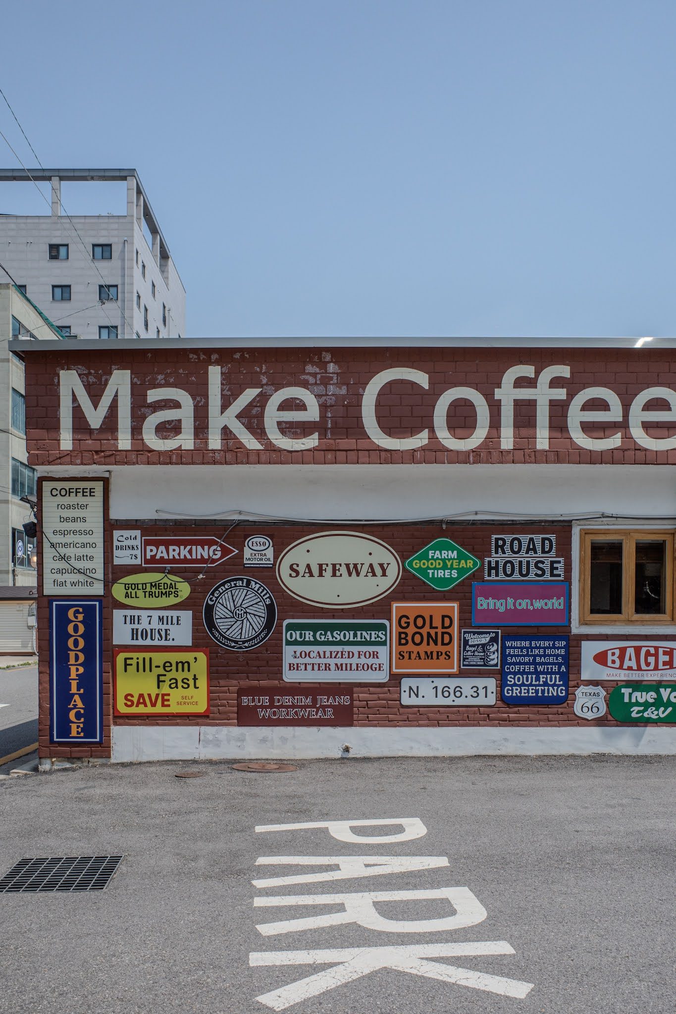 The side wall is where the Americana fully arrives. Vintage enamel signs — Safeway, Esso, Goodyear, General Mills, Route 66 Texas 66, Gold Bond Stamps, a dozen others — are mounted directly to the brick in the casual density of a roadside building that has been accumulating signage for forty years. Fill-em Fast. Our Gasolines. Road House. The signs reference a commercial landscape that has largely disappeared in the country that produced it, and here they exist as pure composition, a wall of American vernacular graphic design installed in a Suwon parking lot with complete conviction.