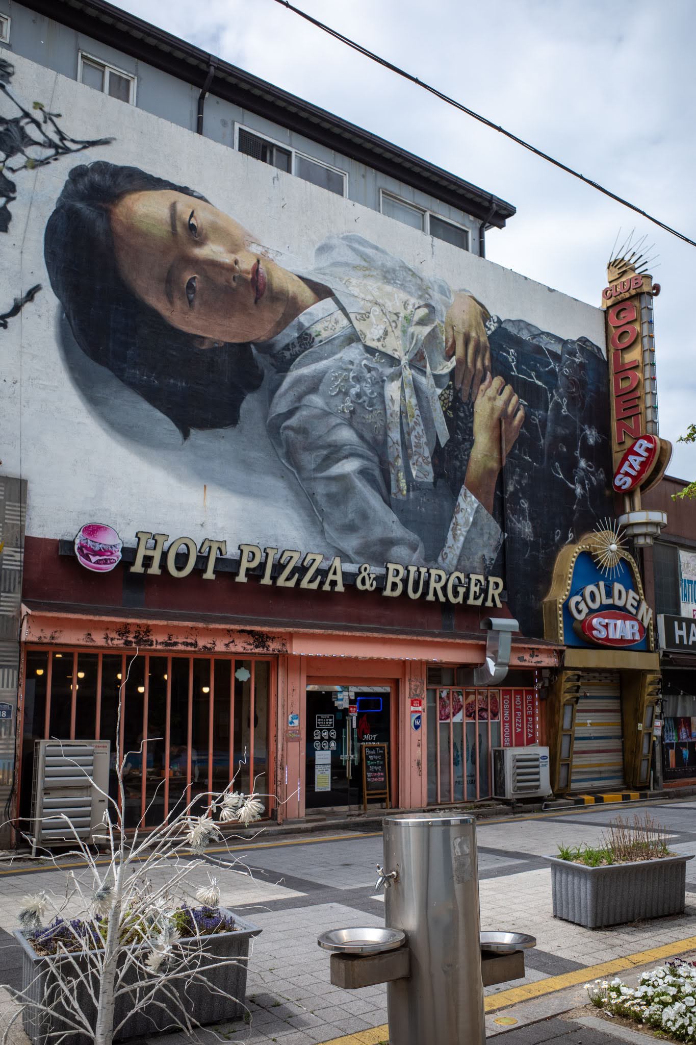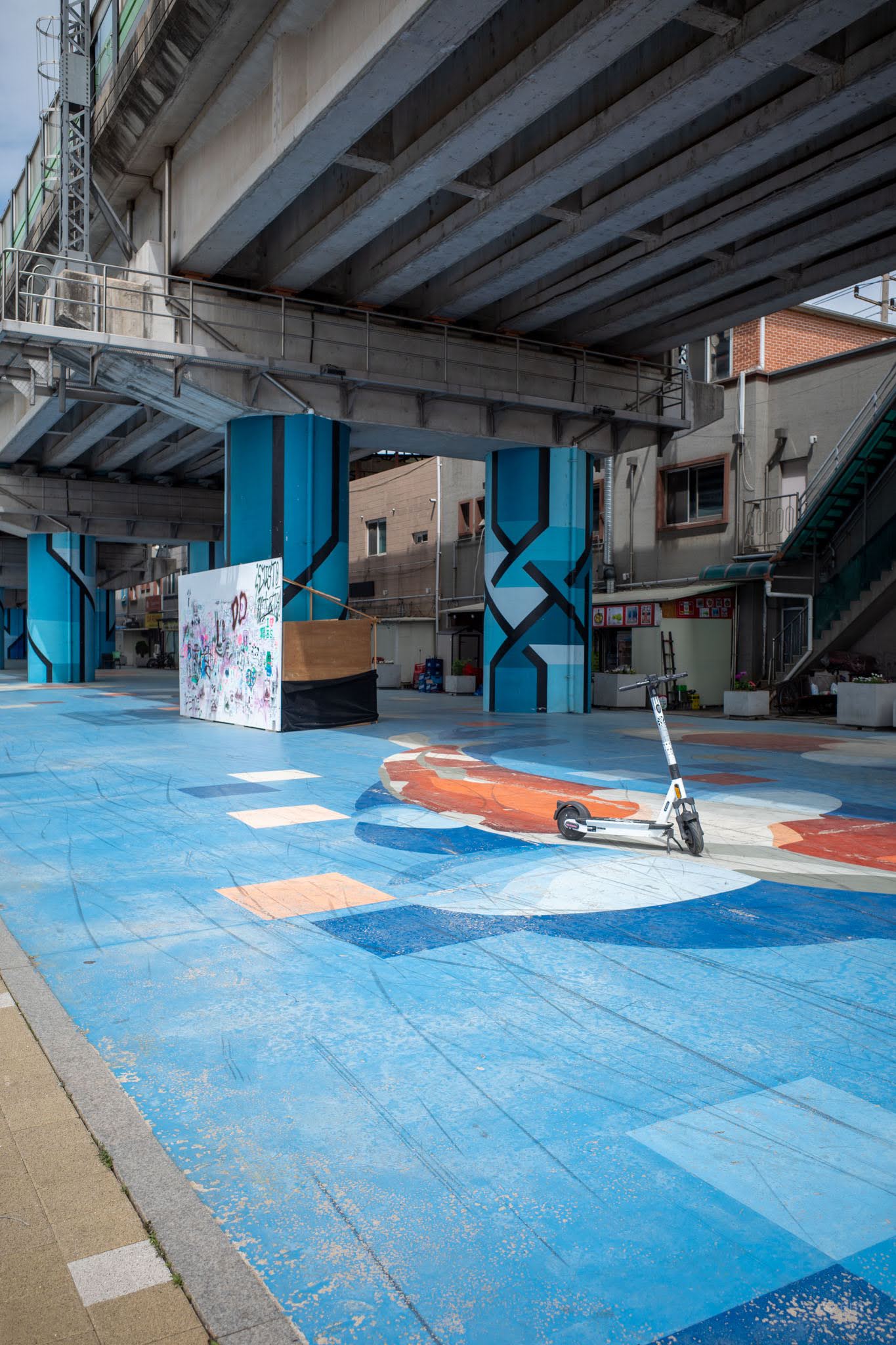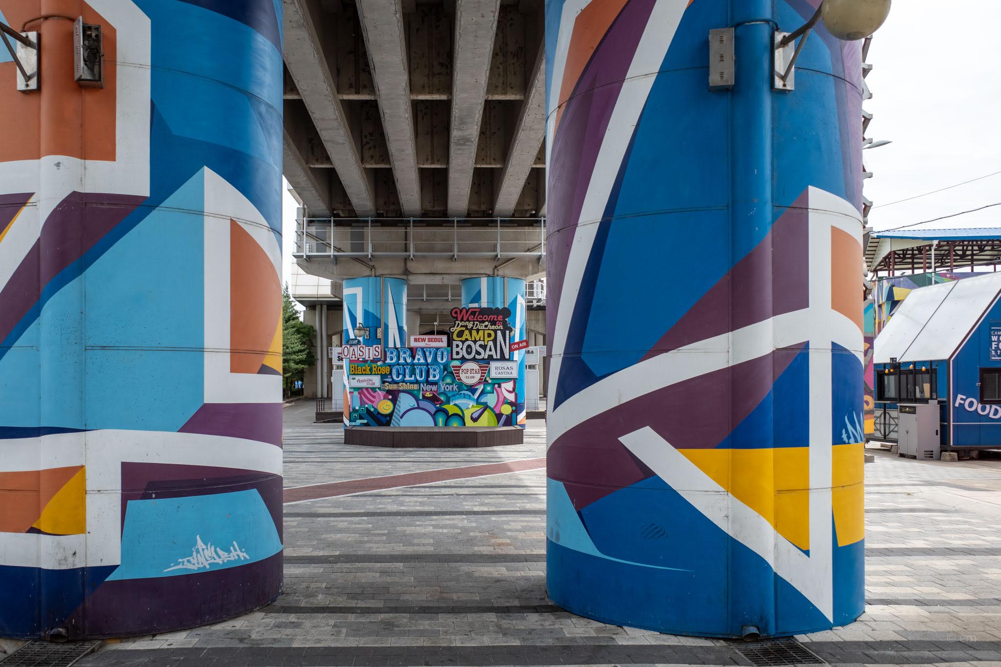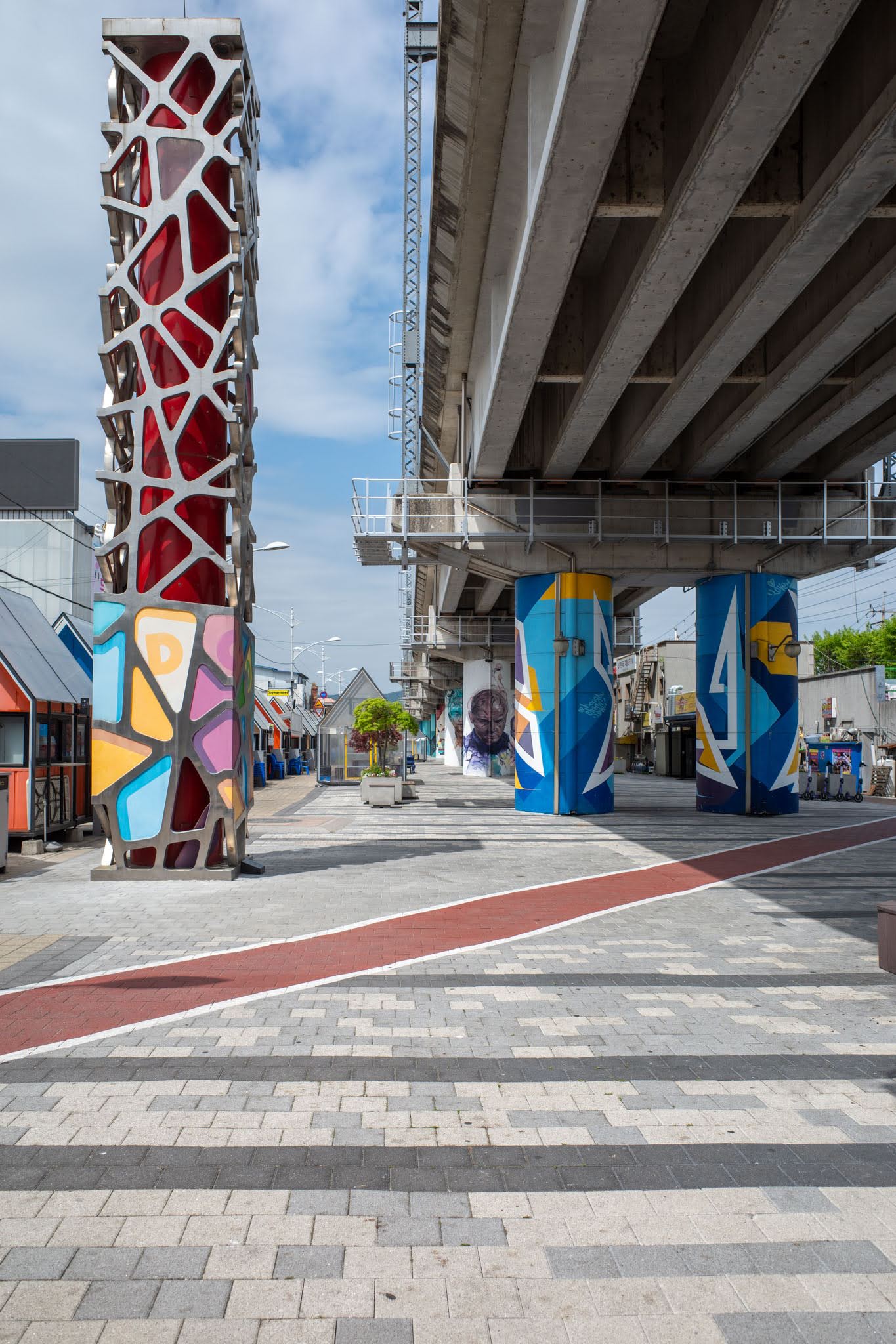 The city’s response was to try to make the neighborhood’s strangeness into an asset. The area was designated as a Foreign Tourist Zone in 1997, and in recent years the name “Camp” has been reframed to stand for “Culture & Art Market Place.” A public art project run by the Gyeonggi Cultural Foundation between 2015 and 2019 brought in street artists from Italy, Russia, Thailand, Denmark, and elsewhere, transforming the elevated subway pillars that bisect the neighborhood into large-scale painted canvases. The result is a pedestrian corridor under a concrete overpass that’s become, somewhat unexpectedly, the most visually striking part of the whole area.