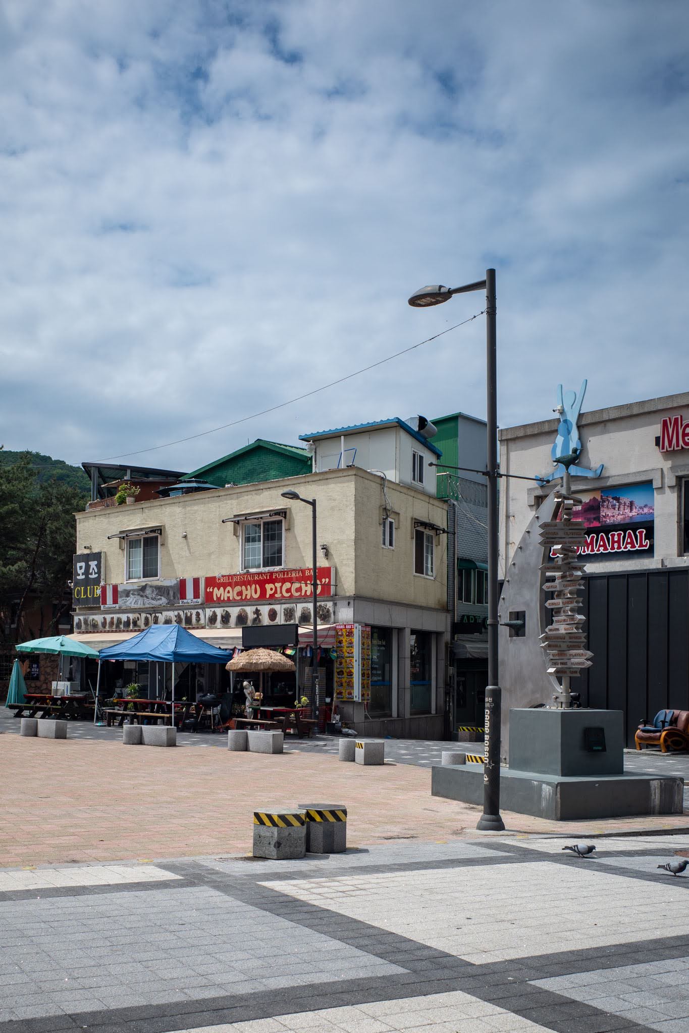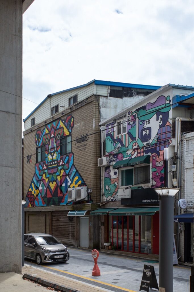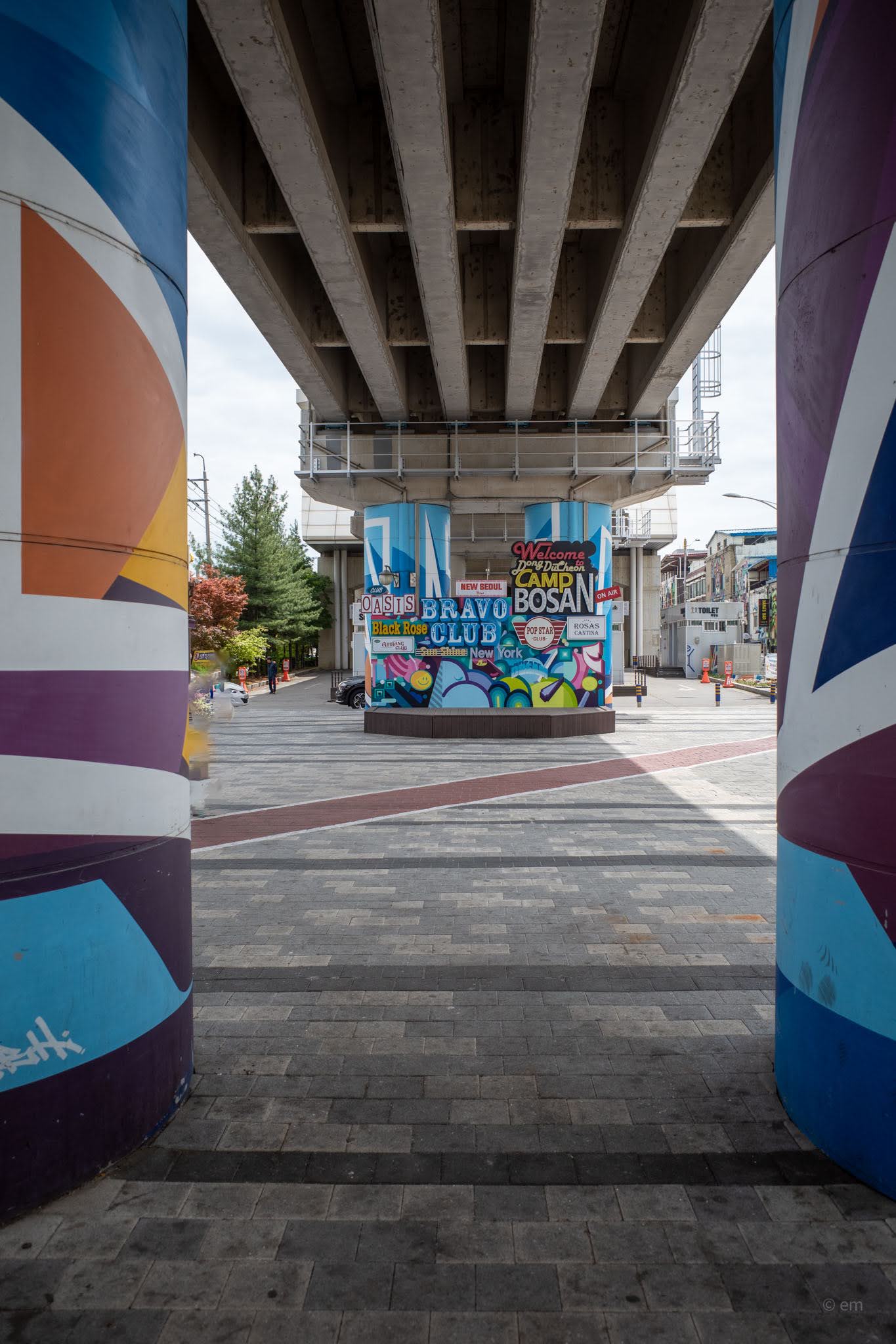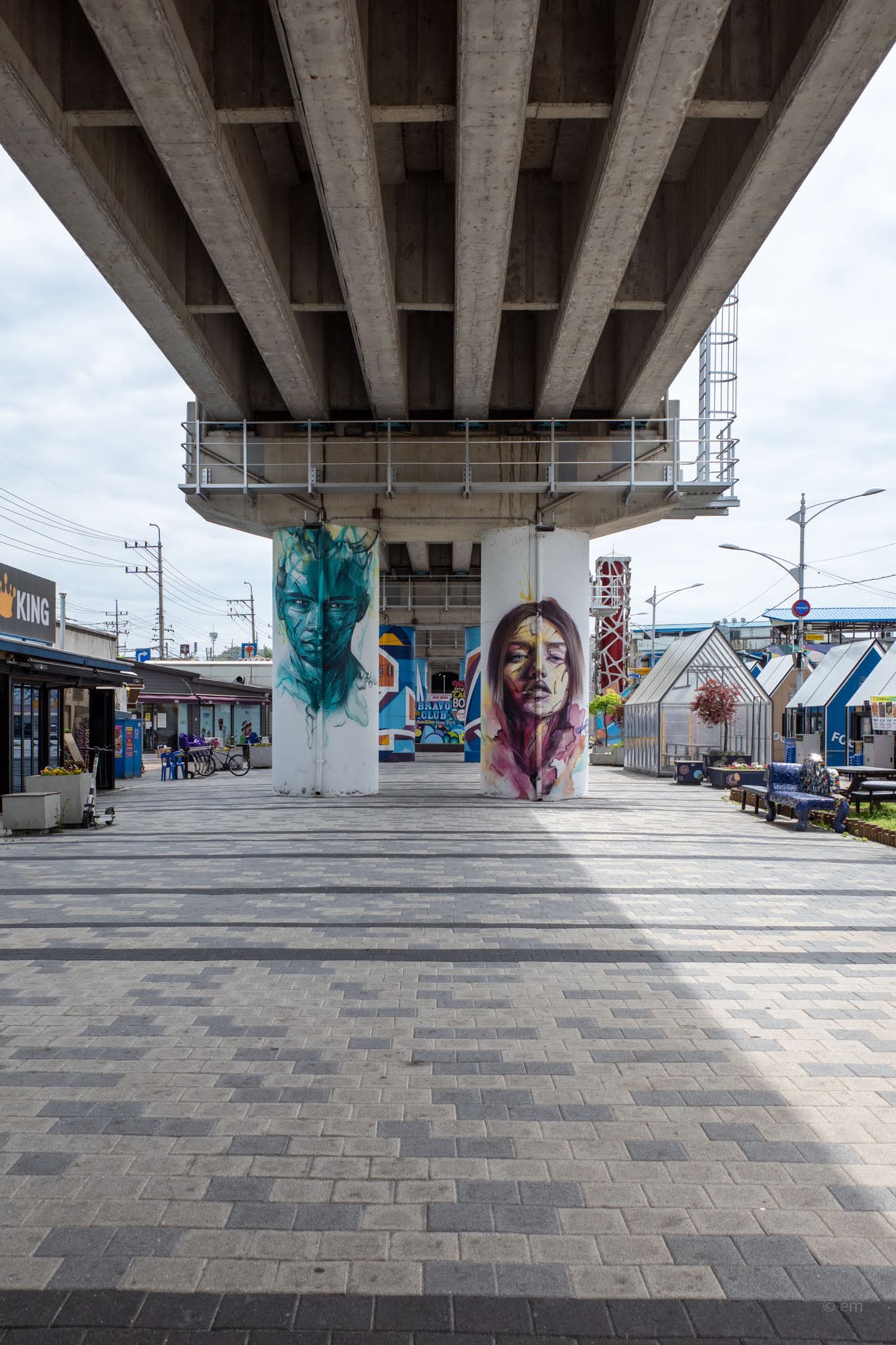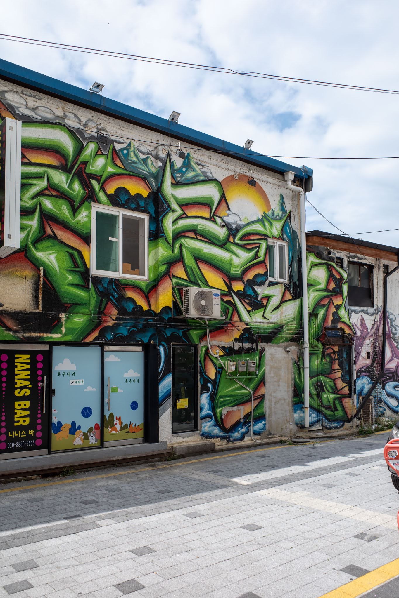 The city’s response was to try to make the neighborhood’s strangeness into an asset. The area was designated as a Foreign Tourist Zone in 1997, and in recent years the name “Camp” has been reframed to stand for “Culture & Art Market Place.” A public art project run by the Gyeonggi Cultural Foundation between 2015 and 2019 brought in street artists from Italy, Russia, Thailand, Denmark, and elsewhere, transforming the elevated subway pillars that bisect the neighborhood into large-scale painted canvases. The result is a pedestrian corridor under a concrete overpass that’s become, somewhat unexpectedly, the most visually striking part of the whole area.