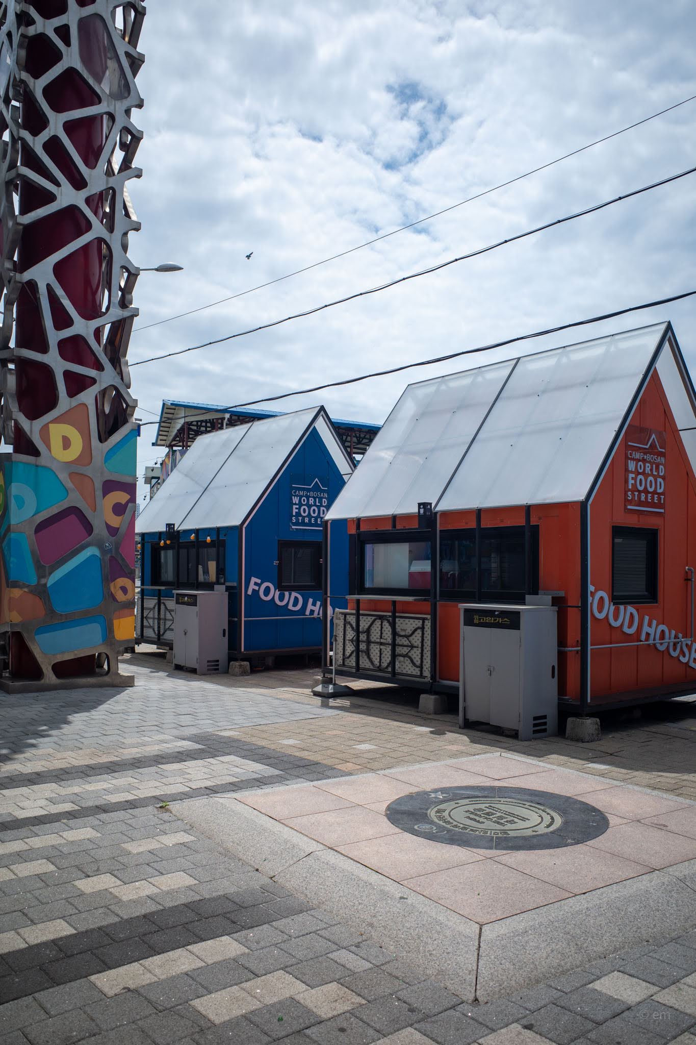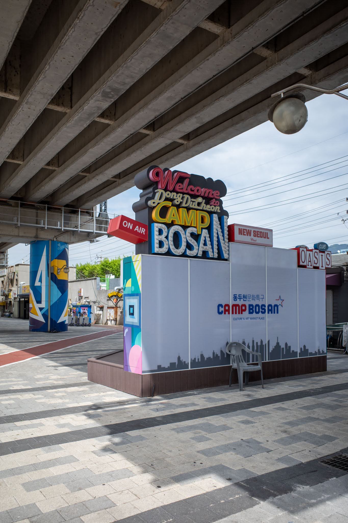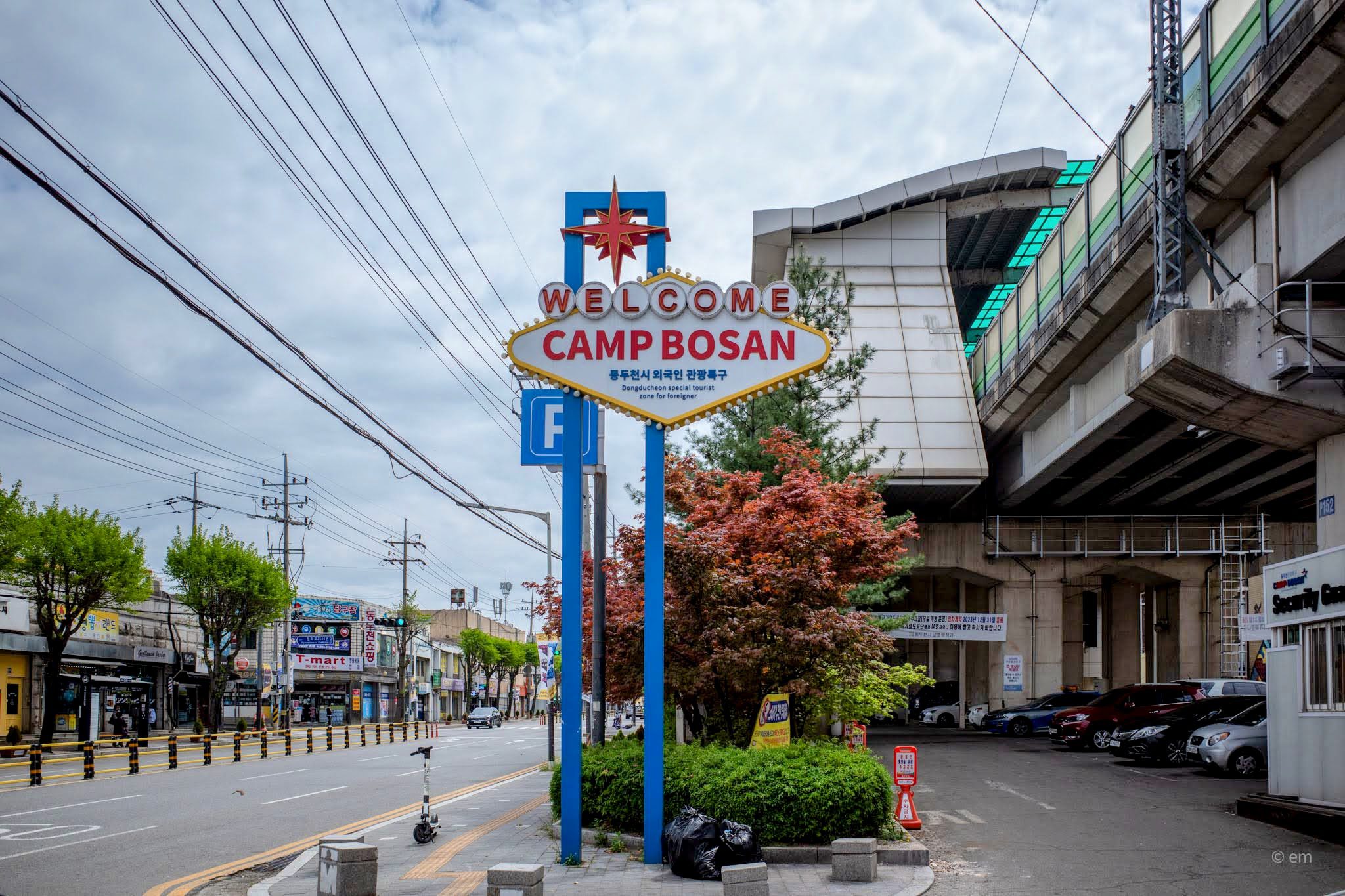 On a quiet weekday, Camp Bosan reads as a place between versions of itself. The Vegas-style “Welcome Camp Bosan” sign — complete with starburst and marquee bulbs, mounted on electric-blue poles — greets you at the street corner near the station, a bit of Las Vegas iconography planted in a Gyeonggi-do intersection. It’s slightly absurd and completely sincere.