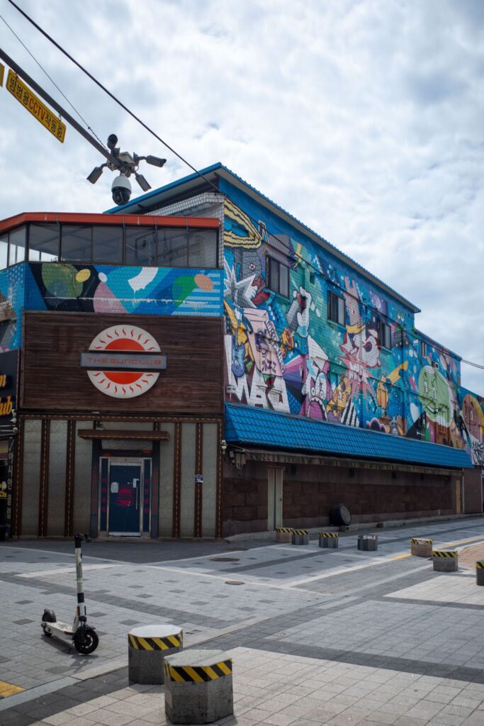 Underneath the elevated subway line, the pillars carry enormous painted faces and abstract geometric forms. The central plaza holds a freestanding sign kiosk whose four sides reference the neighborhood’s old club names — Oasis, Bravo Club, Black Rose, New Seoul — rendered now as pop-art typography, a kind of monument to its own gone nightlife. Along the main pedestrian strip, the shops are a mix of the legacy and the new: English-language barbershops advertising military-style fades, international restaurants, a smattering of cafés, and buildings whose upper floors carry murals ranging from hyperrealistic portraiture to cartoon character assemblages. A Peruvian grill called Machu Picchu sits beside a cluster of open-air food stalls. Everything-style murals compete with everything-style signage, and the overall effect is one of genuine visual density.