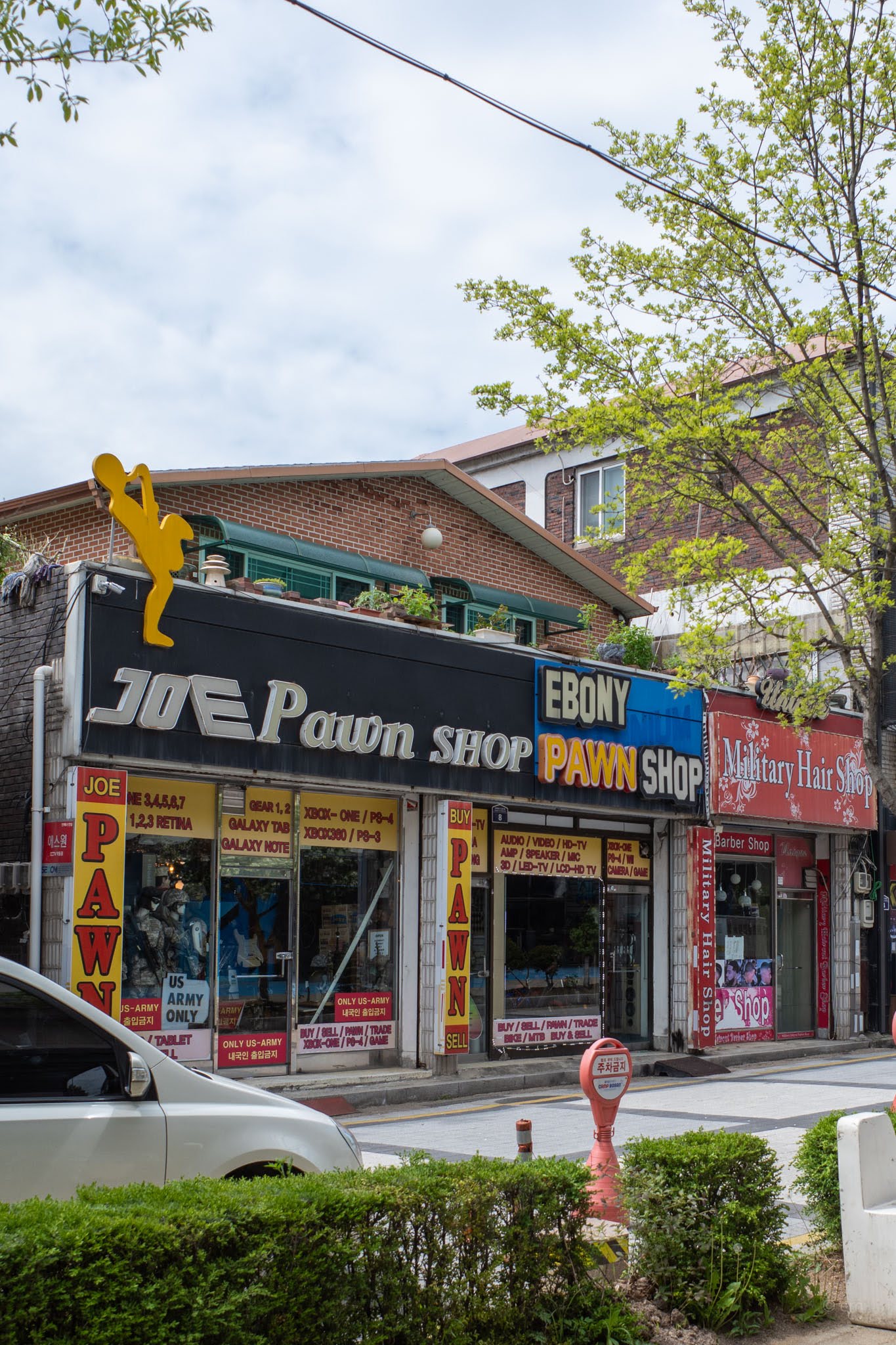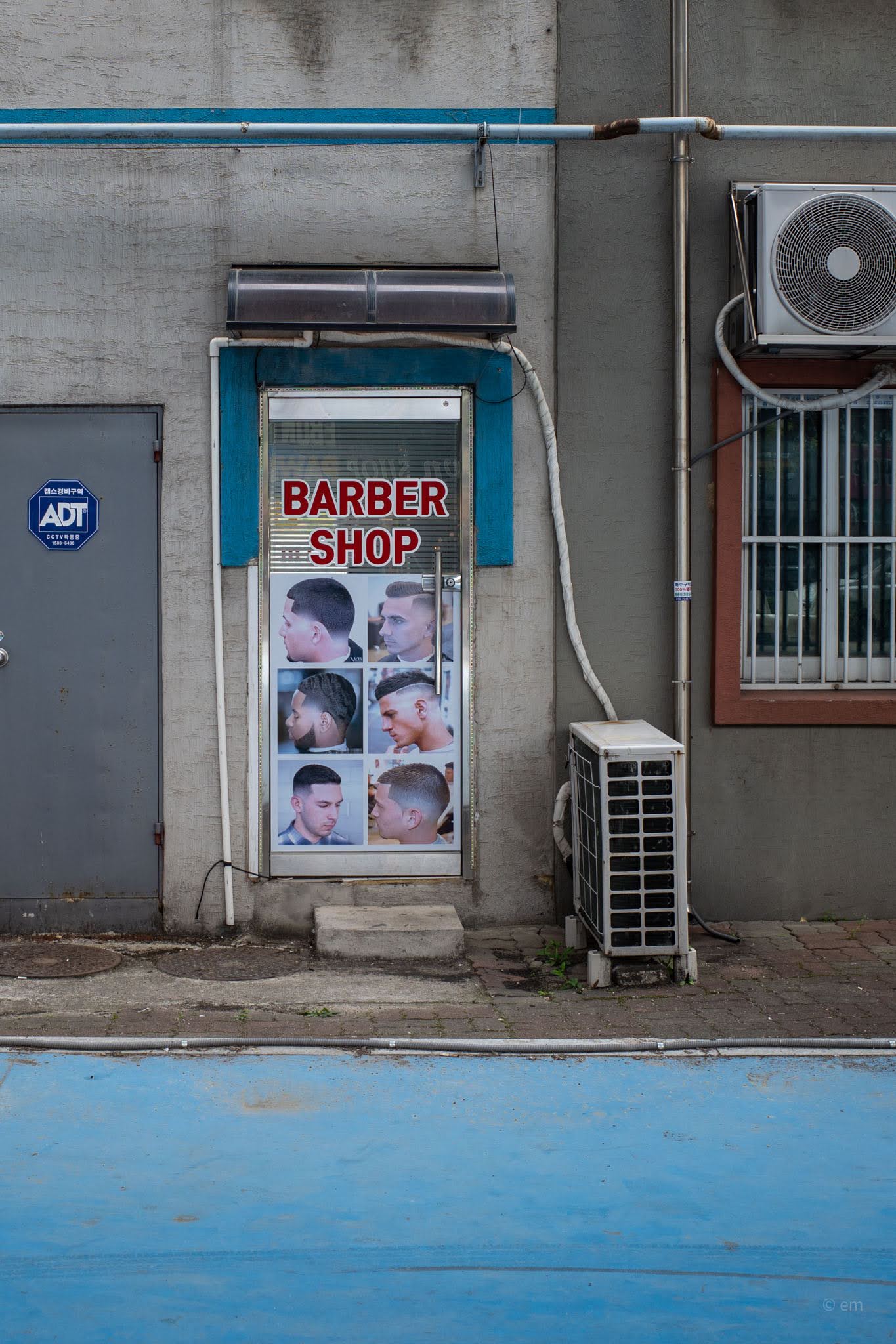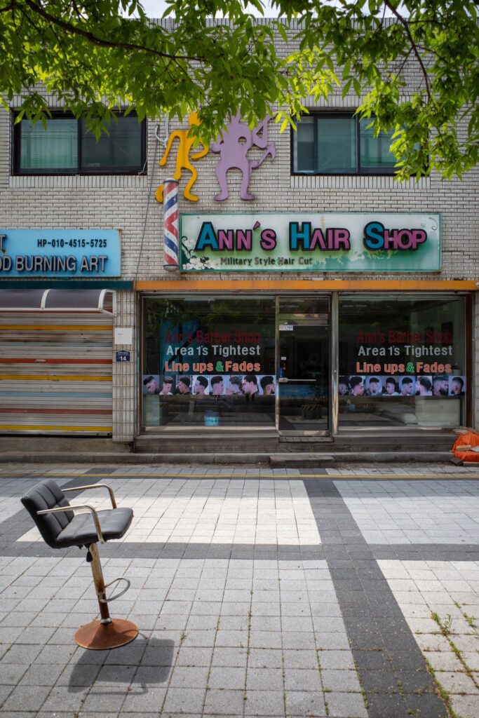 Without the stop signs in Korean letters, both the time period and space would be difficult to distinguish. That’s the point, and also the residue. Bosan-dong has always been a projection of American culture as filtered through Korean eyes and Korean circumstances. The old clubs are mostly shuttered or down to skeleton operations. The Golden Star sign still hangs on the corner building. A barber chair sits out on the sidewalk in front of a military fade shop. Certain things persist because they still have customers. Others persist because no one has gotten around to taking them down.