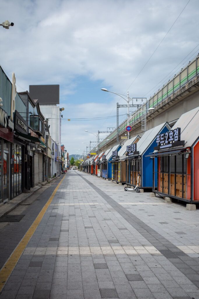 Camp Bosan is a ten-minute walk from Bosan Station on Seoul Subway Line 1 — roughly an hour from Seoul Station, or about thirty minutes from Uijeongbu. The neighborhood runs parallel to the elevated rail line and extends into a few side streets that reward wandering. Most food options open in the late afternoon; the strip is quieter in the morning. There’s no single “attraction” to aim for — the visit is the walk itself.
