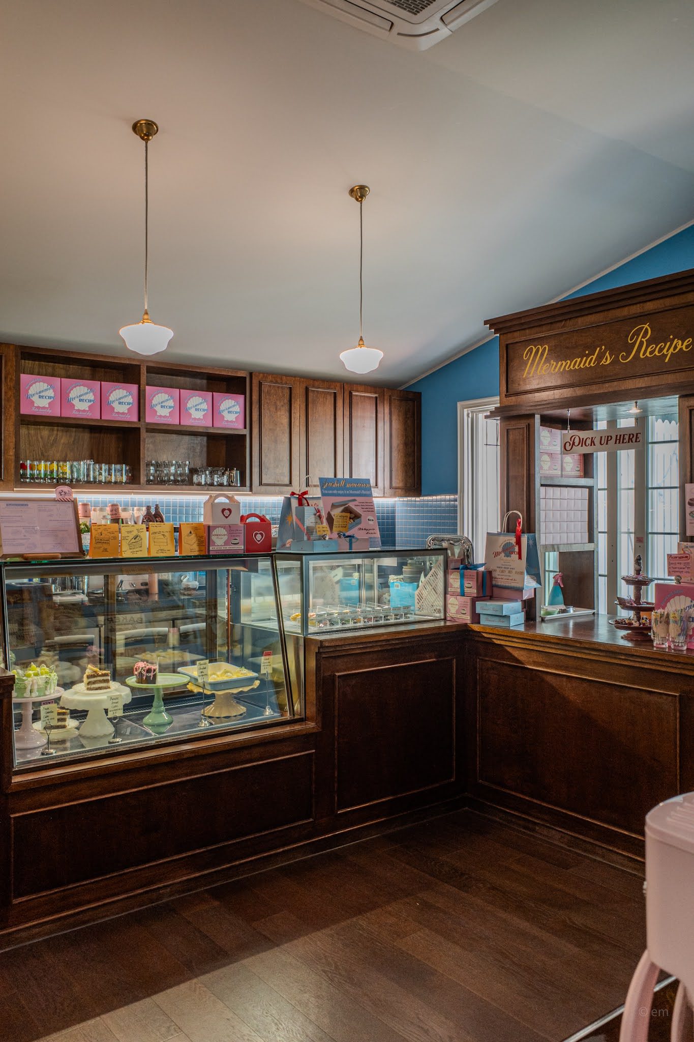 The entrance brings you straight to the ordering area — a handsome dark wood counter under the Mermaid’s Recipe sign, with a “Pick Up Here” window opening onto the garden. Pink gift boxes are stacked on the counter. A small chocolate fountain sits beside a cake stand. It has the unhurried feel of a neighborhood bakery that’s been there forever.