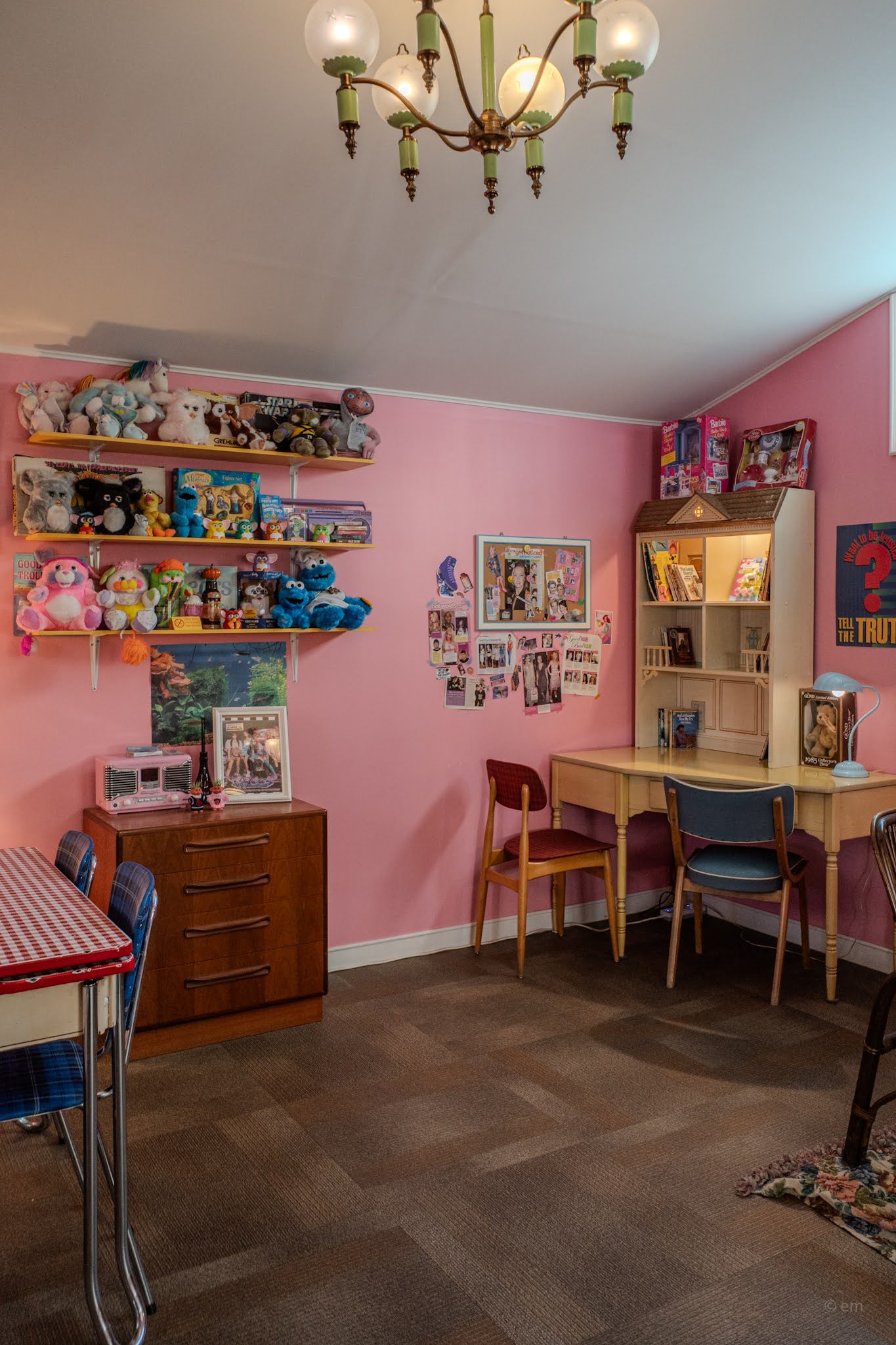 - The teen rooms upstairs have slanted ceilings that make wide shots interesting — the ceiling posters in the 90s bedroom work especially well shot from a low angle.