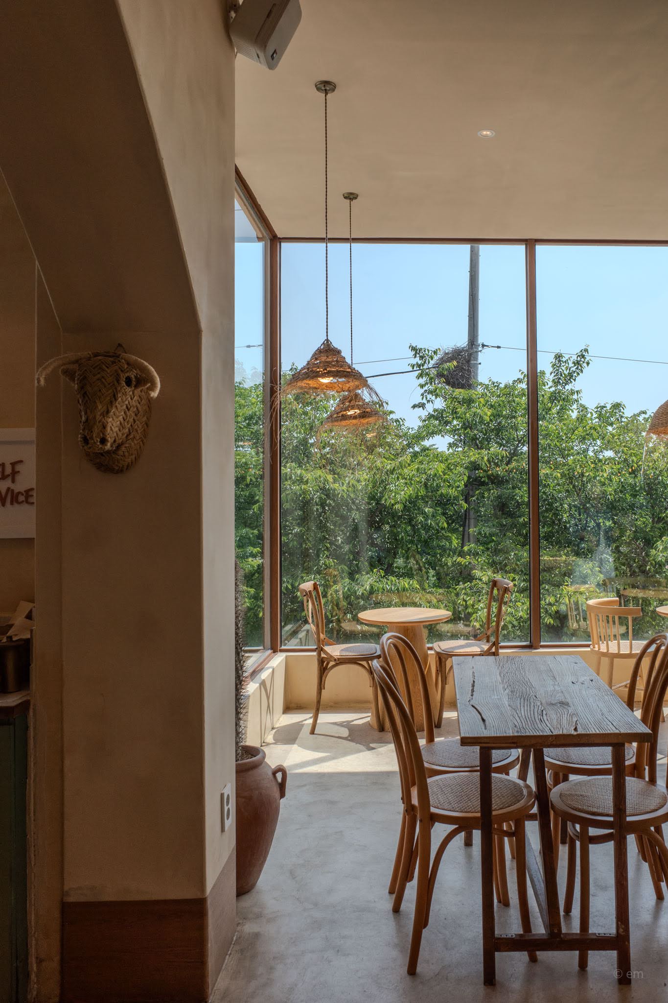Moving through the building is a lesson in how many aesthetic registers a single space can hold without collapsing under its own ambition. One room runs entirely to rough stone flooring and whitewashed archways, a “Donas Day” sign resting in a half-moon niche beside overstuffed bench seating. A glass-wrapped corner on another floor pulls in a canopy of green from the surrounding trees, light falling clean and hard through two full walls of glazing. A quieter zone carries woven rope chairs and raw, salvaged tables, a ceramic jug on a white plinth, the view beyond it mostly sky. Each room is a different breath.