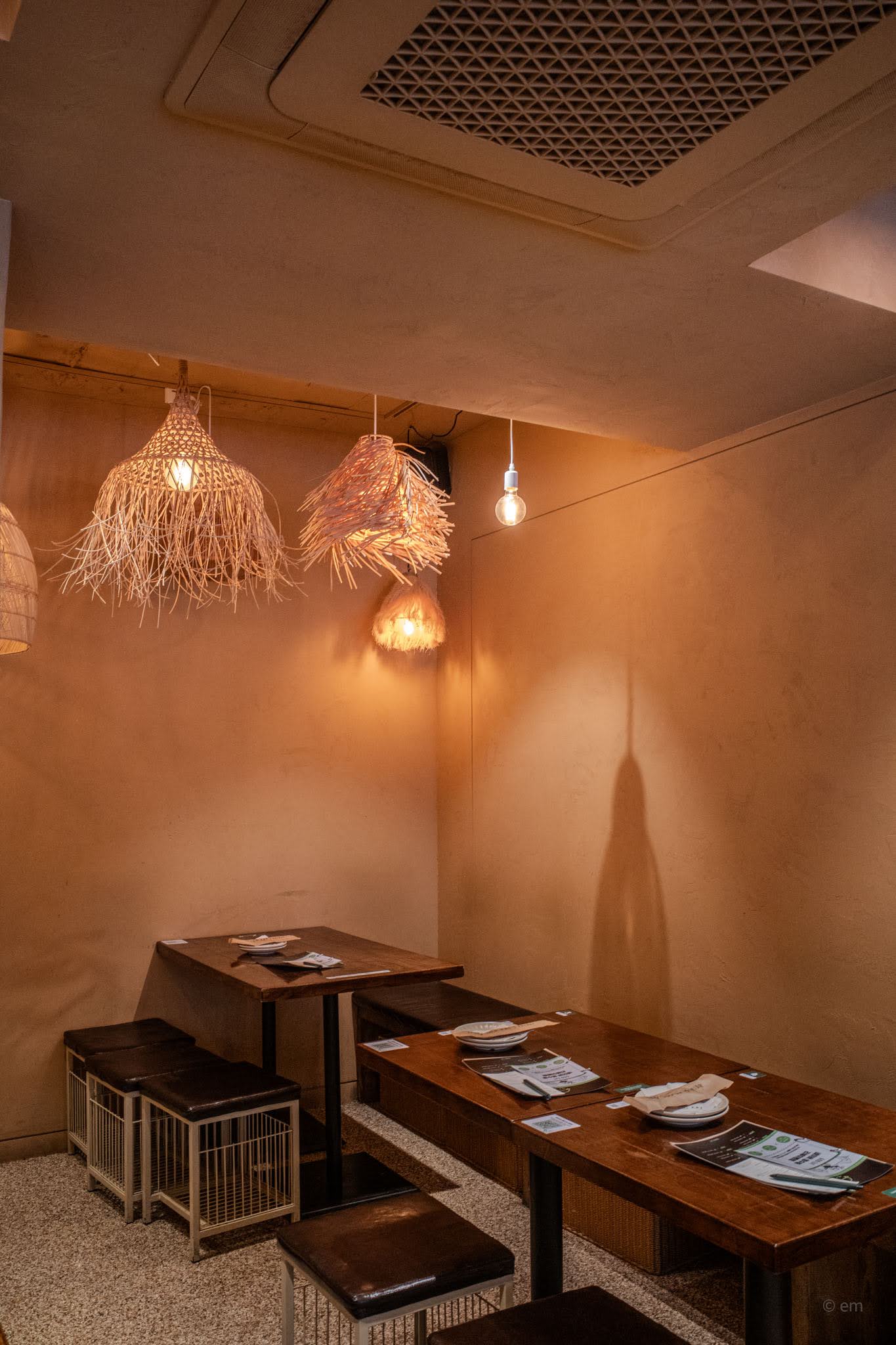 Inside, the walls are the warm ochre of sun-bleached clay. Reed matting lines portions of the ceiling between rough-hewn wooden beams, and pendant lamps made from woven straw and rattan hang at intervals, throwing amber light across the dining room. The low-slung seating, dark plank tables, and straw-accented stools complete the picture.
