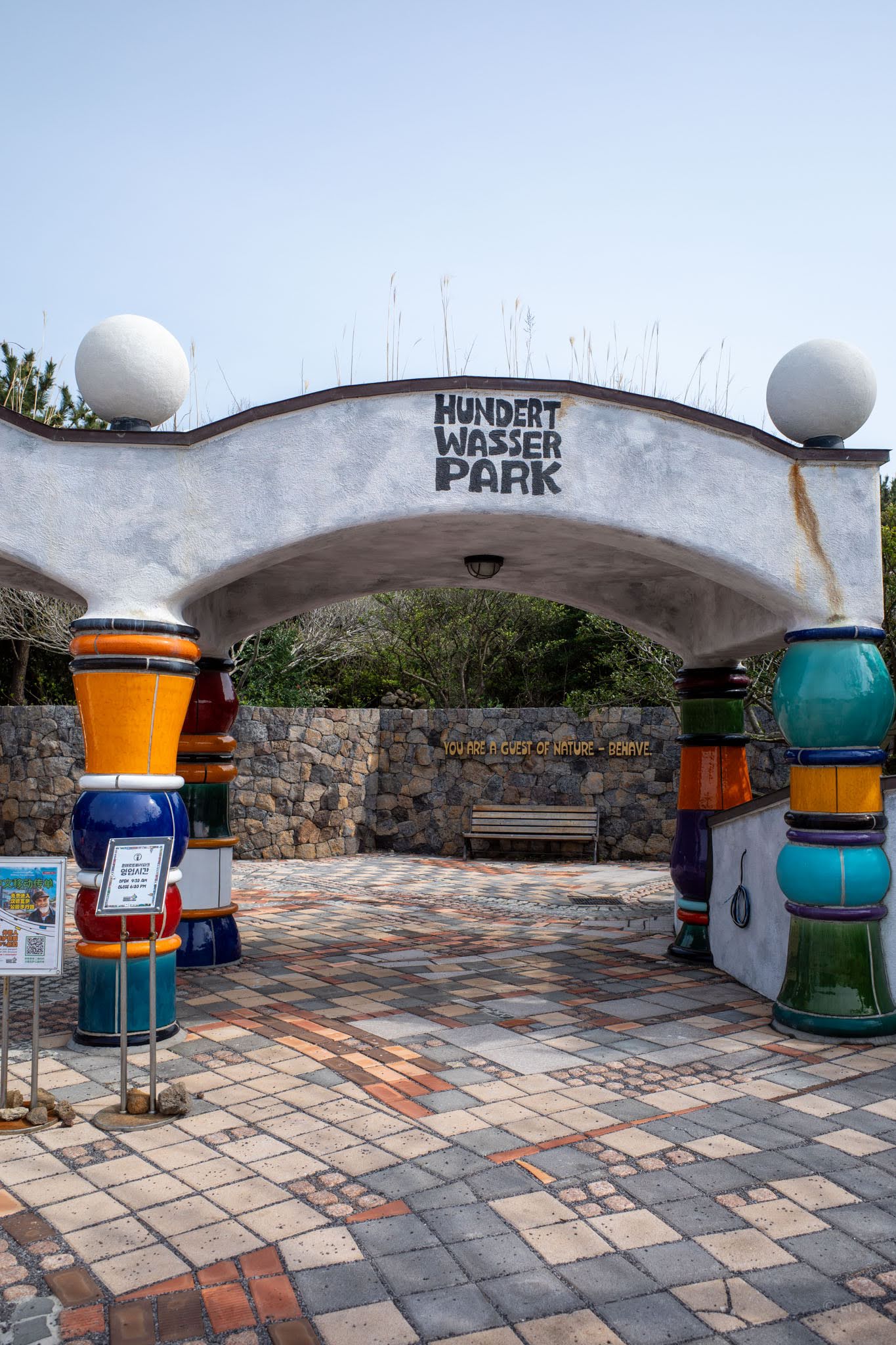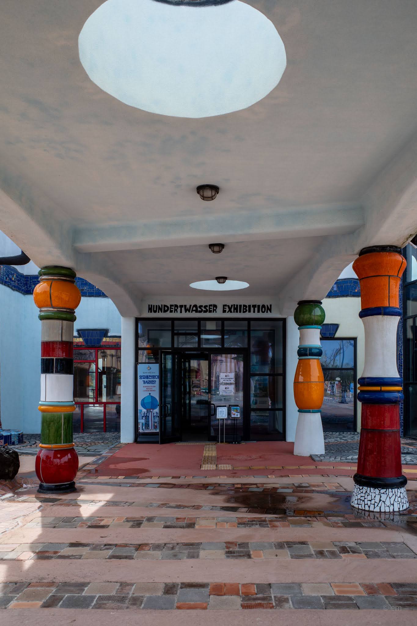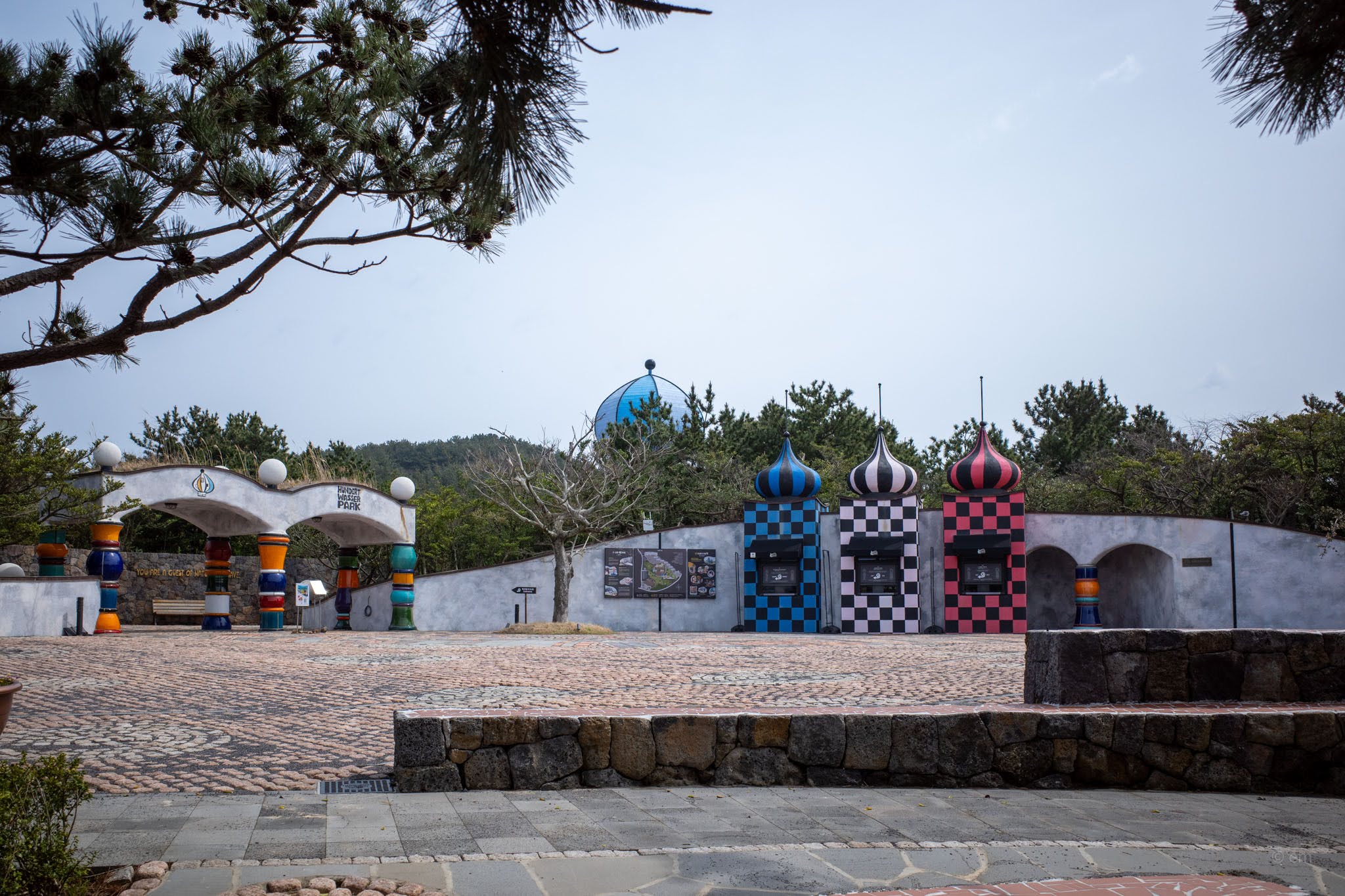 Friedensreich Hundertwasser (1928–2000) was an Austrian painter, architect, and committed eccentric who believed straight lines were a symptom of civilization’s fundamental wrong turn. He spent decades designing buildings, posters, postage stamps, and environmental manifestos around one idea: that the modern world had made itself hostile to nature, and that architecture was the most visible proof. The park on Udo is Korea’s only permanent monument to him — 78 ceramic columns, 131 windows with no two alike, curving facades that refuse to resolve into any flat plane, and mosaic work pressed into nearly every surface.