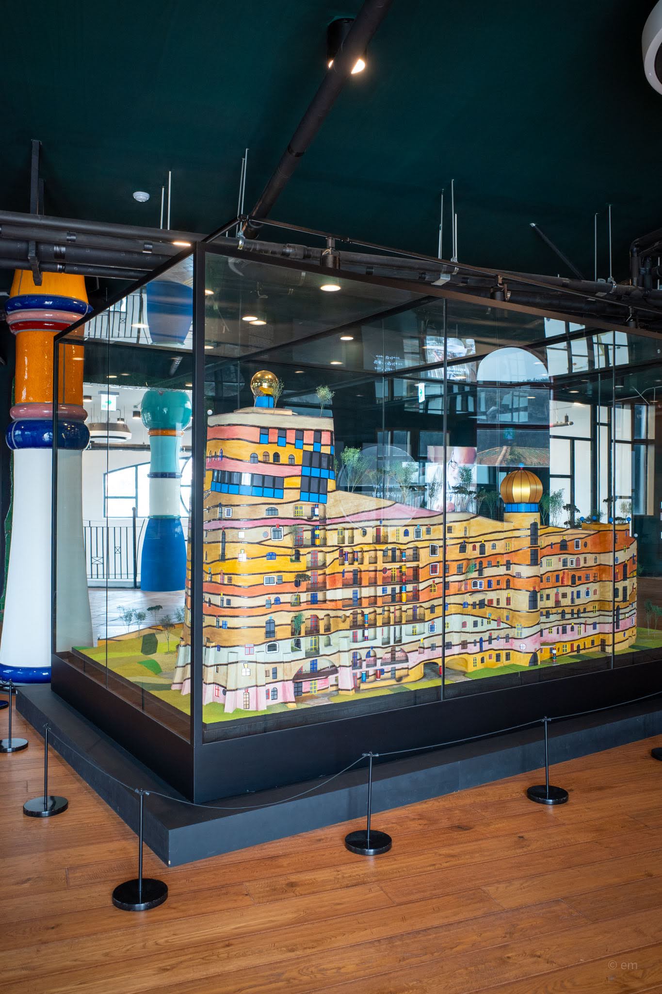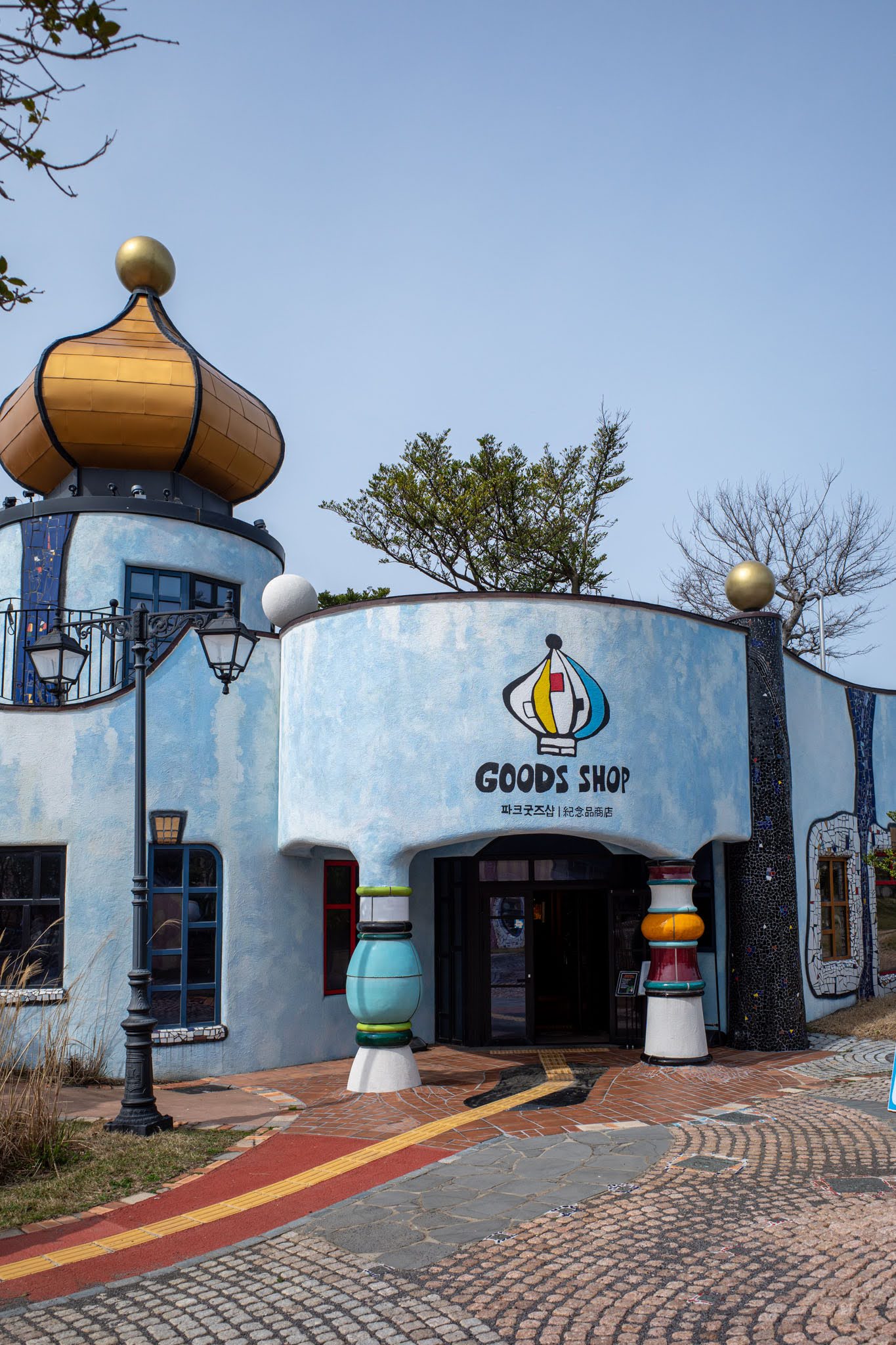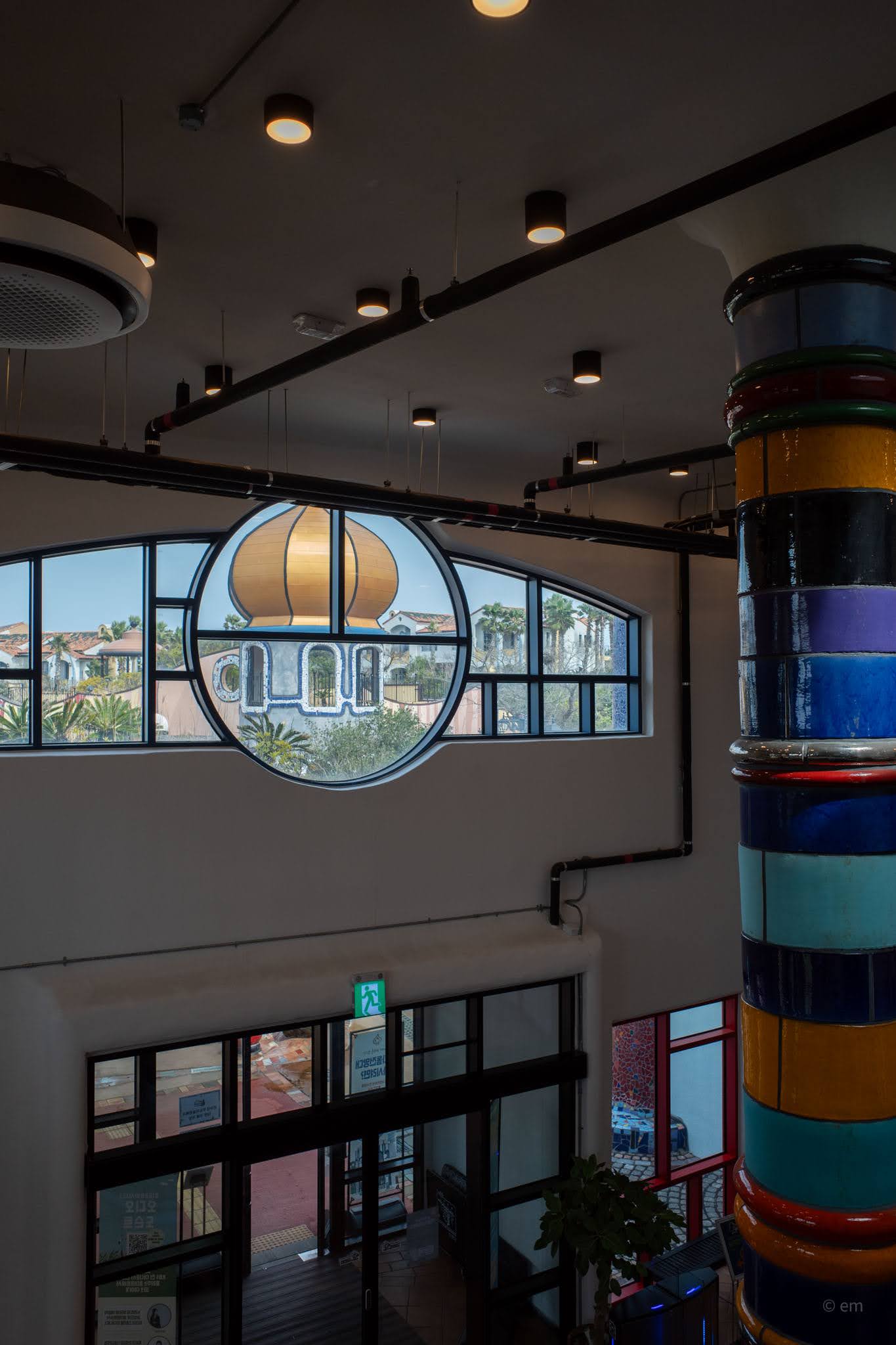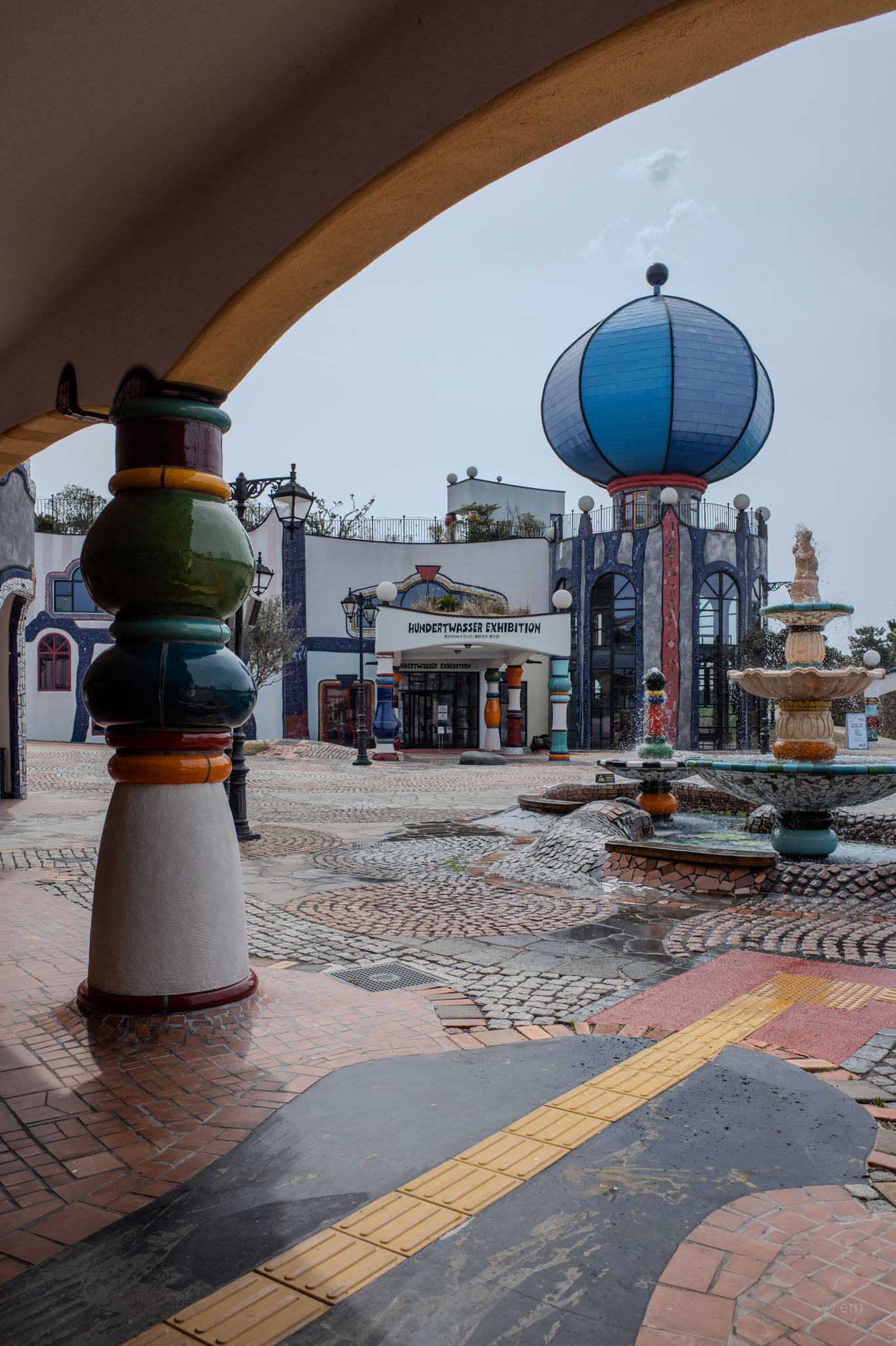Friedensreich Hundertwasser (1928–2000) was an Austrian painter, architect, and committed eccentric who believed straight lines were a symptom of civilization’s fundamental wrong turn. He spent decades designing buildings, posters, postage stamps, and environmental manifestos around one idea: that the modern world had made itself hostile to nature, and that architecture was the most visible proof. The park on Udo is Korea’s only permanent monument to him — 78 ceramic columns, 131 windows with no two alike, curving facades that refuse to resolve into any flat plane, and mosaic work pressed into nearly every surface.
