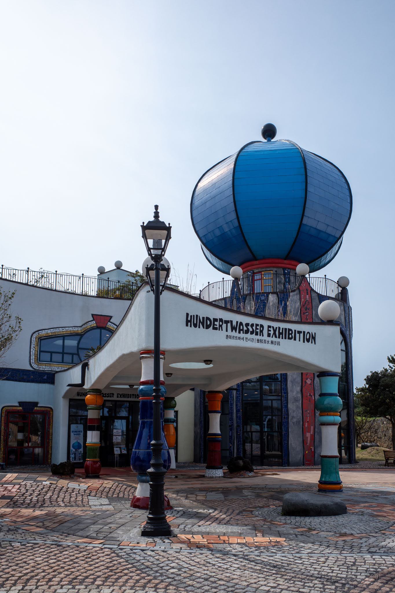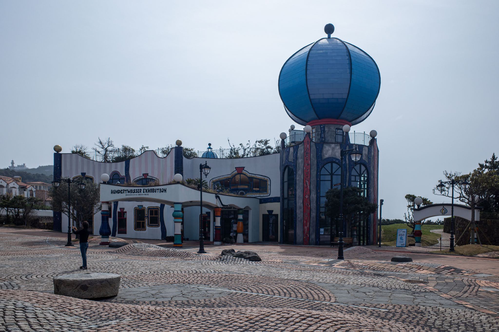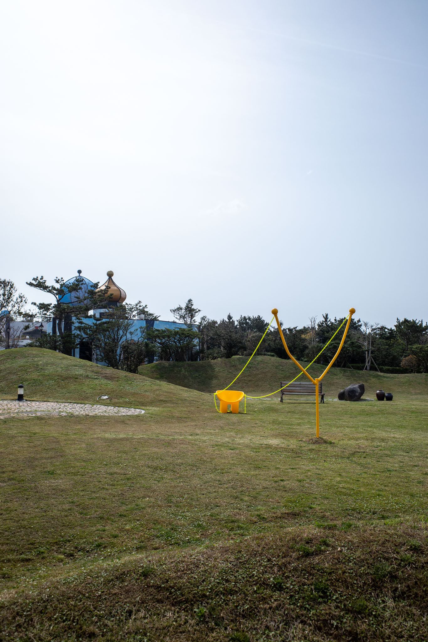 Beyond the museum complex, Hundertwasser Hills — the resort accommodation — stretches across the hillside in low-profile Mediterranean-style villas: white render, terracotta tile, arched windows, palm trees caught mid-lean in the coastal wind. The resort operates separately from the museum, and its attached café (Hundertwasser Winds, with views toward Seongsan Ilchulbong) will be covered in a separate post. The grounds between all of this — gently rolling turf, cobblestone paths, lawn sculptures, a yellow slingshot swing — provide the connective tissue of the park, and enough open space to feel the wind coming in off Jeju Strait.