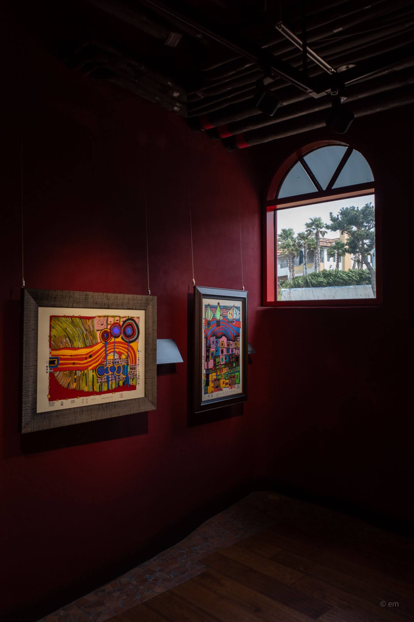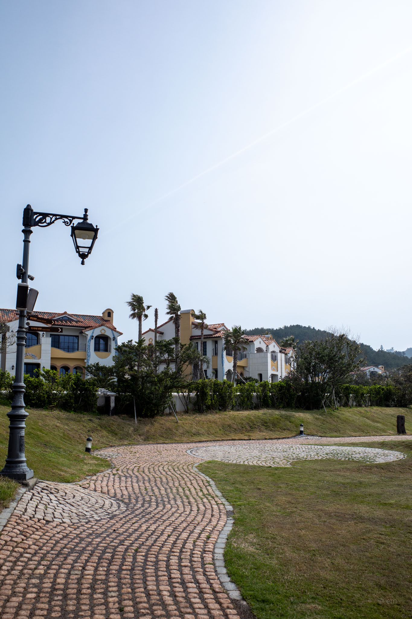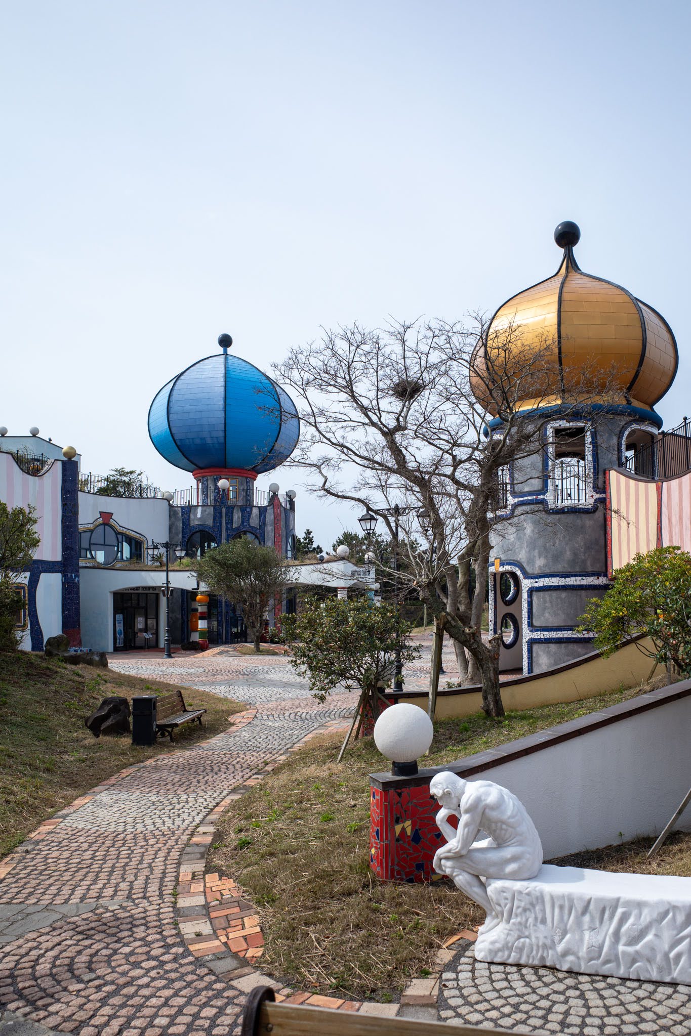 Beyond the museum complex, Hundertwasser Hills — the resort accommodation — stretches across the hillside in low-profile Mediterranean-style villas: white render, terracotta tile, arched windows, palm trees caught mid-lean in the coastal wind. The resort operates separately from the museum, and its attached café (Hundertwasser Winds, with views toward Seongsan Ilchulbong) will be covered in a separate post. The grounds between all of this — gently rolling turf, cobblestone paths, lawn sculptures, a yellow slingshot swing — provide the connective tissue of the park, and enough open space to feel the wind coming in off Jeju Strait.