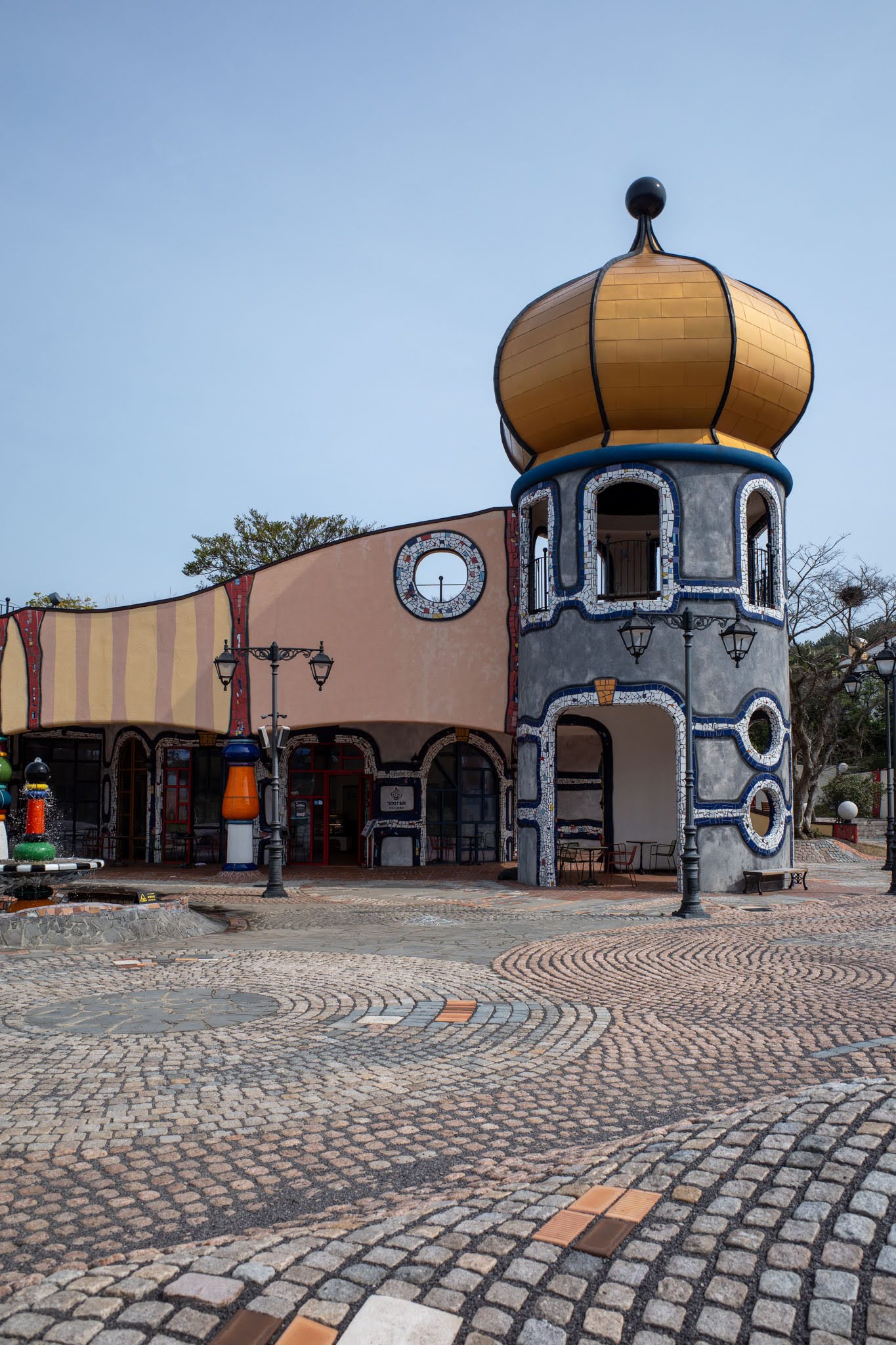 The U-Do Museum building across the square takes a warmer register — sandy terracotta tones, rounded arches, a rosette-windowed tower draped in blue tile and outlined in white mosaic chip, its gold dome catching the midday sky. Between and around the buildings, ceramic columns in every configuration of colour — alternating rings of orange, teal, red, cobalt, white — function simultaneously as structural elements and as freestanding sculpture. The column is Hundertwasser’s most recurring motif: the column that should not match any other column, the column as a declaration of individual difference.