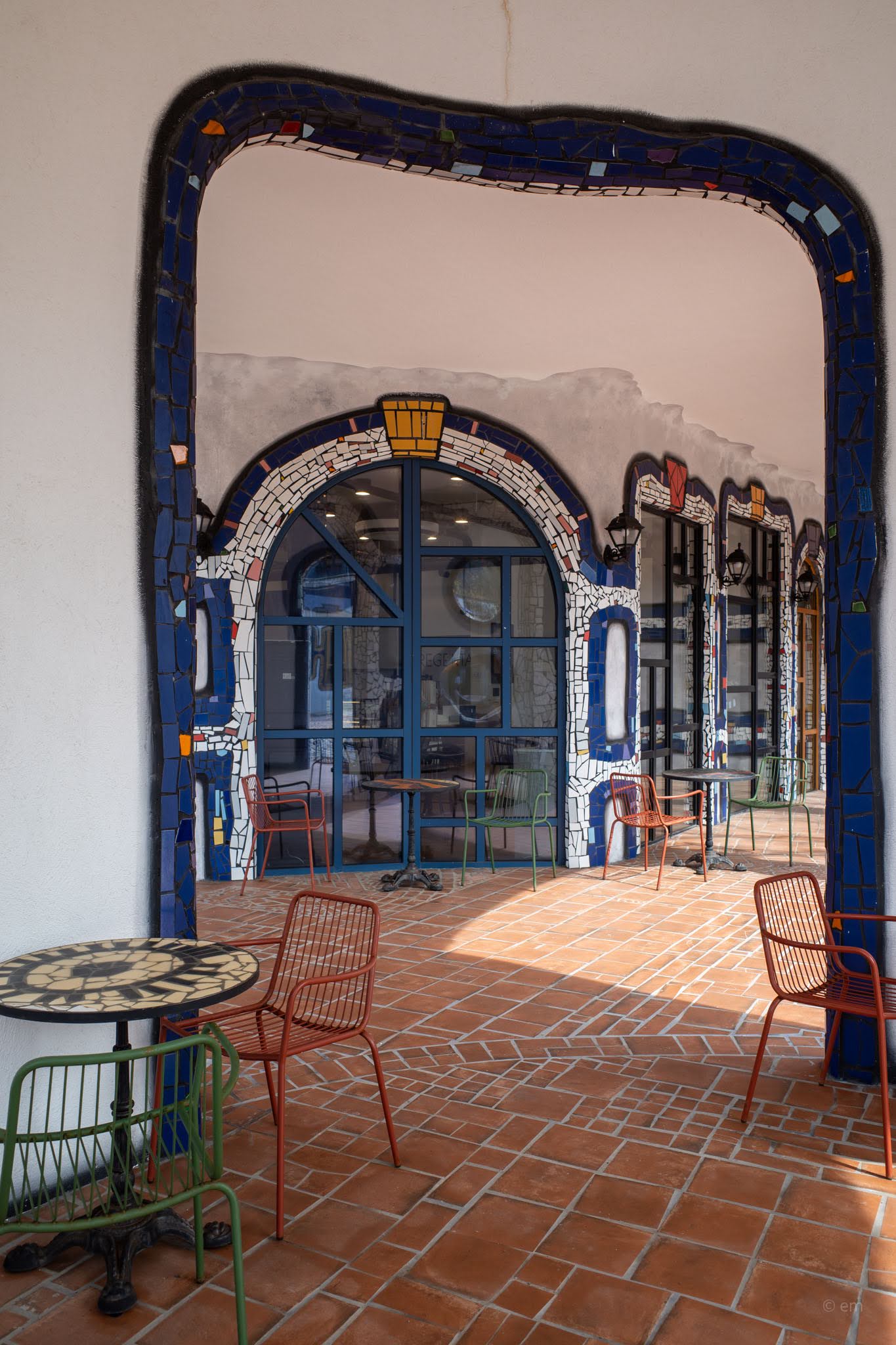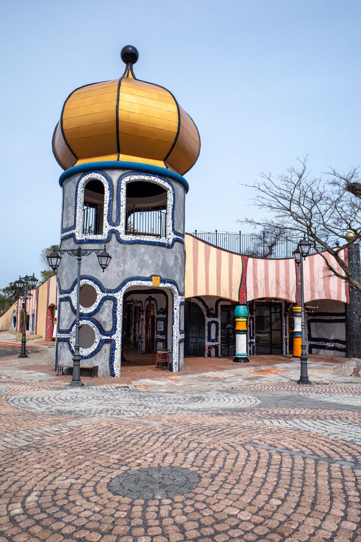 Walking through the main plaza, the buildings present themselves less as individual structures than as a single argument. The Hundertwasser Exhibition building carries the most architectural force: a low, wave-roofed body in white with blue and grey mosaic-tiled vertical columns, leading to the tower — a cylindrical drum ringed with arched openings, mosaic grids, and wrought-iron balconies, capped by the enormous blue sphere. Seen straight-on from the cobblestone plaza, the proportions are almost absurdist. The sphere is too large. That’s exactly right.