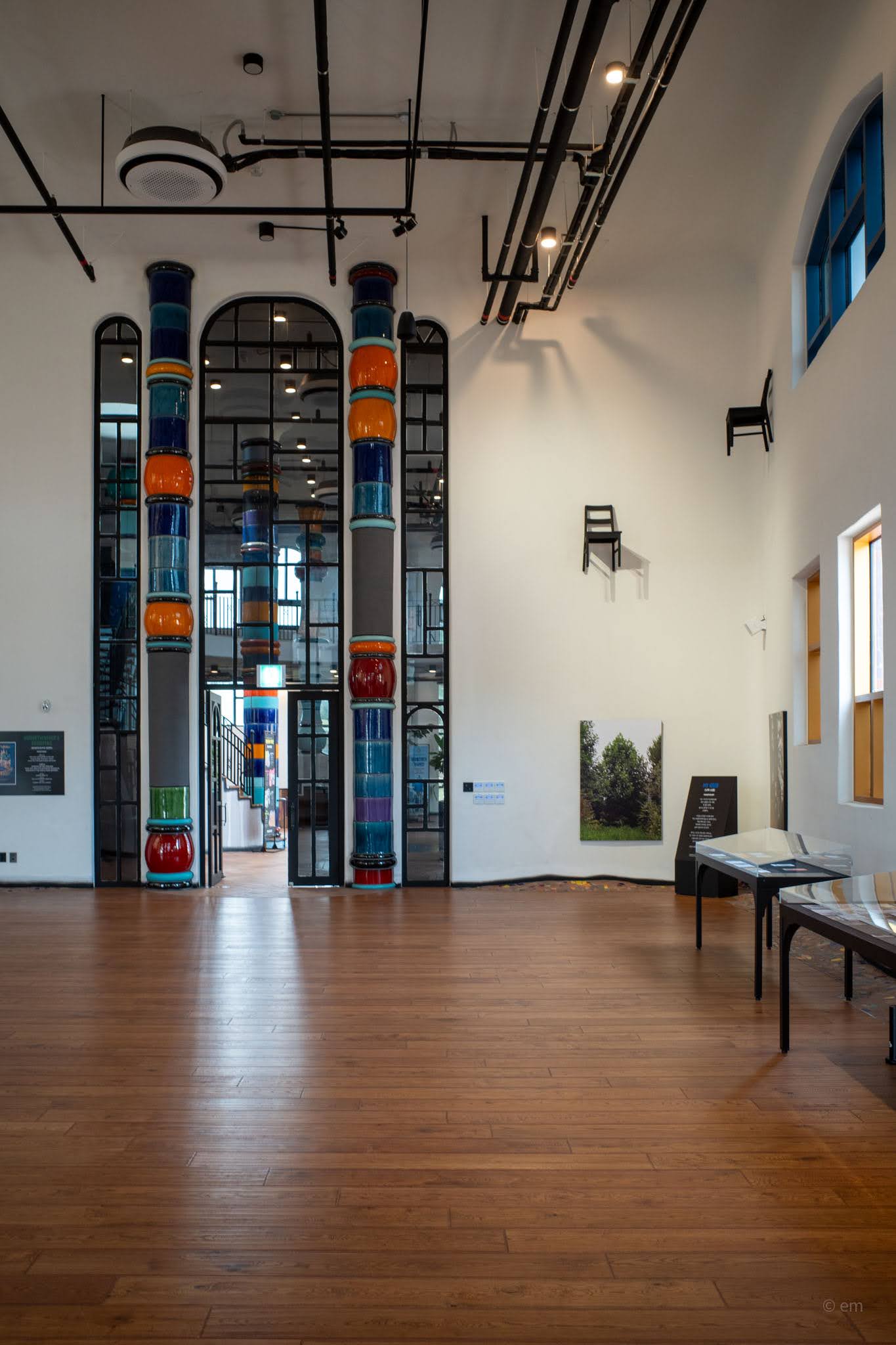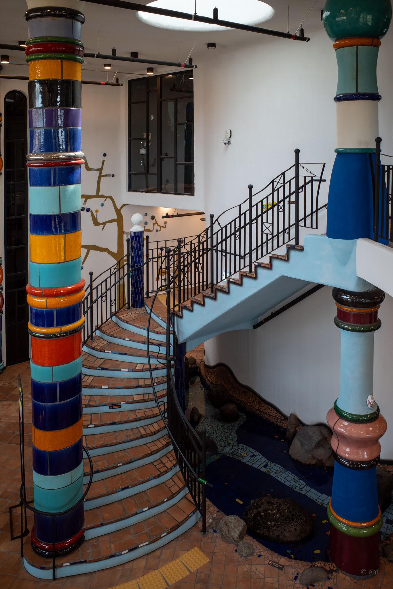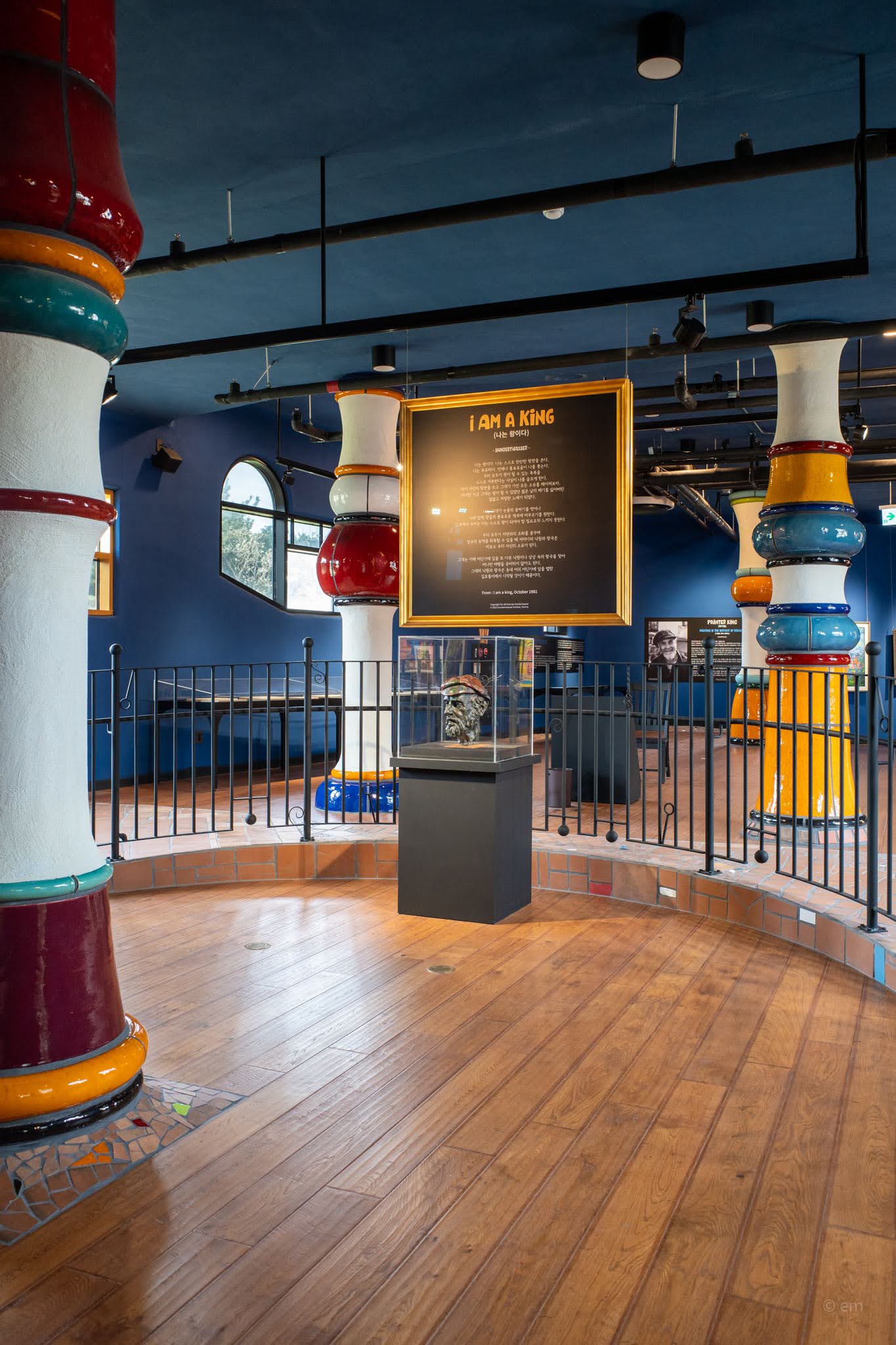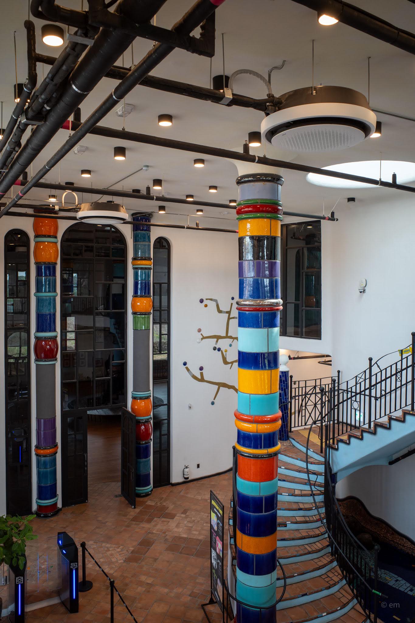 The Hundertwasser Exhibition occupies multiple levels inside the tower and its adjoining wing. Entrance is through a portico flanked by floor-to-ceiling ceramic columns in stacked bulb forms — orange, green, red, white — with a shallow oval skylight overhead. Through the glass doors, the circular interior of the tower unfolds under a deep navy ceiling. Hanging columns descend from above. A large framed panel displays the text of Hundertwasser’s I Am a King — his declaration of the self’s sovereignty over the straight line, over the uniform, over the street that belongs to everyone and therefore to no one.