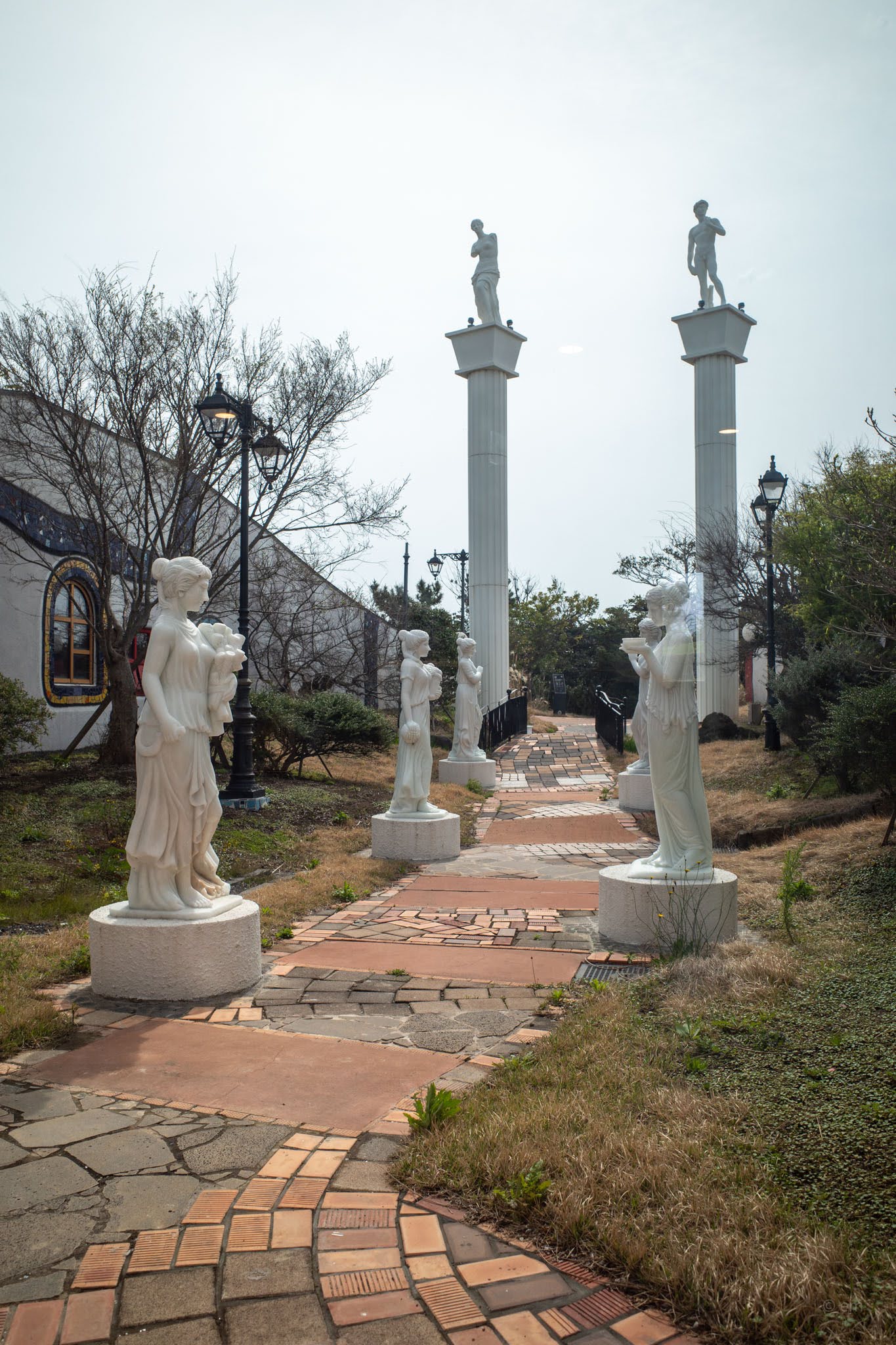 Flanking a brick-paved walkway between buildings, a processional of white classical figures — marble-effect reproductions of the Venus de Milo, draped female figures, and David-scale figures atop tall white plinths — cuts through the grounds in a straight line that feels incongruous within the park’s curvilinear logic. It’s the kind of collision this place thrives on: the classical European tradition standing at attention while everything around it refuses to sit still.
