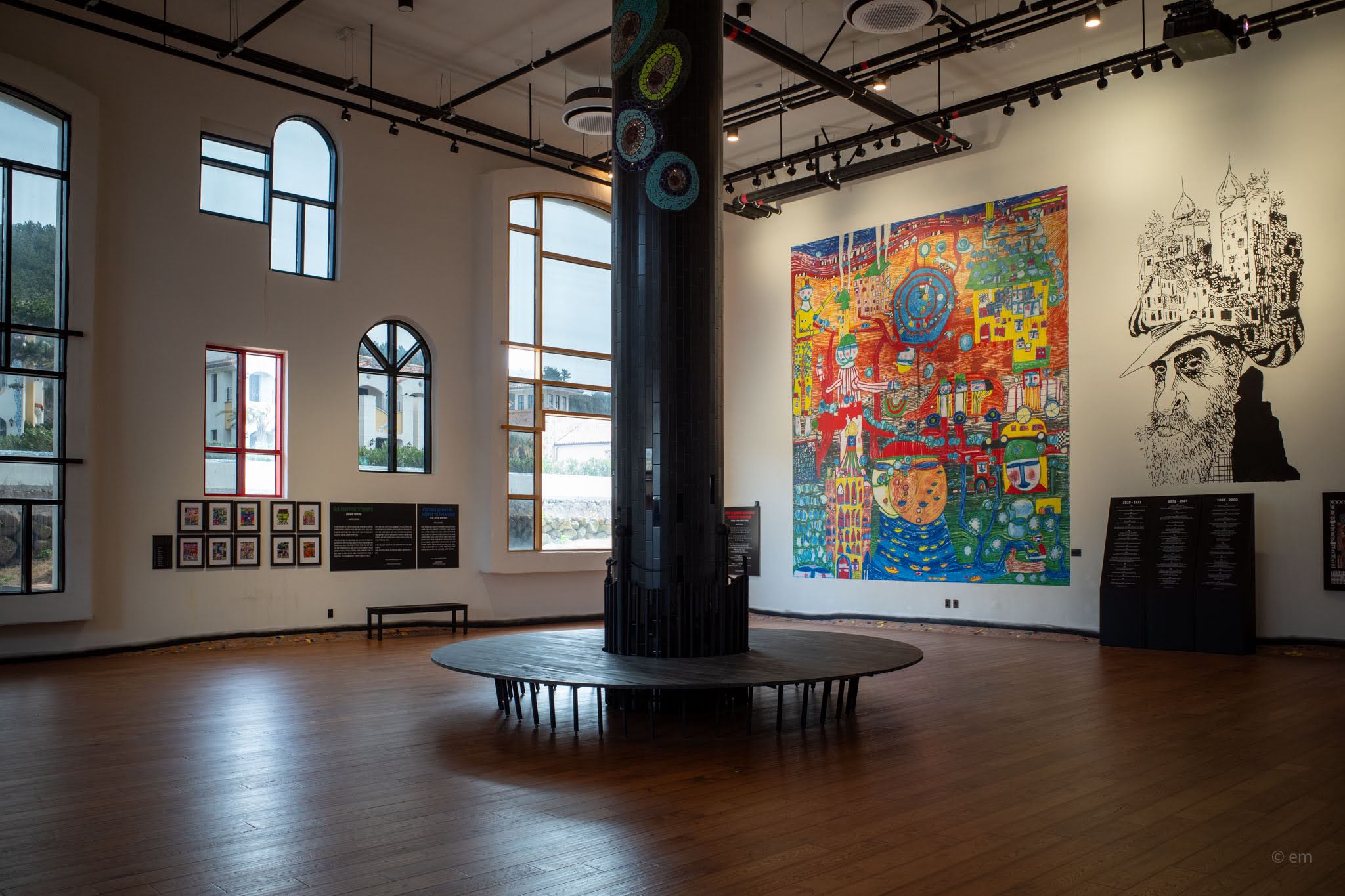 The larger exhibition wing opens into a double-height gallery with arched windows and a central mosaic column rising from a circular bench. One wall holds a large-scale reproduction of Hundertwasser’s painting — its teeming, flat-perspective city of faces and creatures and concentric spirals — beside a line-drawing portrait of the artist in profile, hat in place, building an impossible skyline on his own head. A glass vitrine nearby encloses a detailed architectural model of the park itself: the same wavy rooflines, the same domes, rendered in miniature with the same commitment to no two windows matching.