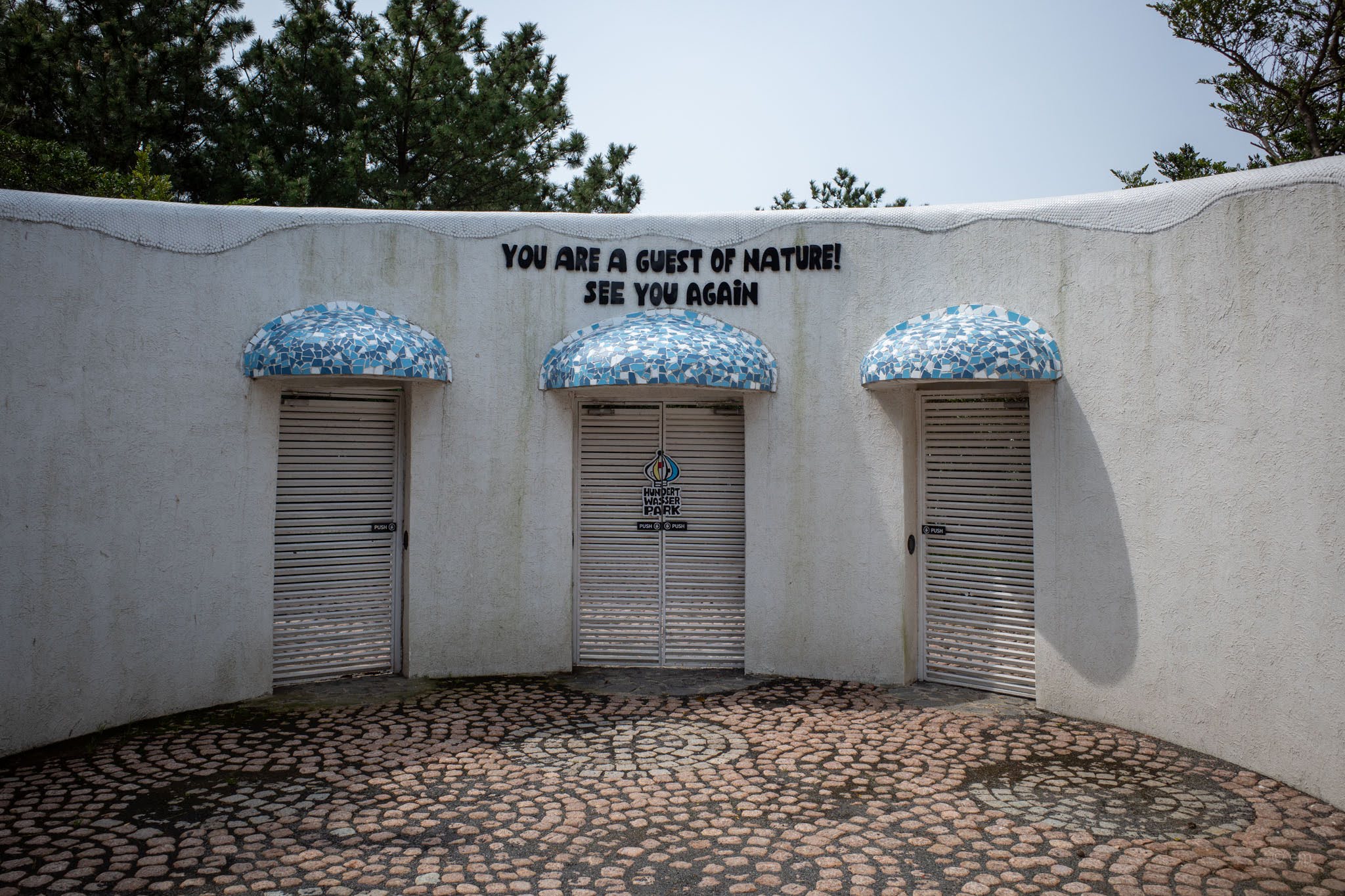 The exit sends visitors out through a curved white wall lined with three shuttered doors, each canopied in blue mosaic tile. Painted above them in blocky letters: YOU ARE A GUEST OF NATURE. SEE YOU AGAIN. It reads as farewell and as correction, simultaneously.