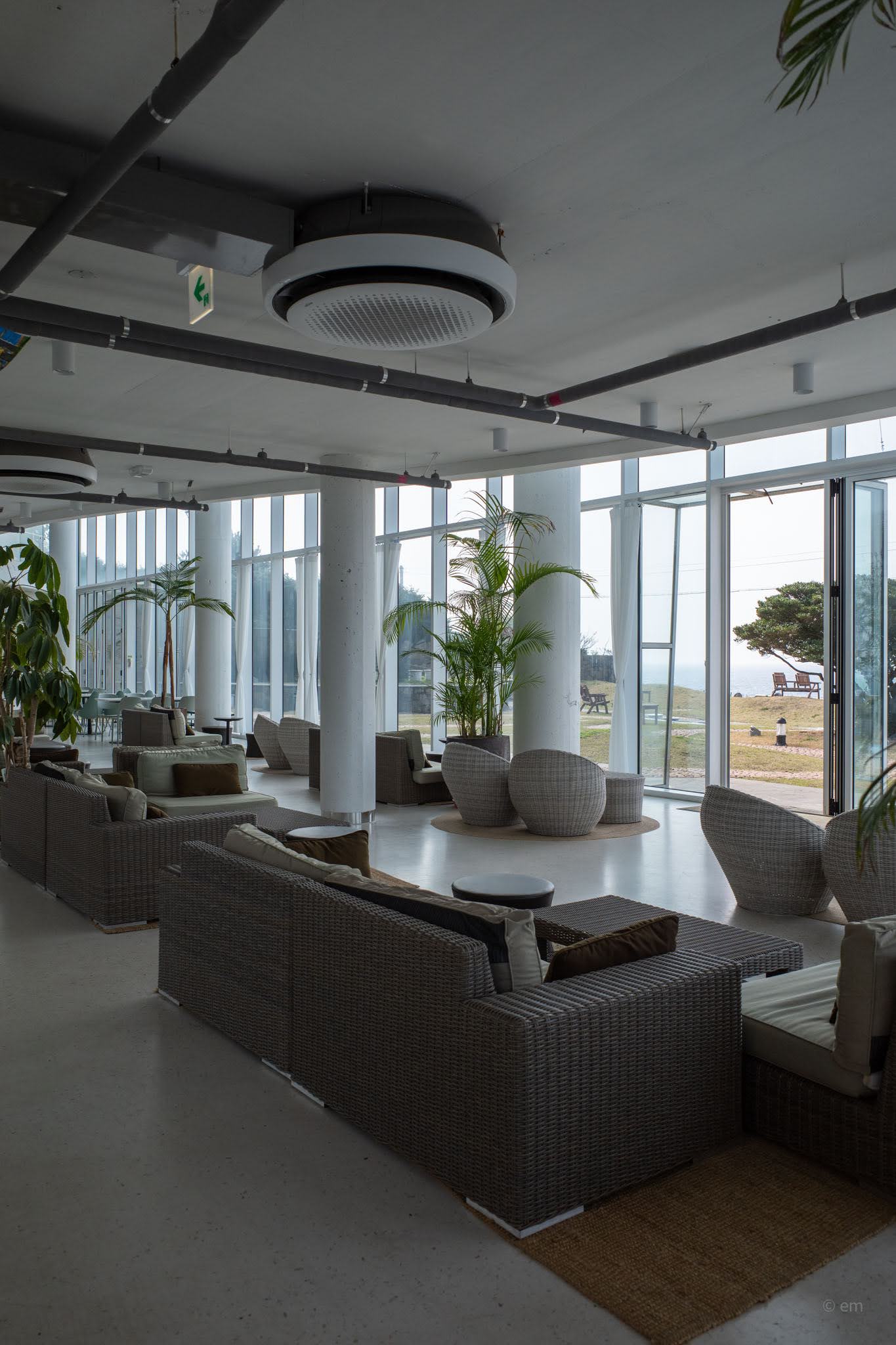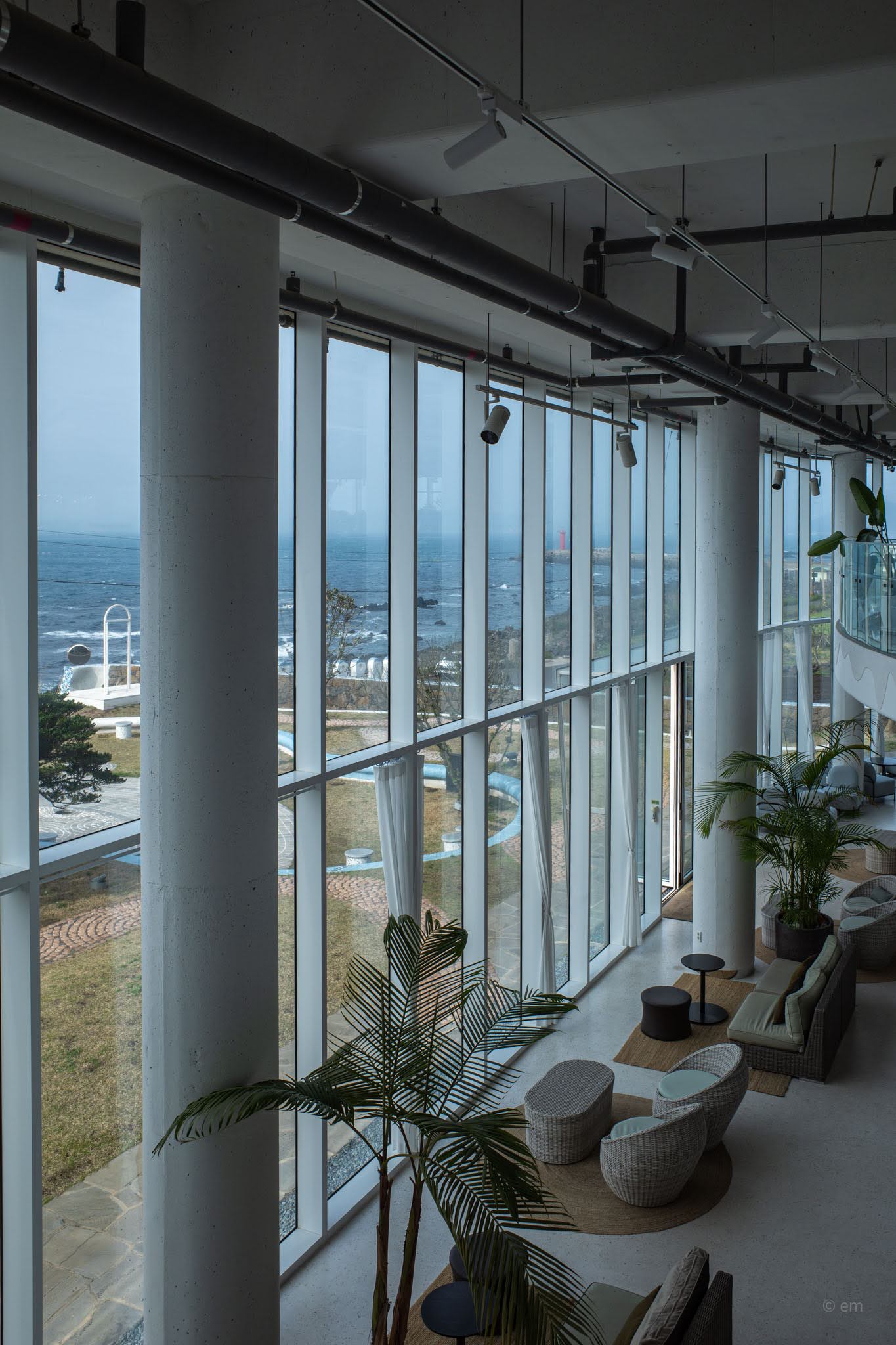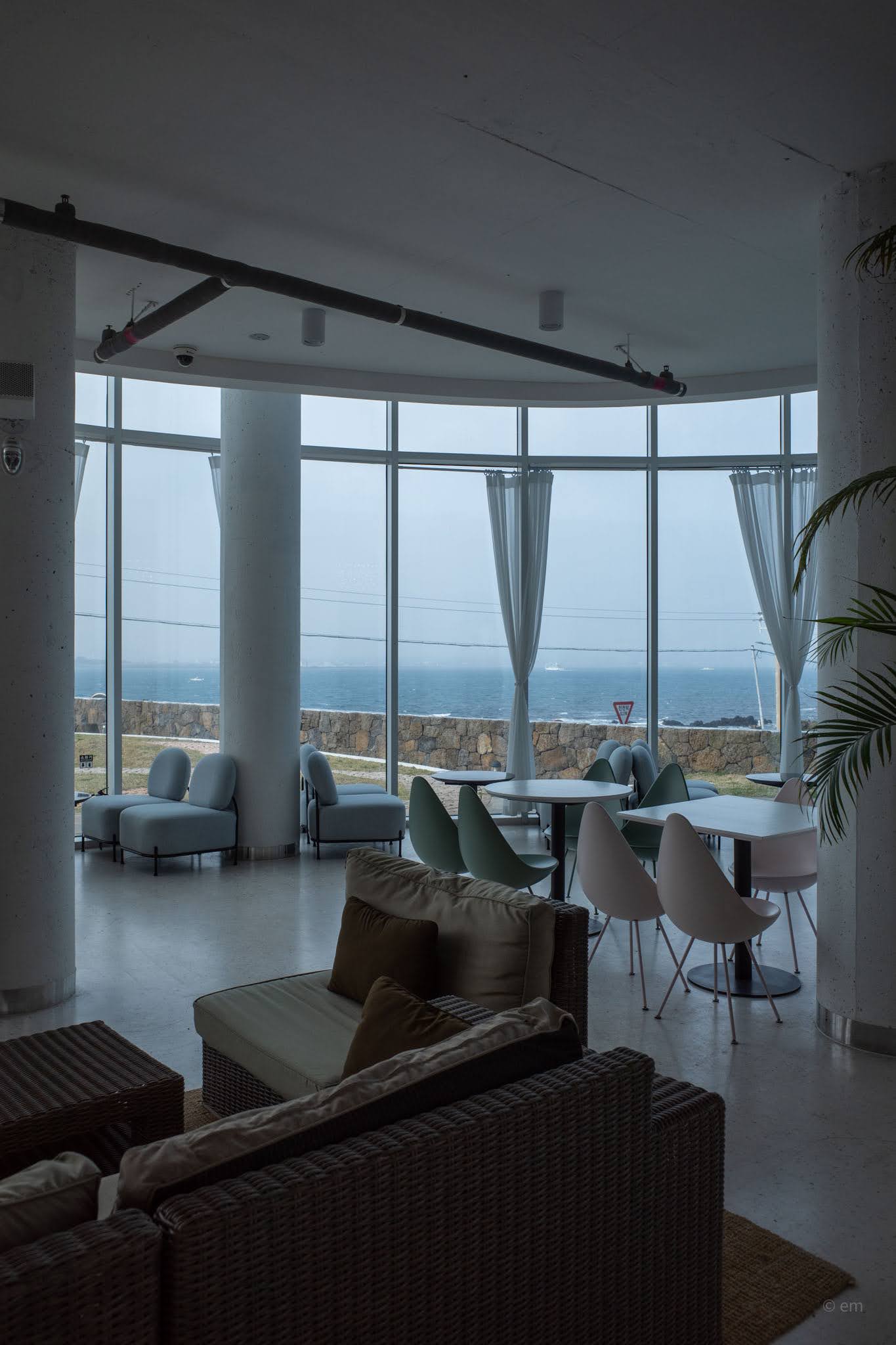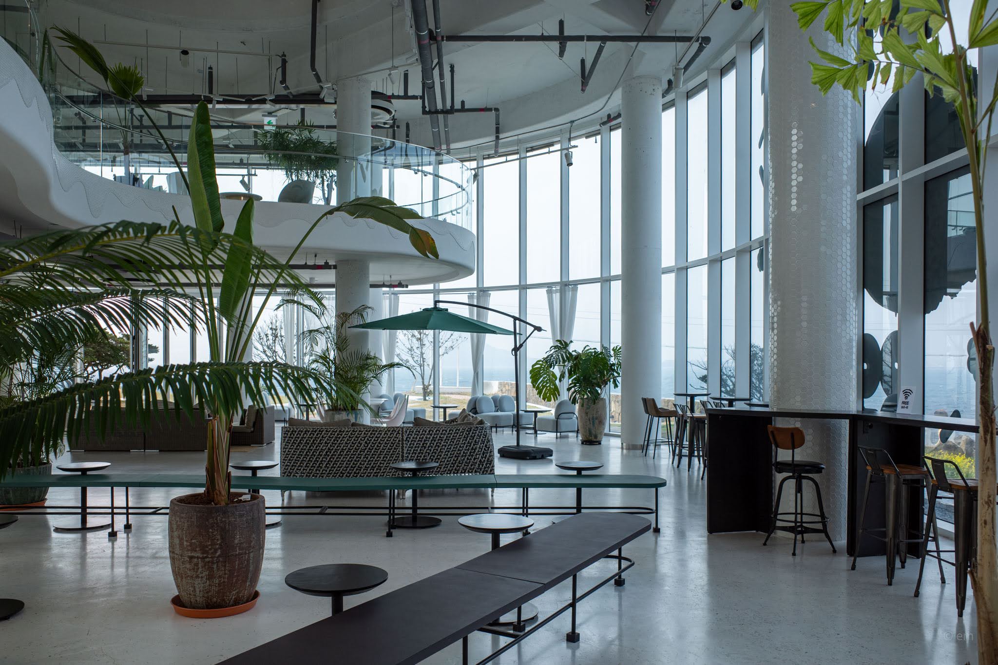 Ground level opens into an enormous, loosely-organized lounge — polished concrete floor, exposed ductwork overhead, concrete columns rising through the space, and more tropical plants than most actual gardens: areca palms, monsteras, banana leaves, ficus trees in pale pots. The seating covers a wide range of temperaments. Rattan sofa clusters occupy the center. Rounded pod chairs in wicker sit on jute rugs near the windows. Sage green drop chairs gather around white café tables. Grey upholstered bubble armchairs face inward toward a garden courtyard. Pale blue rounded sofas cluster at the curve of the glass. All of it — every configuration — has a view. That’s not an accident. There is no bad seat here, only differences in what exactly you’re looking at: open sea, cobblestone wave-patterned lawn, the lone wind-sculpted pine tree at the cliff edge, or the Seongsan Ilchulbong silhouette dissolving into haze across the water.