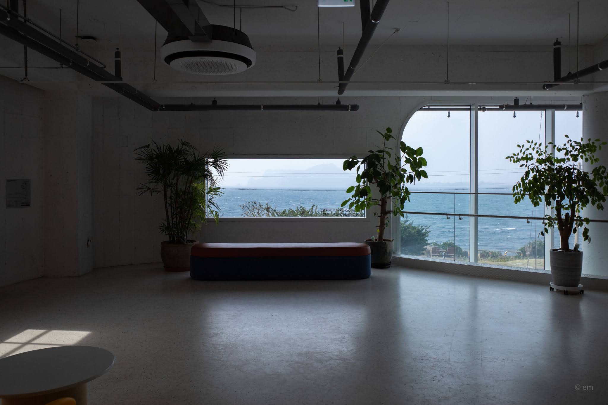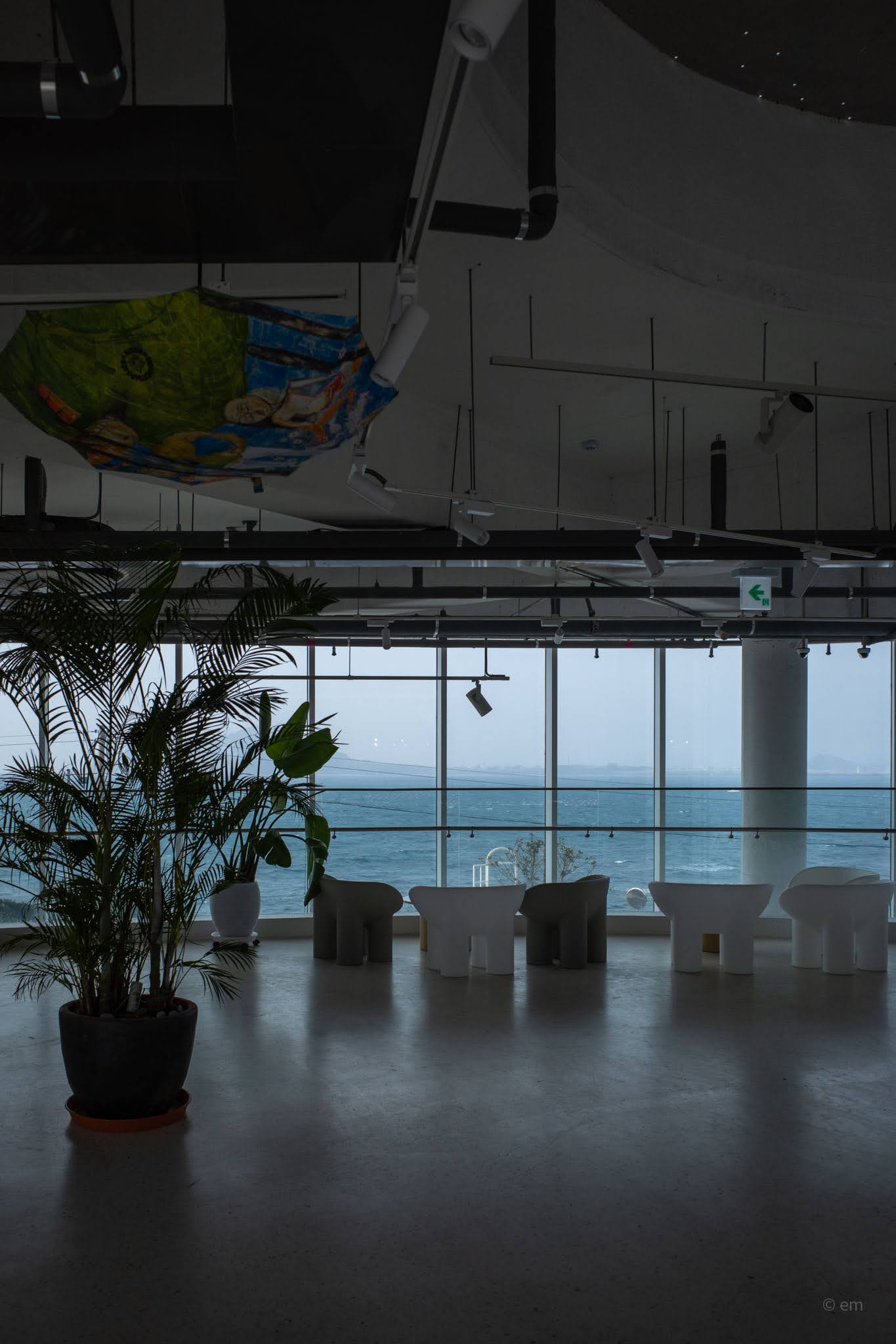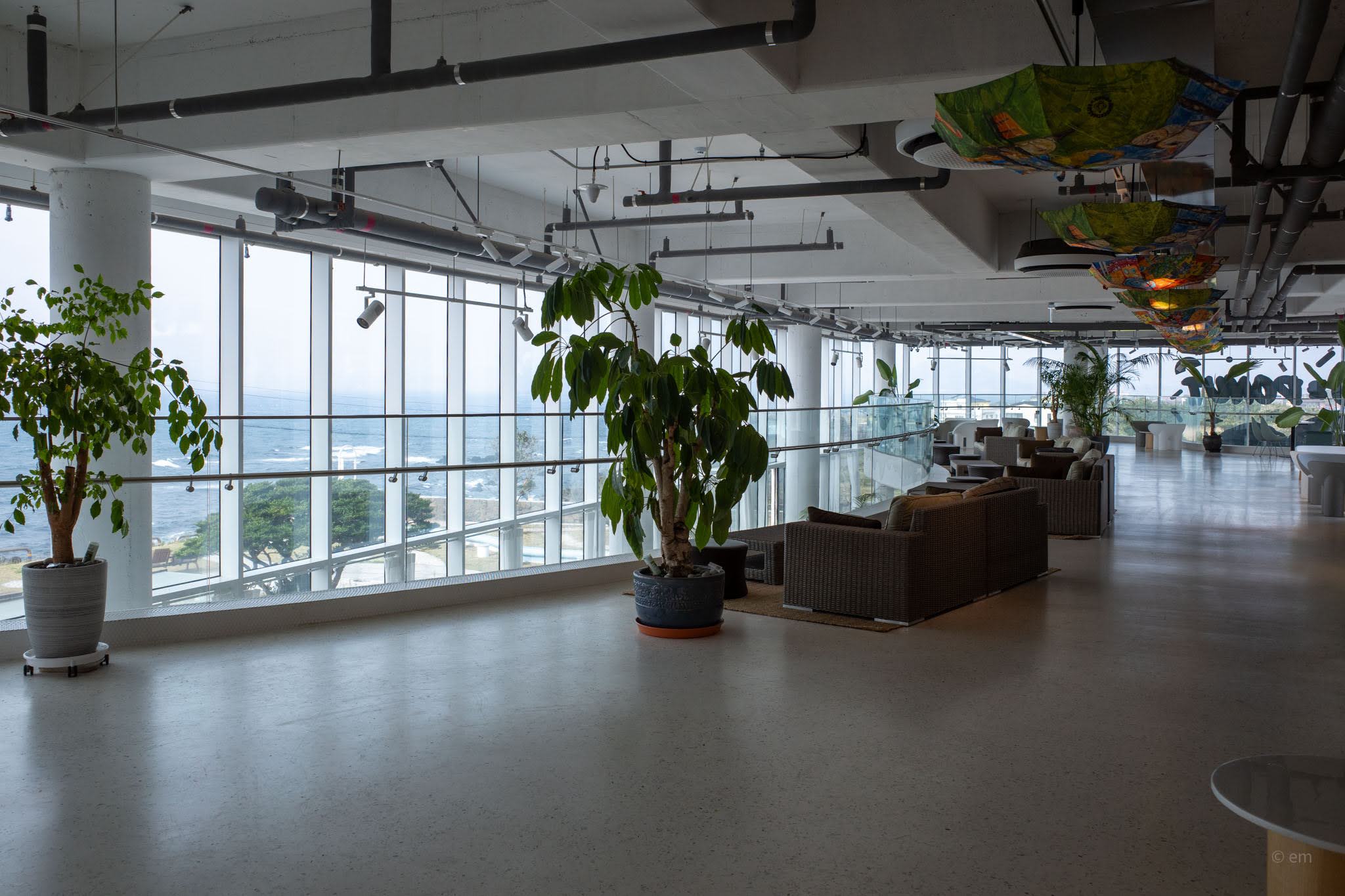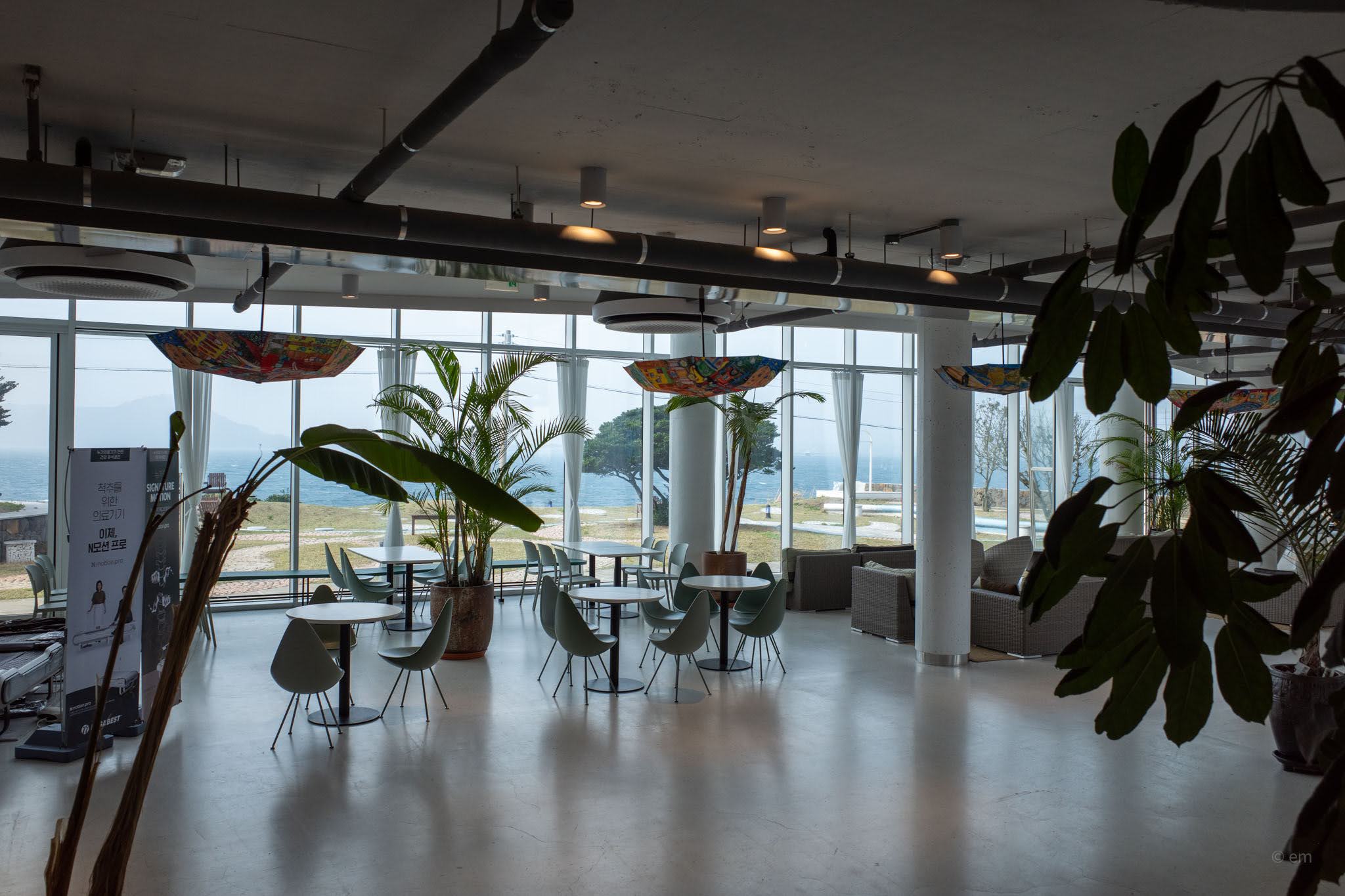 Ground level opens into an enormous, loosely-organized lounge — polished concrete floor, exposed ductwork overhead, concrete columns rising through the space, and more tropical plants than most actual gardens: areca palms, monsteras, banana leaves, ficus trees in pale pots. The seating covers a wide range of temperaments. Rattan sofa clusters occupy the center. Rounded pod chairs in wicker sit on jute rugs near the windows. Sage green drop chairs gather around white café tables. Grey upholstered bubble armchairs face inward toward a garden courtyard. Pale blue rounded sofas cluster at the curve of the glass. All of it — every configuration — has a view. That’s not an accident. There is no bad seat here, only differences in what exactly you’re looking at: open sea, cobblestone wave-patterned lawn, the lone wind-sculpted pine tree at the cliff edge, or the Seongsan Ilchulbong silhouette dissolving into haze across the water.