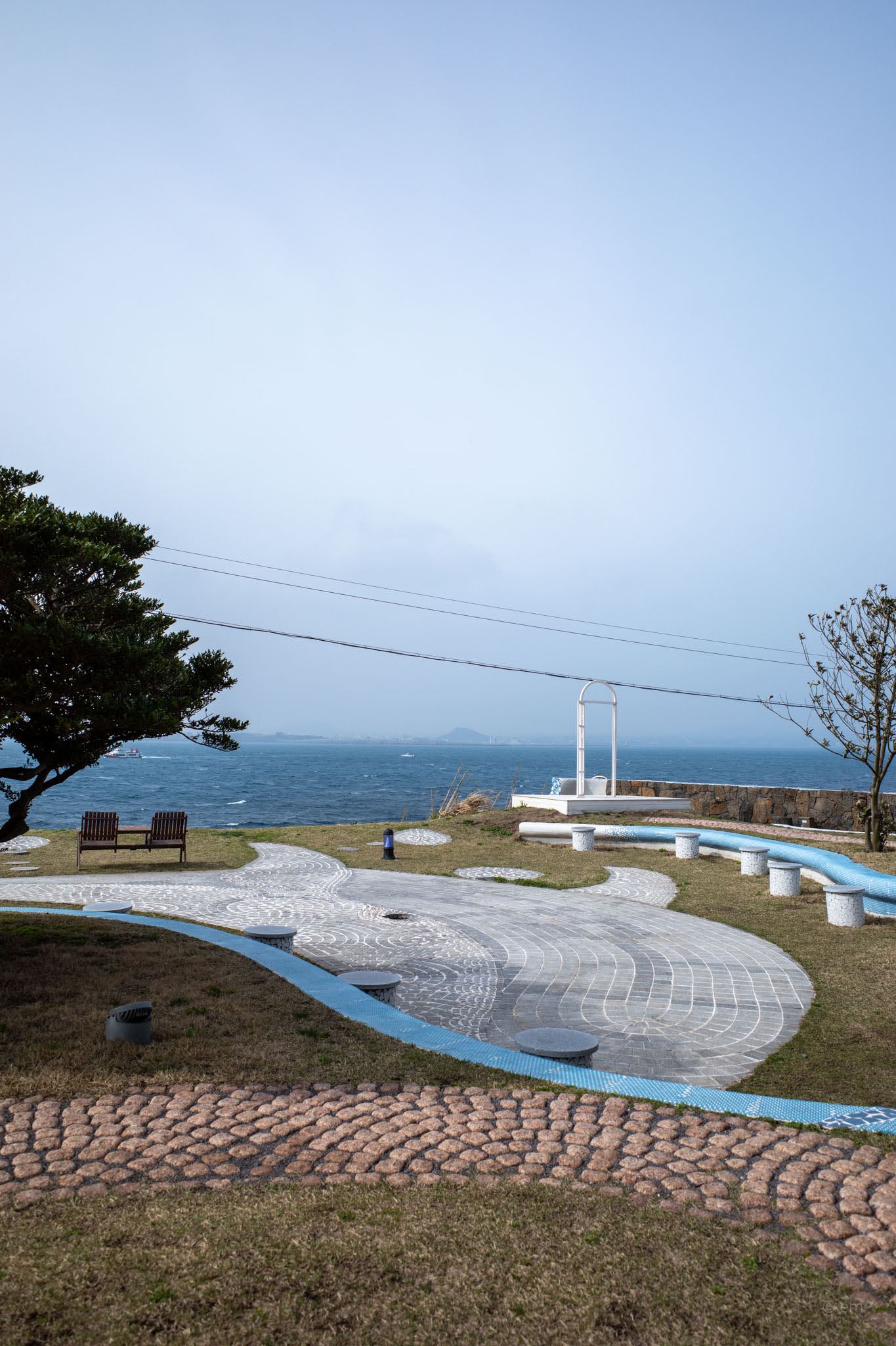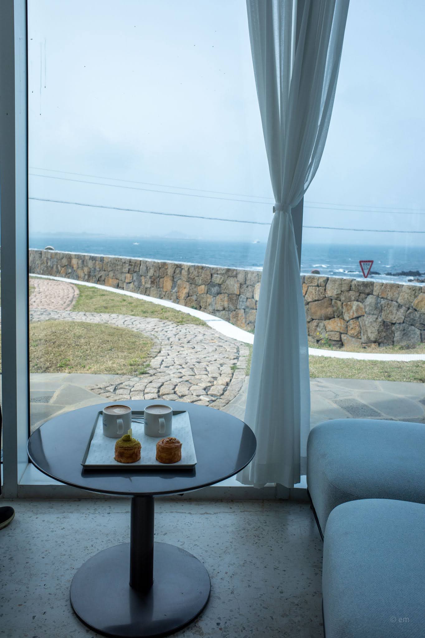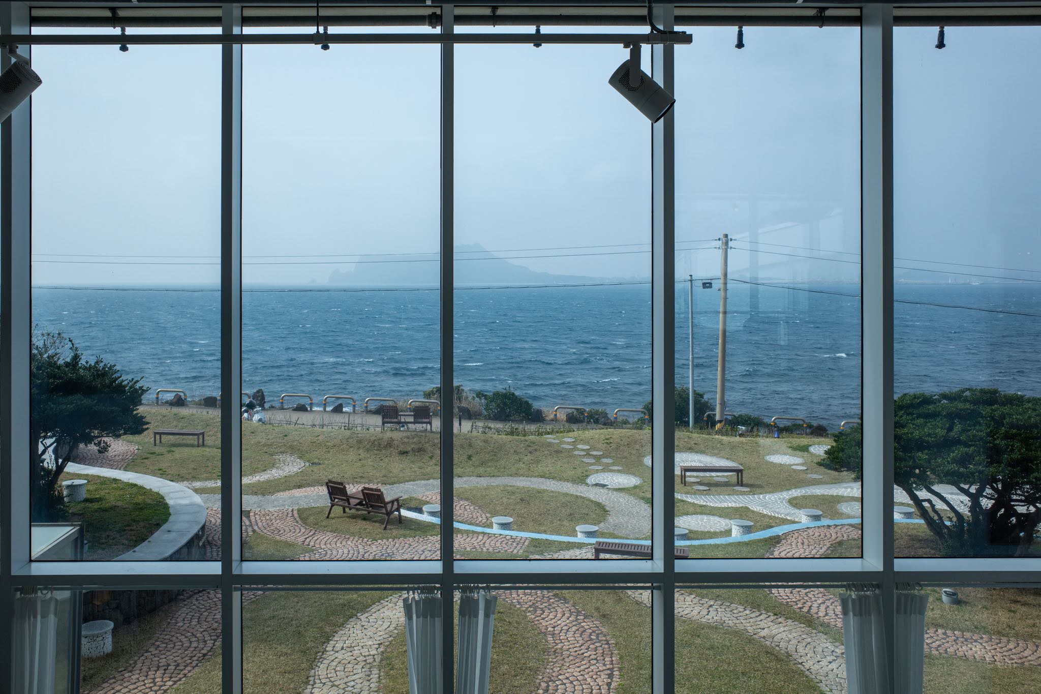 Through the glass, the lawn terrace that runs along the coastal edge is all cobblestone wave patterns embedded into the turf — a surface design that repeats the park’s language of curves — with dark wood benches and pairs of low Adirondack chairs positioned at the bluff edge where the stone wall meets the sea. The water on a windy day breaks beyond the wall in white. Seongsan Ilchulbong sits across the strait, mostly dissolved in grey when the weather is hazy, and occasionally fully present. Two chairs, the horizon, the wind. The outdoor space is part of the experience.