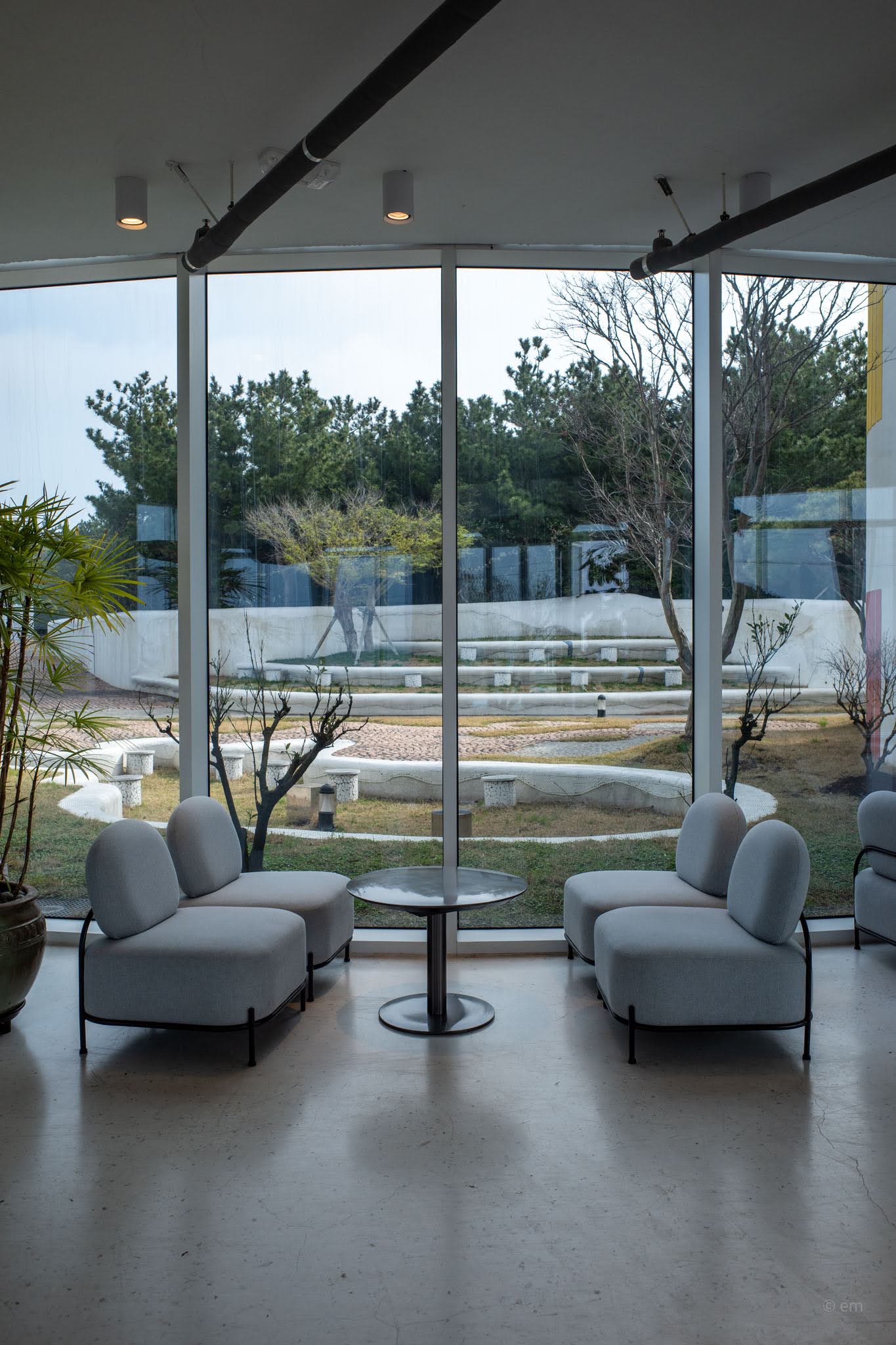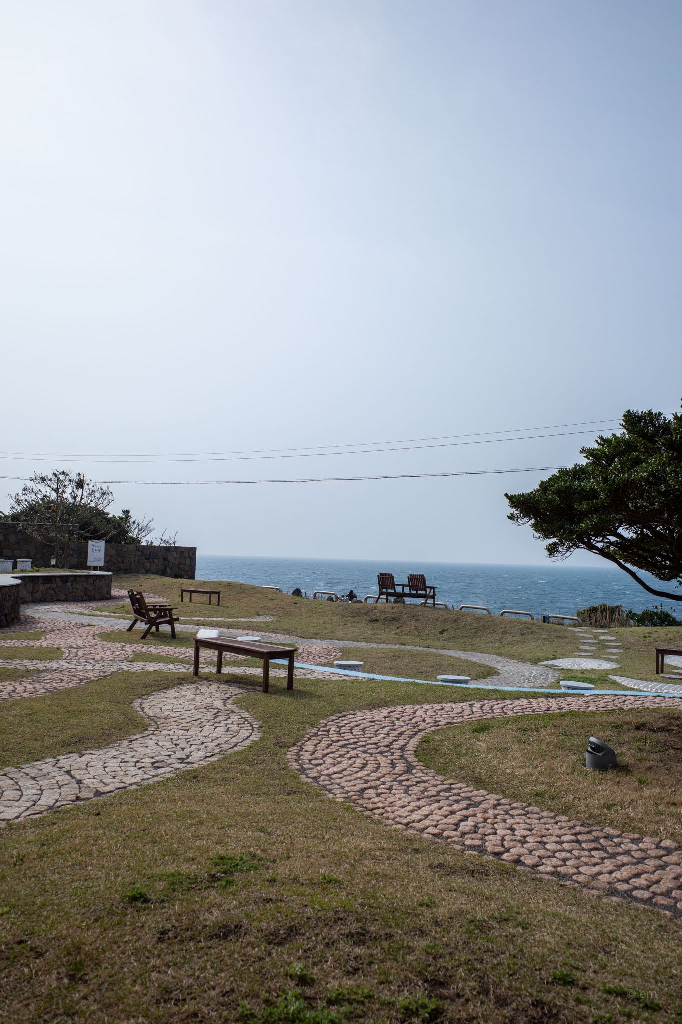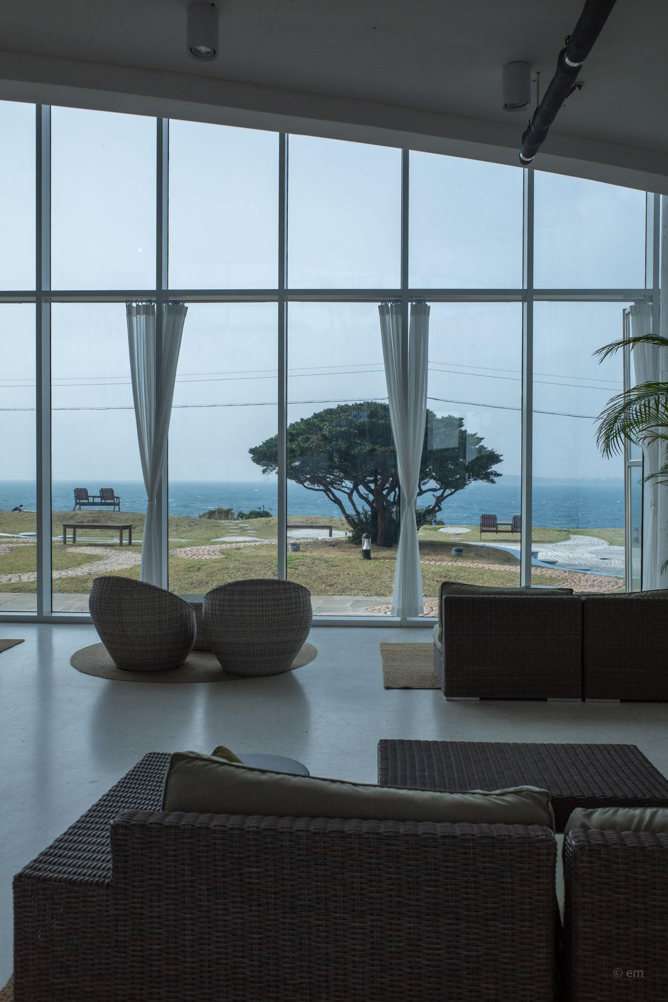 Through the glass, the lawn terrace that runs along the coastal edge is all cobblestone wave patterns embedded into the turf — a surface design that repeats the park’s language of curves — with dark wood benches and pairs of low Adirondack chairs positioned at the bluff edge where the stone wall meets the sea. The water on a windy day breaks beyond the wall in white. Seongsan Ilchulbong sits across the strait, mostly dissolved in grey when the weather is hazy, and occasionally fully present. Two chairs, the horizon, the wind. The outdoor space is part of the experience.