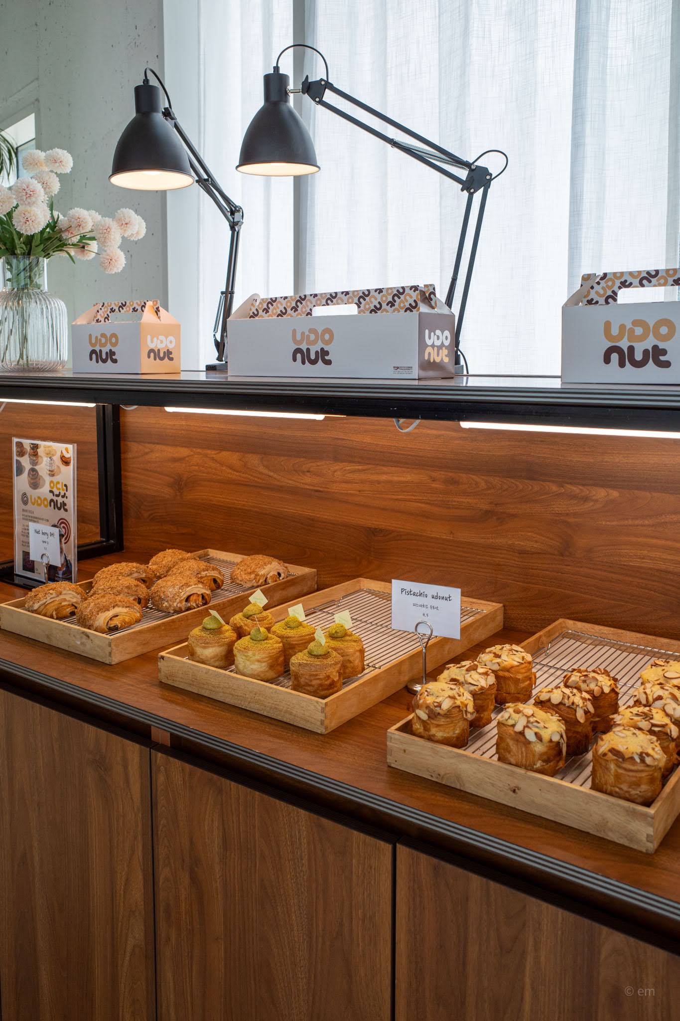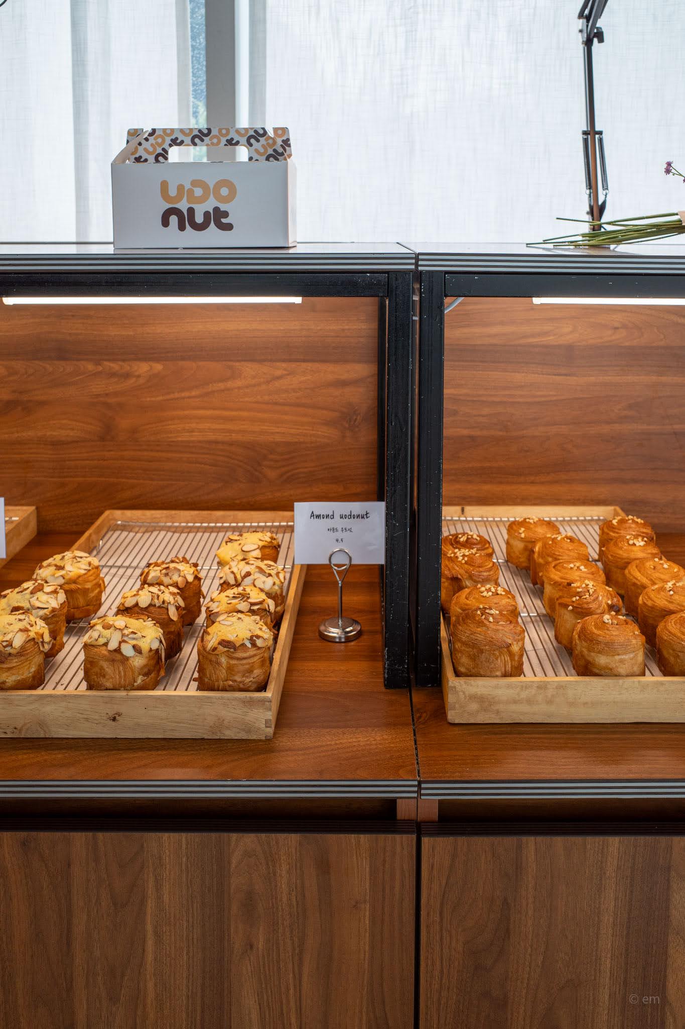 It’s a croissant, technically, or something close to one — laminated, layered, golden on the outside, with the distinctive coiled crown of a kouign-amann and a cream or filling pressed into the center. The UDOnut is the café’s signature item and a product of the park’s insistence on Udo-specific identity: the name collapses the island and the pastry into a single word. Flavors rotate but lean into the rich and slightly indulgent — pistachio with matcha cream, almond with flaked topping, caramel — each one sitting atop its individual wooden tray at the warm-lit counter. The takeaway boxes are well-designed. You will want one to take on the ferry.