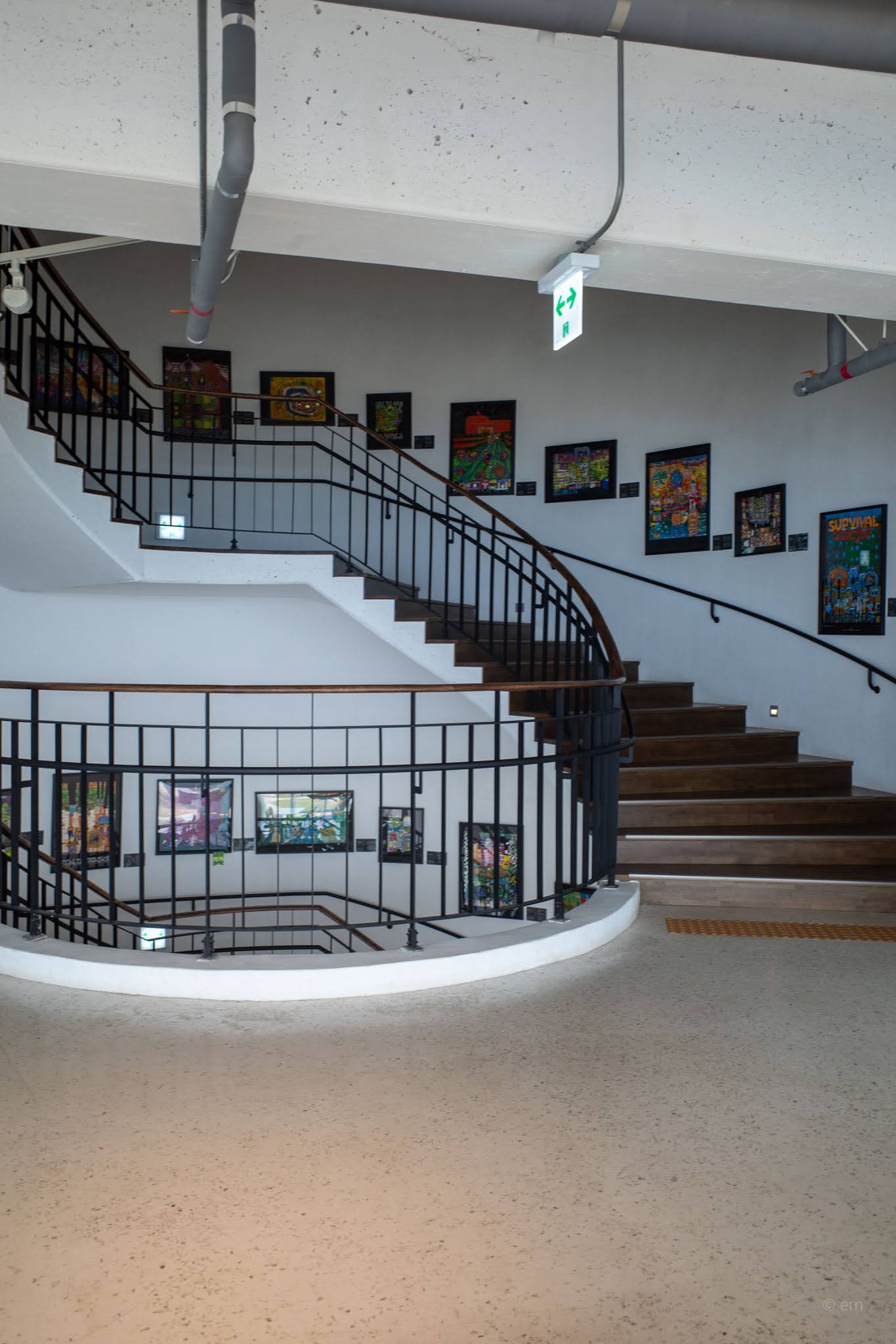 Sheer white curtains hang against the glass walls throughout, caught in the movement of the ventilation system — or perhaps just the building breathing — and they add a softness to the light that might otherwise read too cold. On the upper level, reached by a curved staircase whose walls are lined with Hundertwasser prints ascending in rows, more seating continues the same idea: bigger views, more altitude, the same ease. Inverted Hundertwasser artwork umbrellas hang from the upper ceiling in a long row, their painted surfaces facing down — saturated, busy, technically art — while the windows keep pulling the eye back to the grey-blue open water.