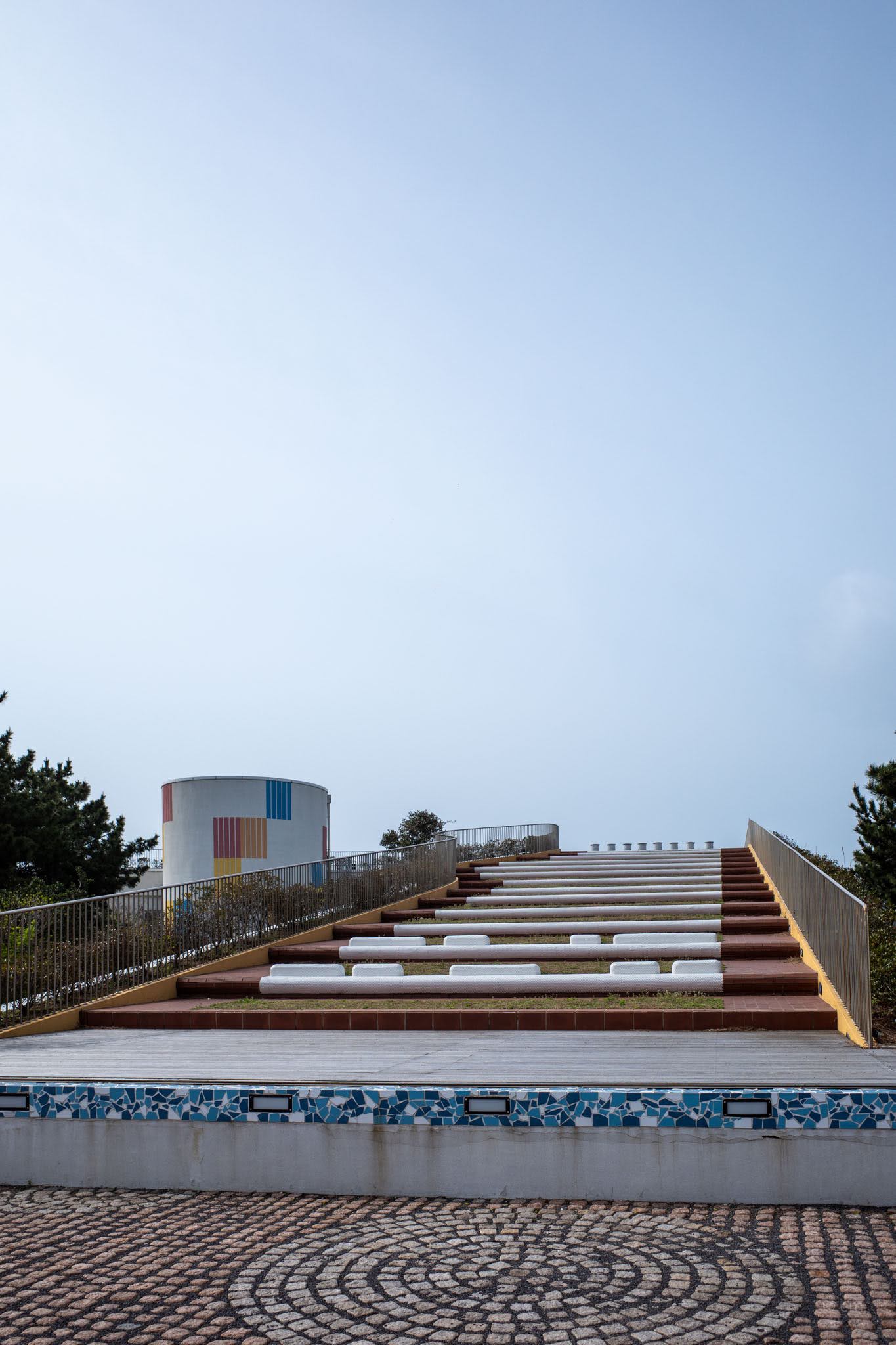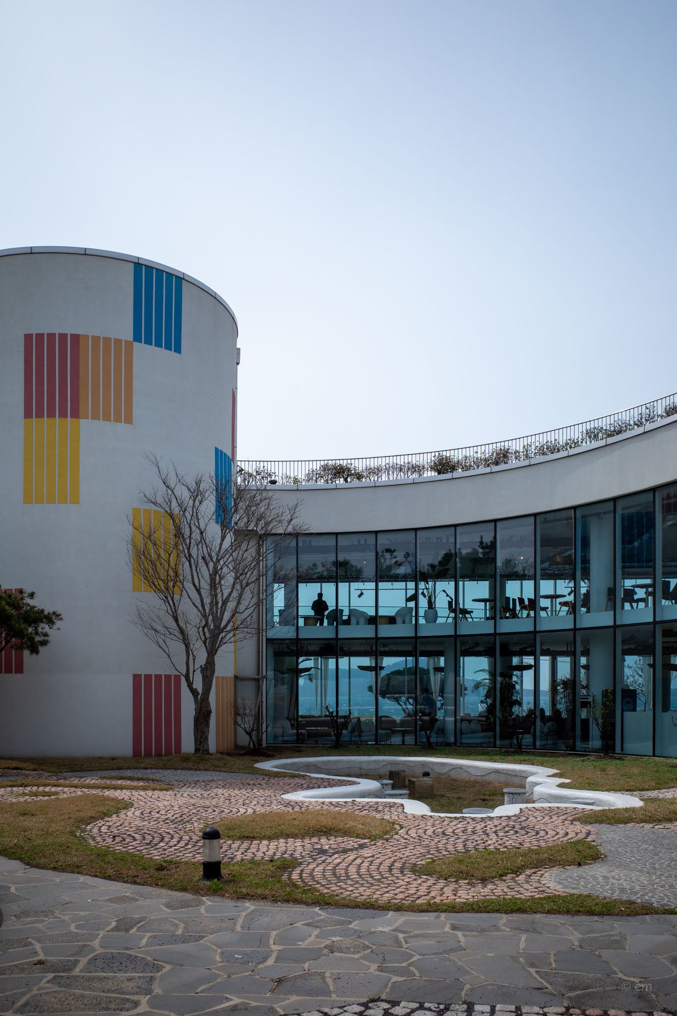 Seen from the cobblestone courtyard that connects it to the park, Hundertwasser Winds presents as a sweeping arc of floor-to-ceiling glass — two stories, curving around the hillside, its face fully oriented toward the sea. The attached cylindrical tower carries the only real decorative gesture on the exterior: a grid of vertical color panels in primary red, yellow, and blue, blocked against white render in a way that reads almost Mondrian. It’s a different visual language from the mosaic-and-dome expressionism next door, and it doesn’t try to reconcile itself with it. The green-planted rooftop terrace curves along the top. The building knows exactly what it is and where it’s looking.
