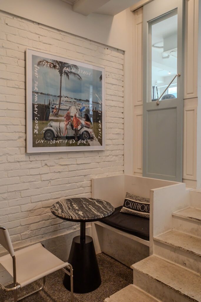 The ground floor interior, below the dining levels, held the rest of the concentrated Americana. Nearby, one of the photographs that appeared throughout the space — a Slim Aarons-style image of a convertible and glamorous figures at a Palm Beach marina, annotated in handwriting across the glass: 1950s. Palm Beach. Shot for Holiday Cover. Un-identified Port. Florida. — set the visual key for everything Califhouse was doing. West Coast money. Old photographs. The dream of America as a lifestyle.
