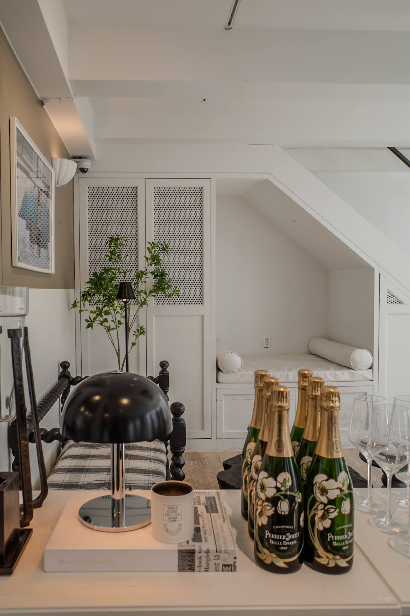 Throughout the space, the furniture followed a consistent vocabulary: bobbin-leg pieces in both black and white, plaid upholstery on banquettes and sofas, boucle fabric on occasional chairs. A Roman bust wearing a black satin ribbon appeared on a dark marble column in the lower room. Perrier-Jouët Belle Époque bottles were arranged on a counter as decoration, their painted floral labels catching the light. Coffee table books, a mushroom-cap table lamp, wine glasses set out on long communal tables — the space was styled rather than designed, dense with objects that each wanted to say something about a particular kind of California life.
