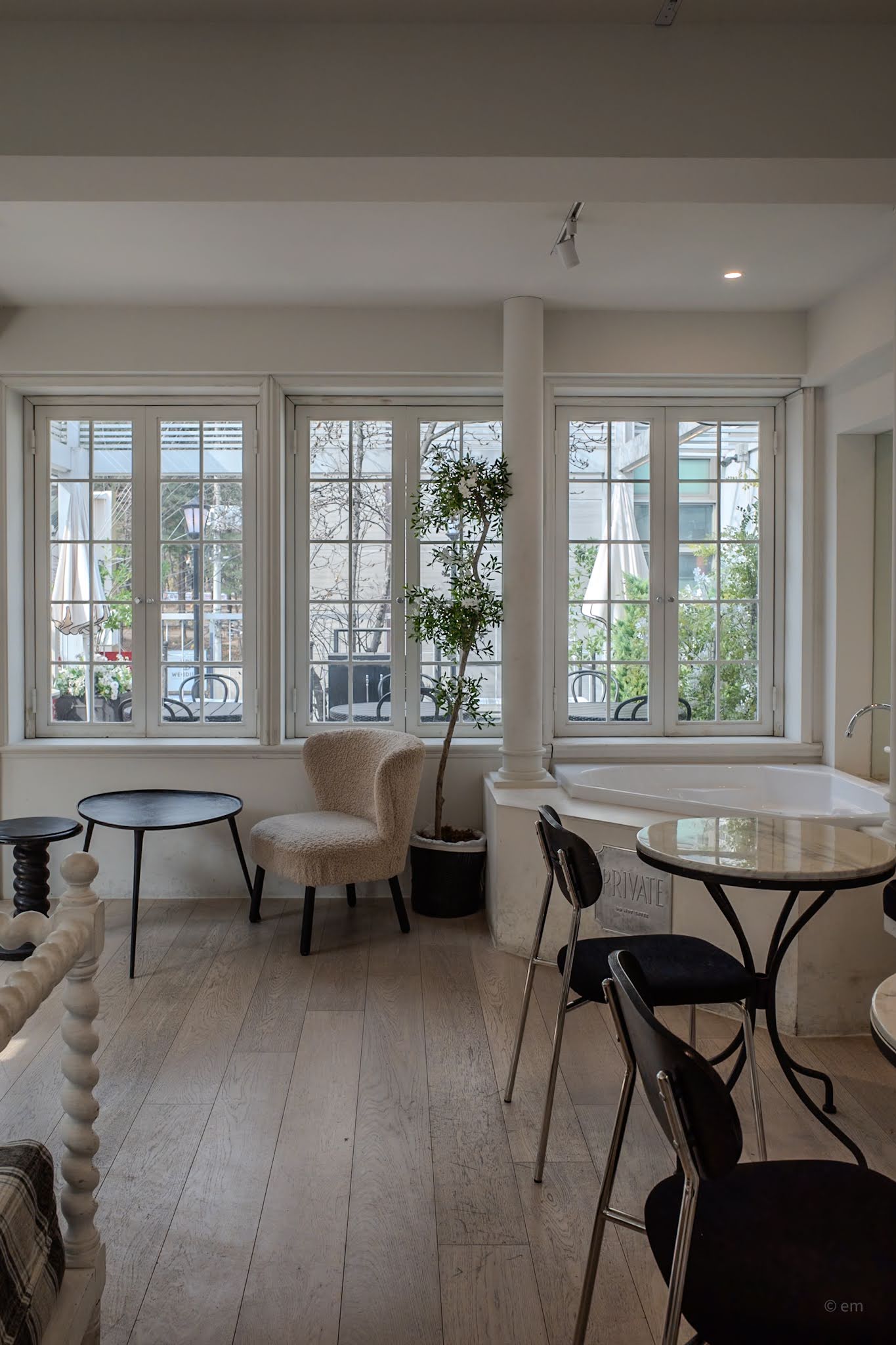 The second floor, facing the street, felt the brightest, light pouring through tall white-framed windows that looked out over the rooftop terrace and the neighborhood below. Plaid curved banquettes lined one wall; boucle armchairs faced low white-topped tables on chrome pedestals. A framed chalkboard sign on the wall read Happy Birthday in cursive, permanently staged for the venue packages the café advertised — private birthday brunches, bridal showers, parties. Elsewhere on the same floor, a corner bathtub built into the floor was labeled with a brass plate: PRIVATE. It was not a working bath. It was a prop, or an aspiration, or a joke — depending on how you read the room.