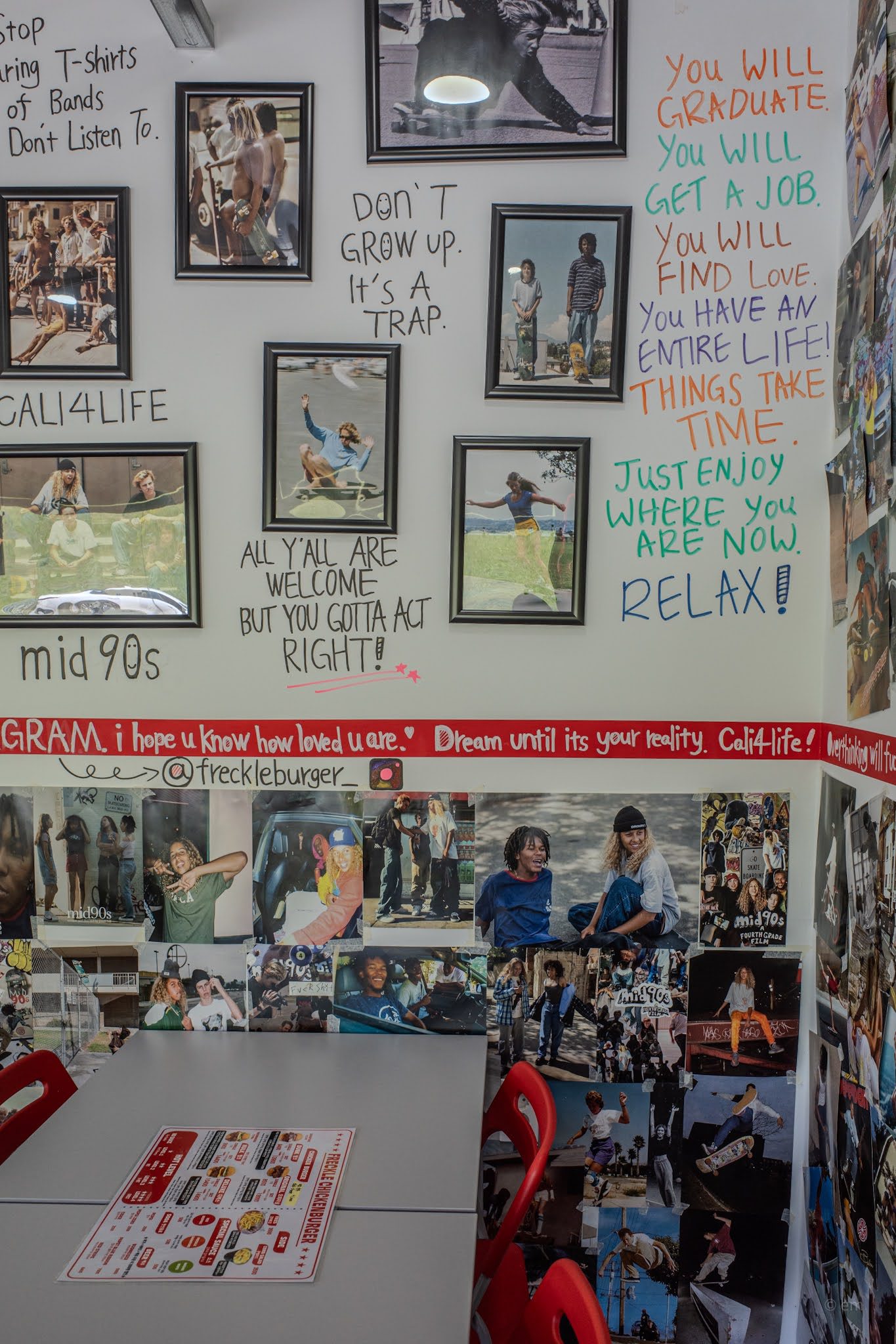 The quotes on the walls aren’t random. They tell a consistent story: slow down, be yourself, enjoy where you are, stop performing for social media, you have time, things take time. Written in the colorful marker handwriting of a high school art room: