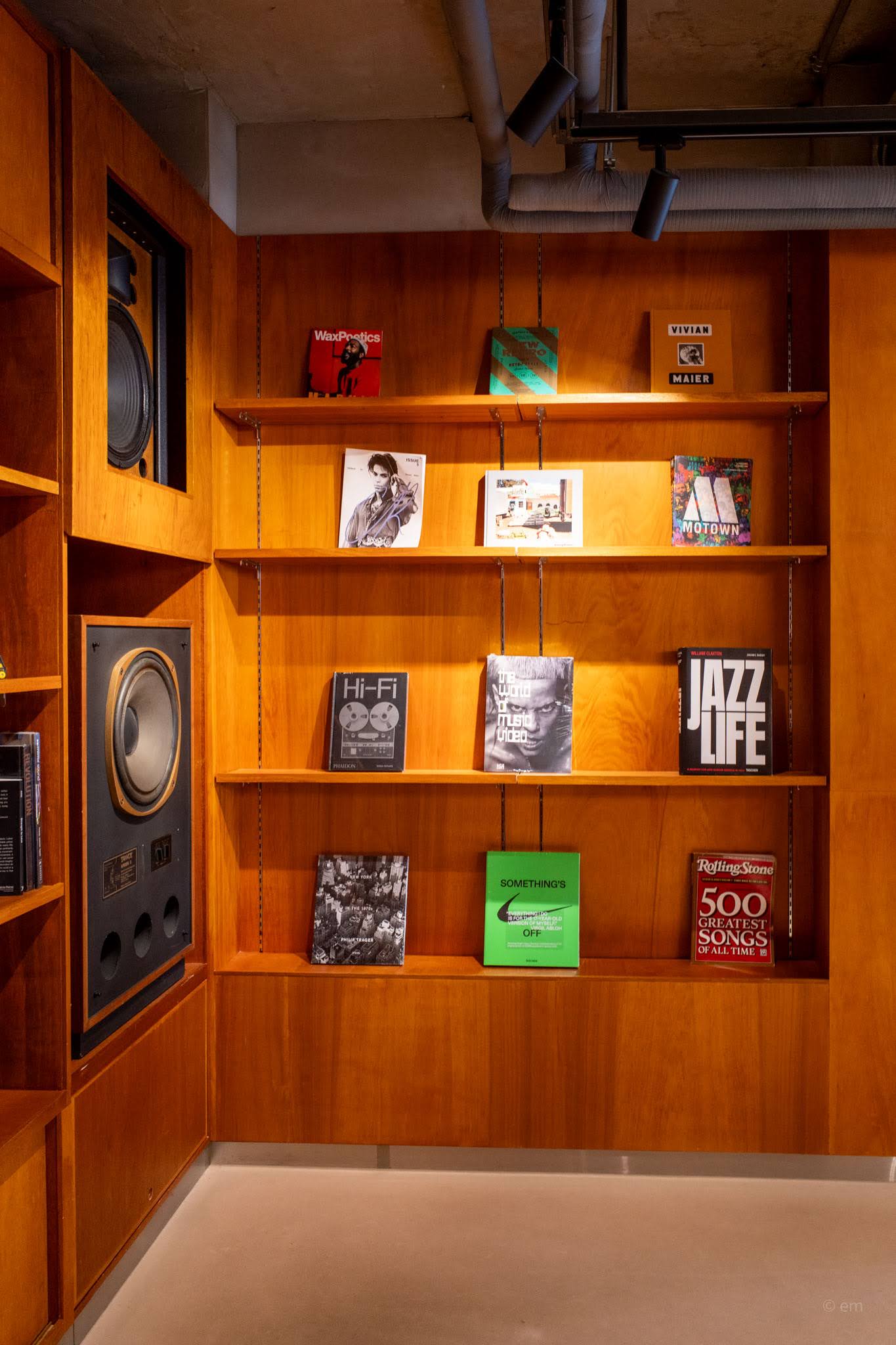 One of the most memorable corners of the building is the second-floor vinyl lounge. Wood-paneled walls are lined floor to ceiling with shelves displaying record albums — Marvin Gaye’s What’s Going On, Miles Davis’s Kind of Blue, The Beatles’ 1962–1966, Adele, Daft Punk, and more sit alongside vintage stereo equipment: tape decks, amplifiers, turntables, and a massive freestanding speaker. 45rpm singles are pinned to the wall. A turntable and mixing setup occupies a dedicated desk.