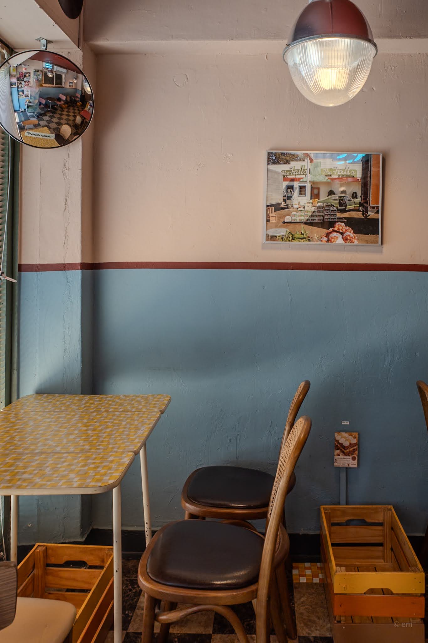 Inside, checkerboard tiles, a terracotta ceiling lined with vinyl records, and walls split in two — dusty blue below, warm beige above — hung with photographs of American roadside gas stations and desert garages. The furniture was diner-era mismatched: bentwood cane chairs, a red formica table, houndstooth stools on chrome pedestals. Globe pendant lights in rust-red caps. A convex mirror in the corner reflecting the whole room back on itself.