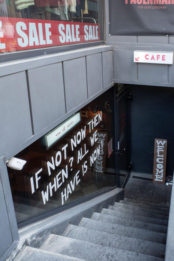 There’s a staircase in Mangwon-dong that most people walk right past. It descends below a clothing store, past a bold window painted with the words “IF NOT NOW THEN WHEN? ALL WE HAVE IS NOW!” — and at the bottom, you step into one of Seoul’s most unexpectedly charming cafés. Welcome to Now or Never (나우올네버).