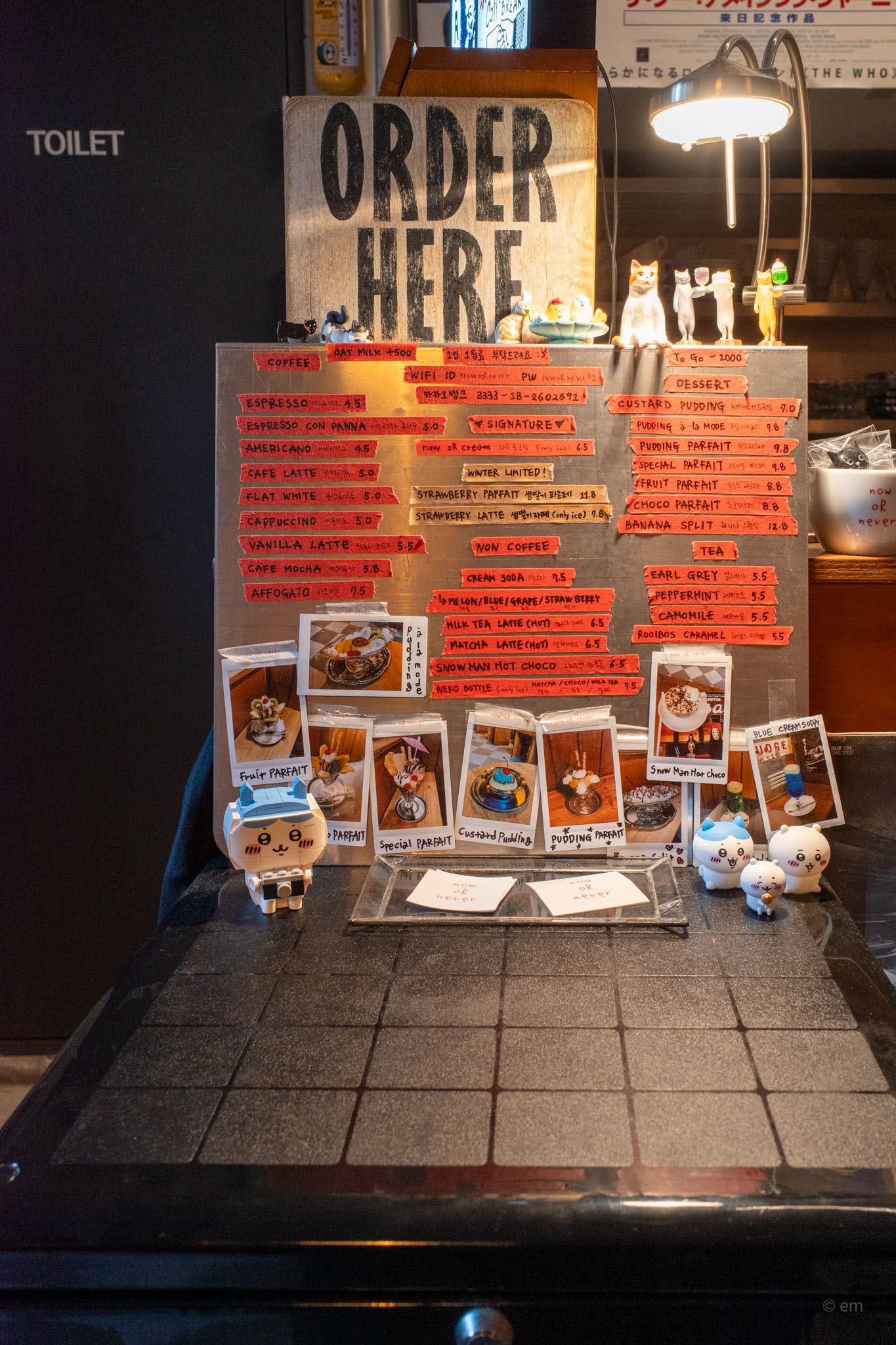 The menu board — a hand-labeled metal panel illuminated by a small desk lamp, surrounded by Polaroid photos of the drinks and desserts — is itself a piece of art. Tiny cat figurines and the café’s character toys are arranged across the counter.