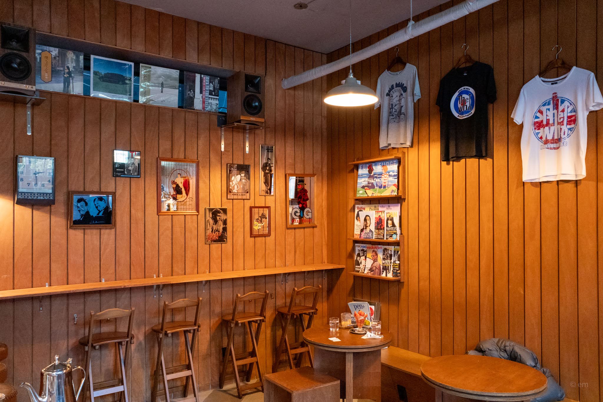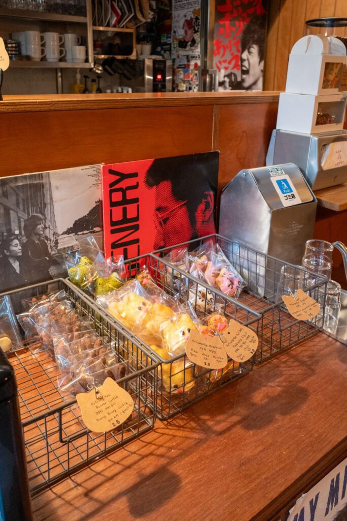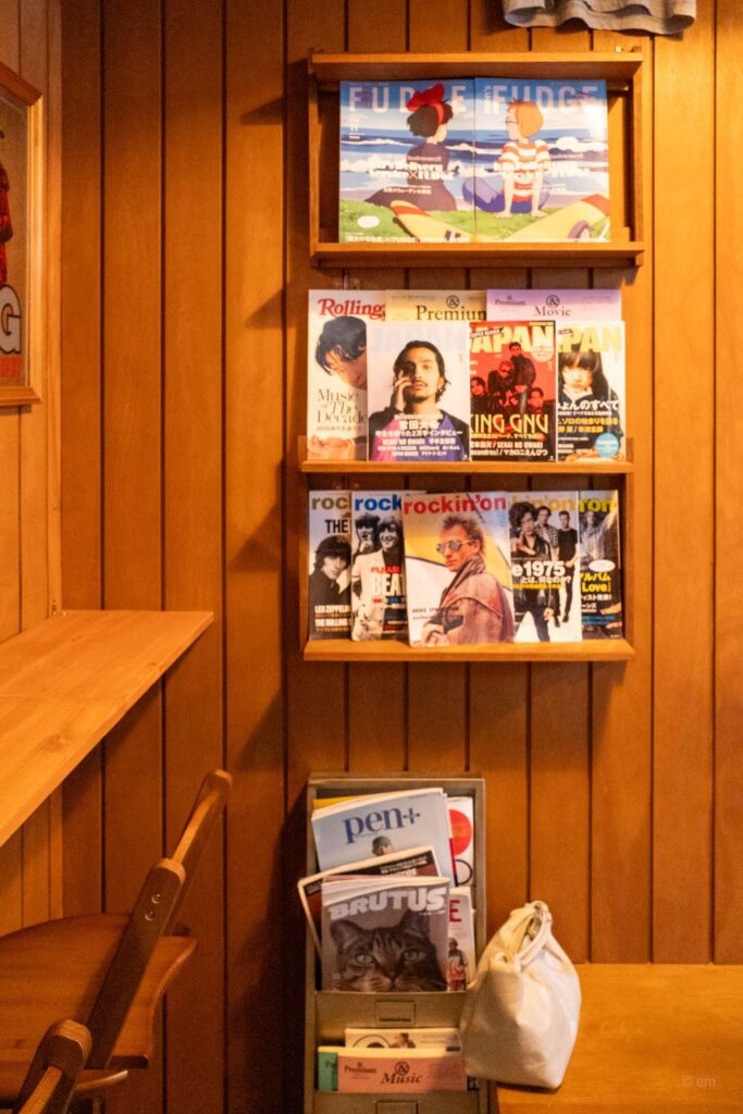 A wall-mounted shelf holds a curated selection of Japanese music and culture magazines: Rockin’on, Rolling Stone Japan, Fudge, Brutus, Pen+, and more. These aren’t just decoration — guests are welcome to browse. It’s the kind of place where you pick up a Japanese music mag from three years ago and end up spending an extra hour.