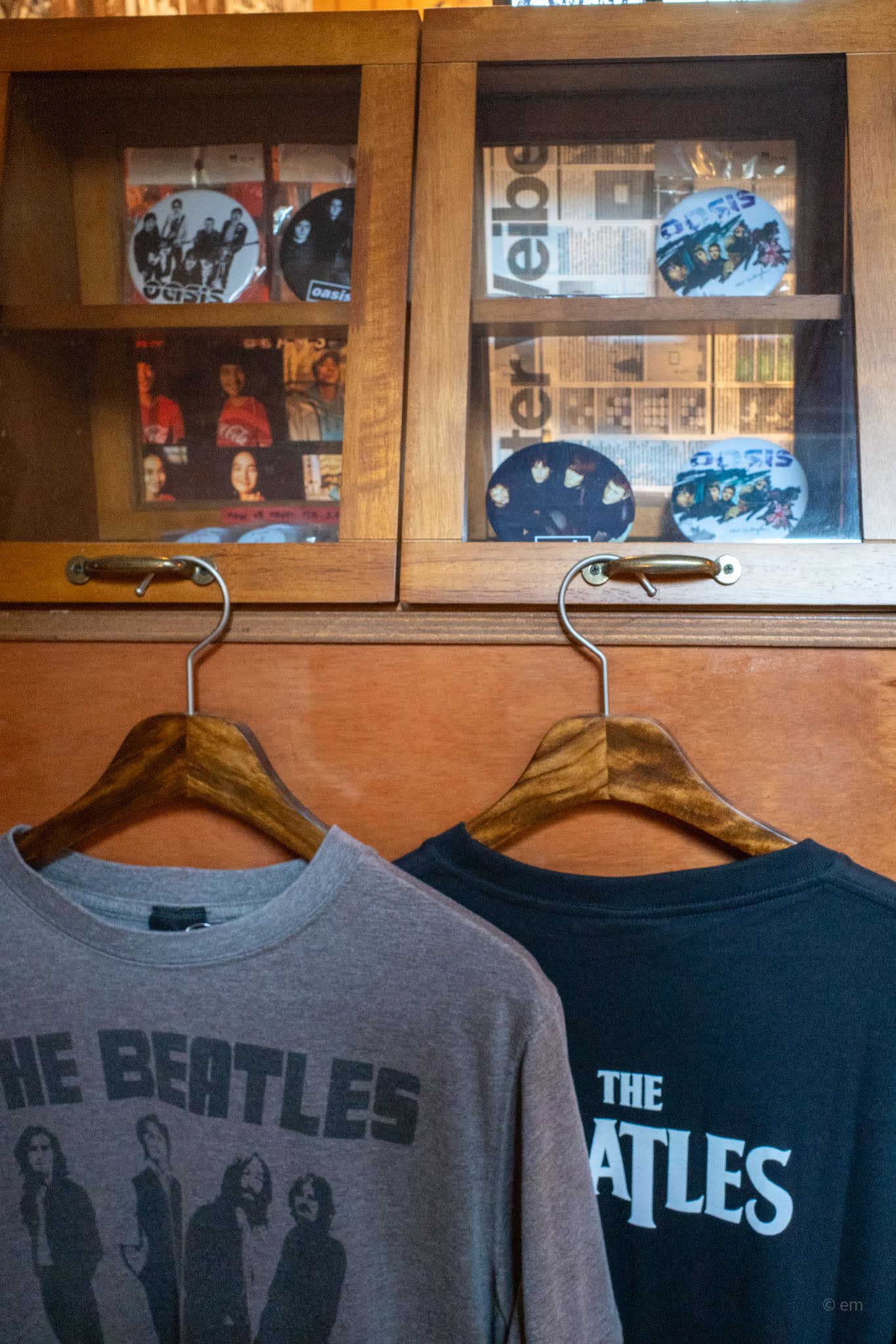 Near the counter, glass-fronted cabinets display Oasis pins, badges, and collectibles. It’s a small but well-chosen selection that feels like it was assembled by someone who actually cares.