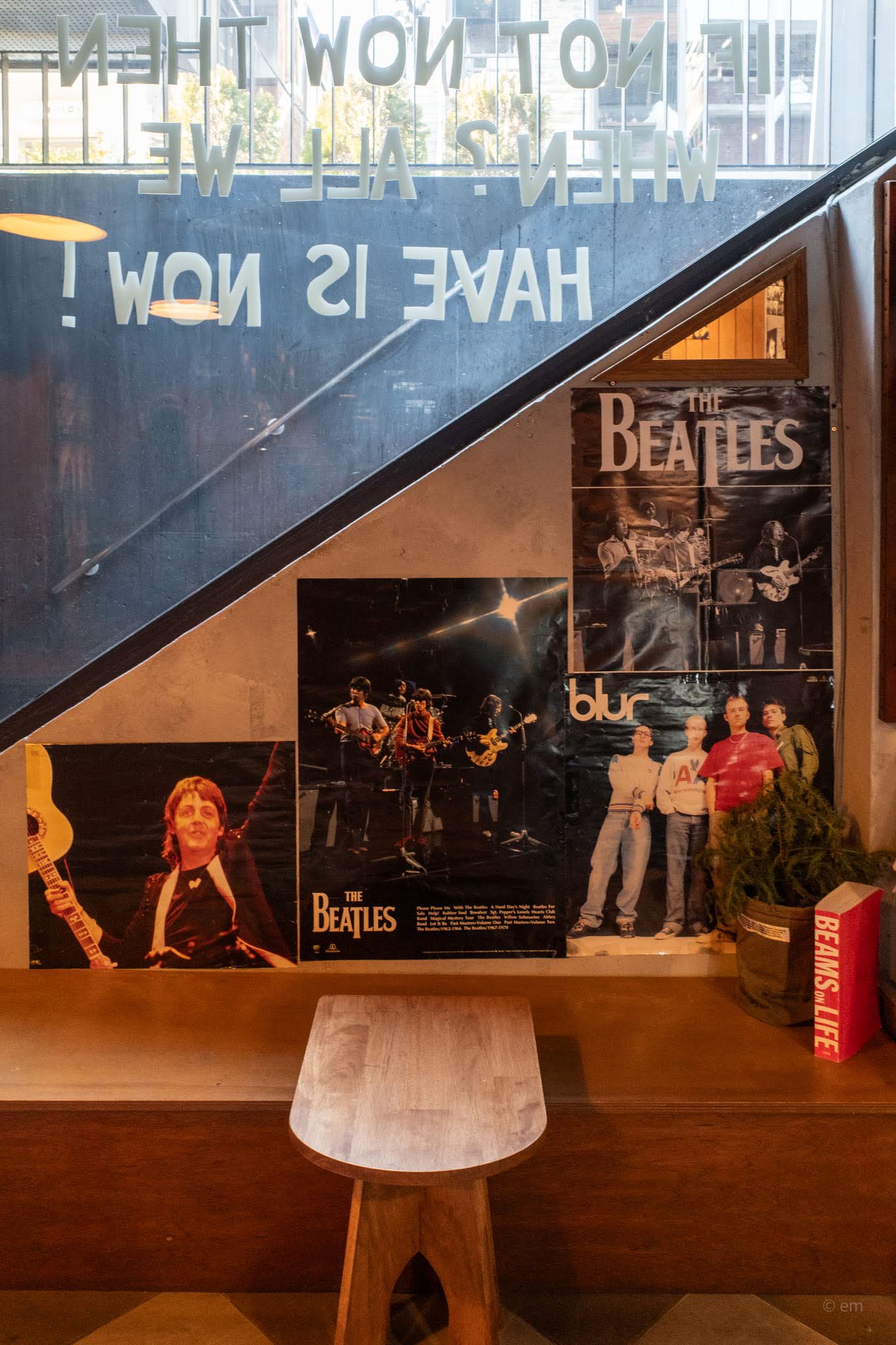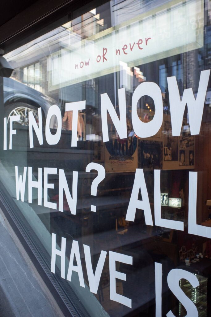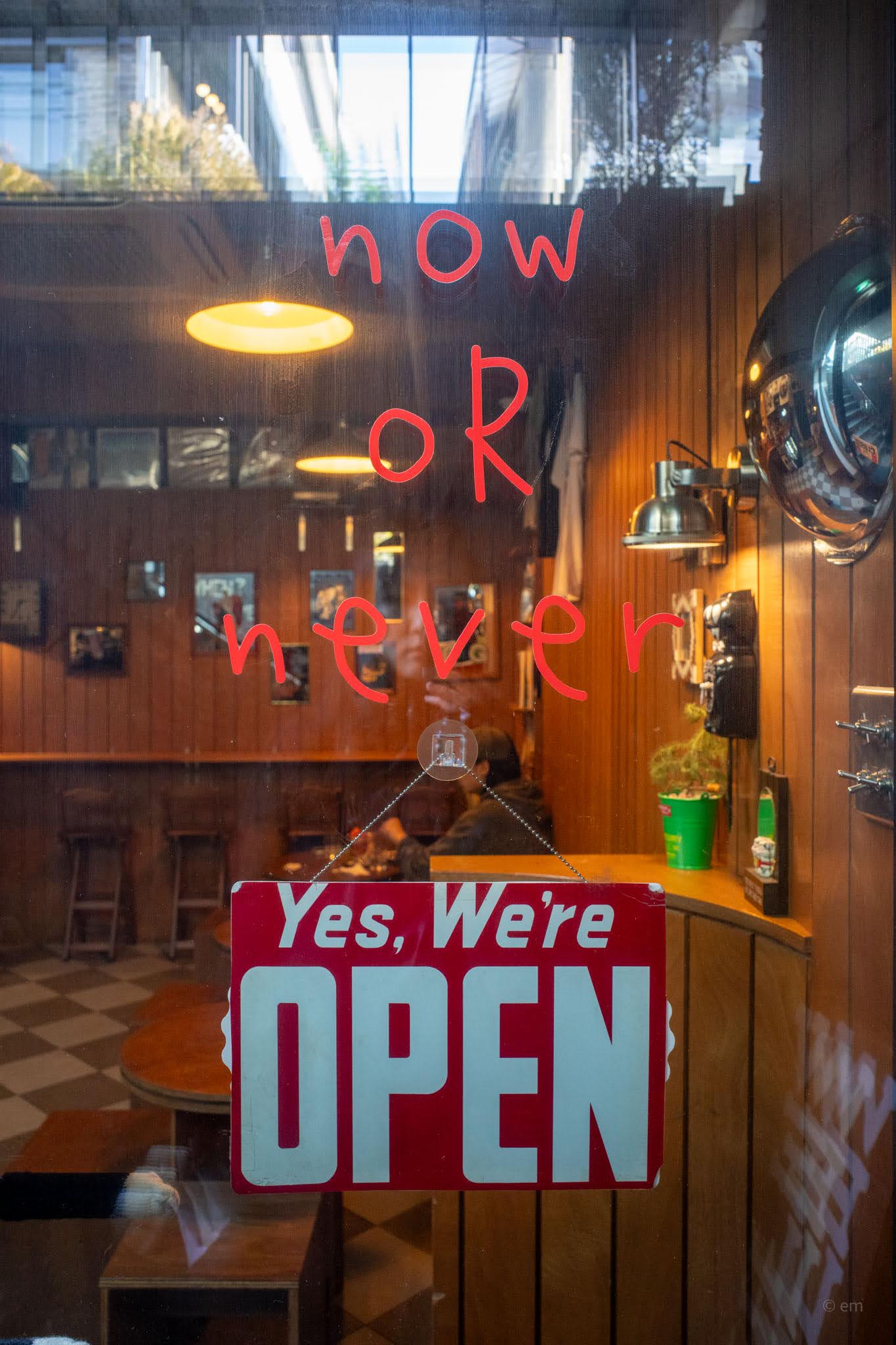 - The window text reads in reverse from inside — a nice detail that makes the “IF NOT NOW THEN WHEN?” feel like a message directed at whoever’s sitting in the café