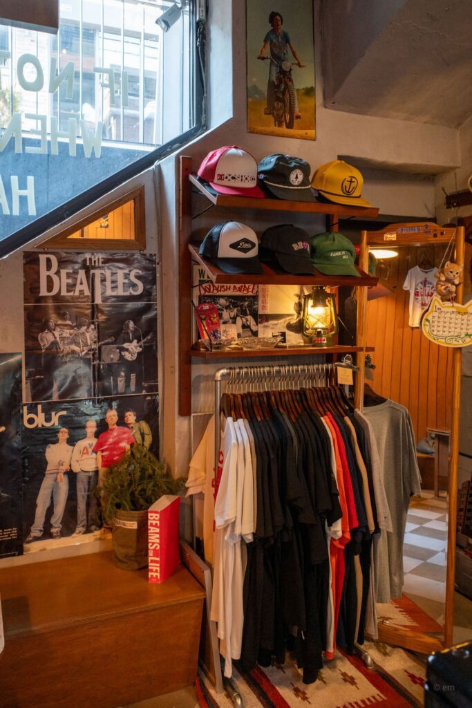 Band t-shirts hang on hooks throughout the space: The Who in three different styles, The Beatles in gray and navy. Trucker caps and snapbacks line a shelving unit near the entrance — labels like DC Shoes, various vintage-style caps with anchors and compass graphics, and more. A rack of band tees runs through the middle of the shop-café hybrid zone near the staircase.