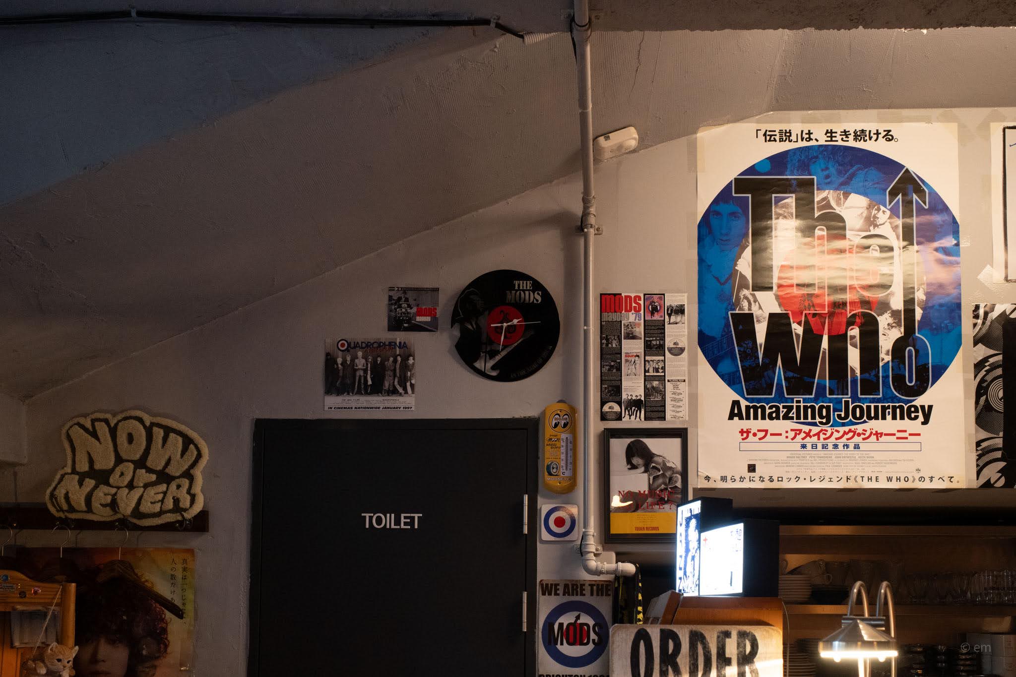 Posters line every surface: The Beatles, The Who, Blur, the Rolling Stones (Japan Tour 1990), and more. A large Japanese movie poster for The Who: Amazing Journey dominates one corner near the ceiling. Framed photographs of James Dean, Bob Dylan, and other icons of 20th-century cool hang scattered across the wood paneling. On one wall, a vinyl record has been turned into a clock face for The Mods. A Quadrophenia film poster peeks out near the bathroom door.