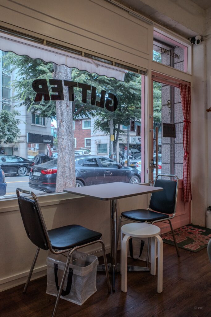 Weekends can get busy, particularly in the early afternoon. Arriving close to opening at noon or later in the day — after 4pm — tends to mean a shorter wait. The best photo spots inside are the tables along the main wall facing the yellow guitar and record collage, and the window seat with the reversed GLITTER lettering visible on the glass behind you.
