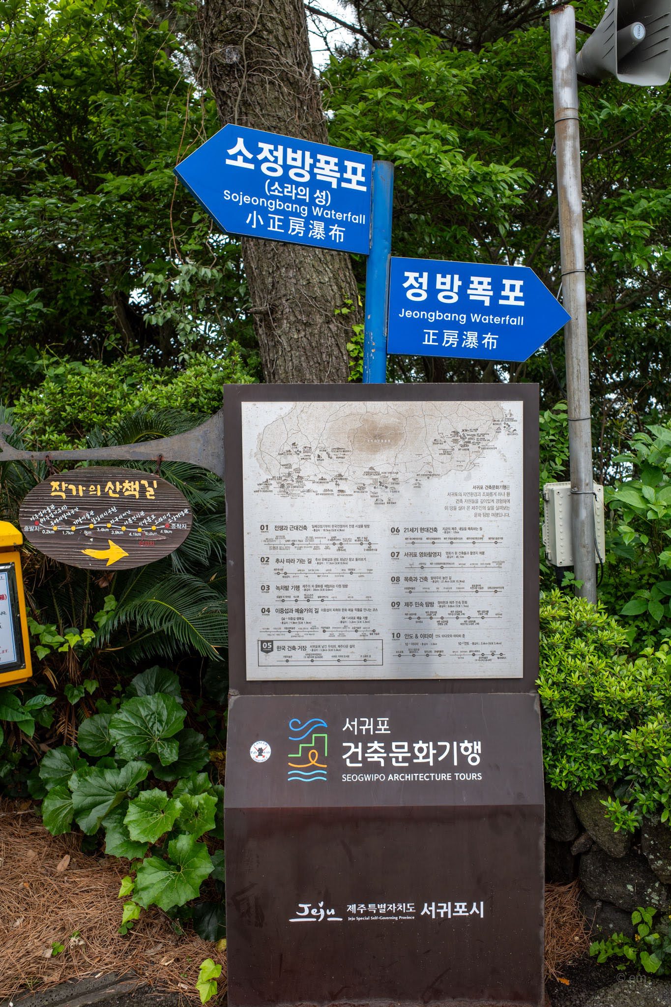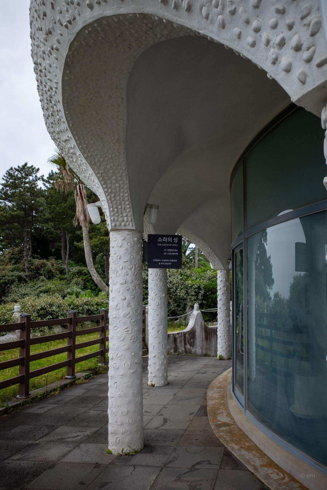 The Castle of Shell sits in a zone between two paid attractions — Jeongbang Waterfall and Sojeongbang — and is free. The building itself is free. The book café is free. There is no parking on site; use the lot at Jeongbang Waterfall and walk.